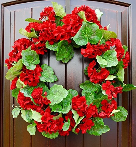 Red Geranium Wreath for Spring or Summer Front Door Decor in 21 Inch Diameter
