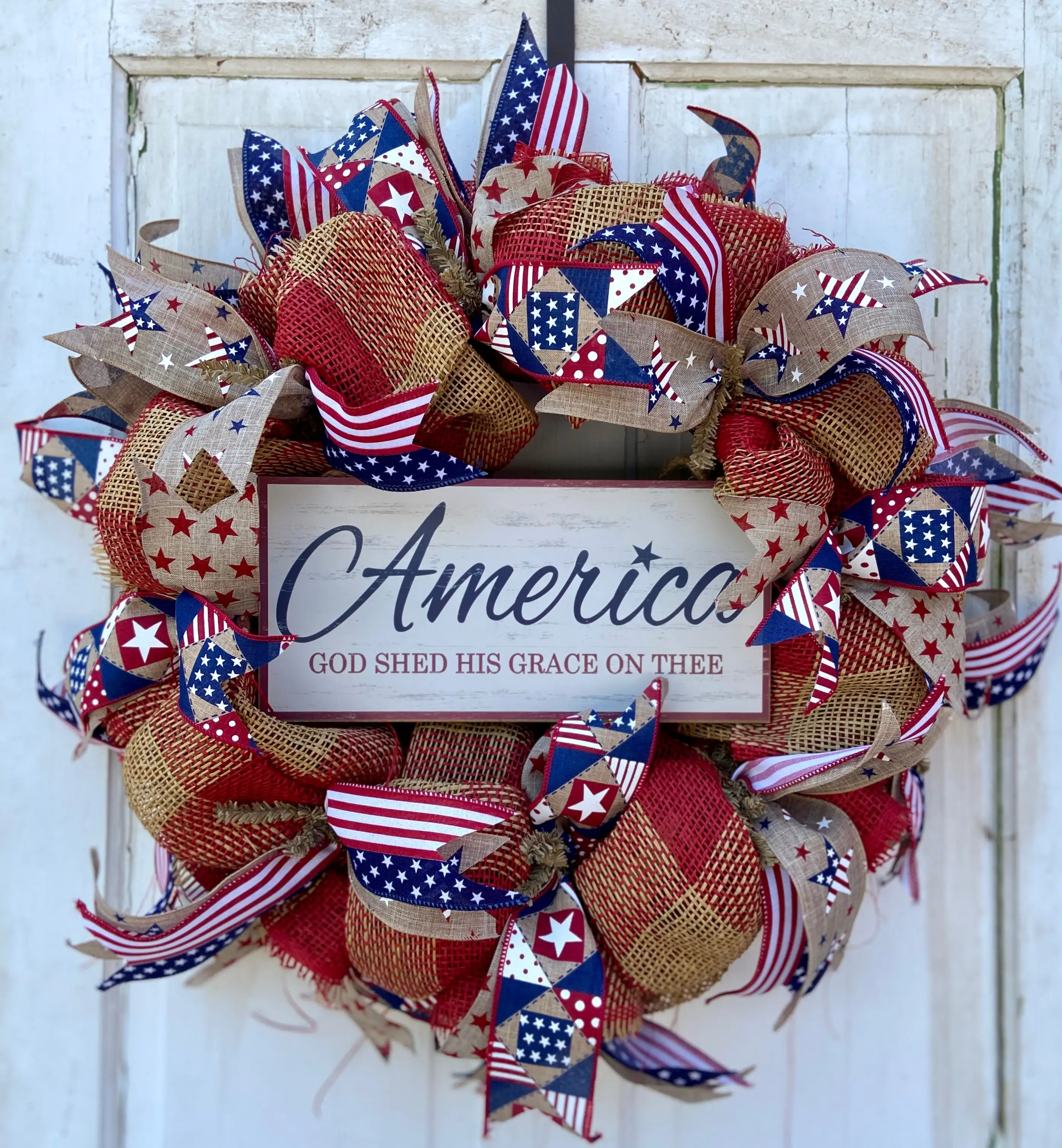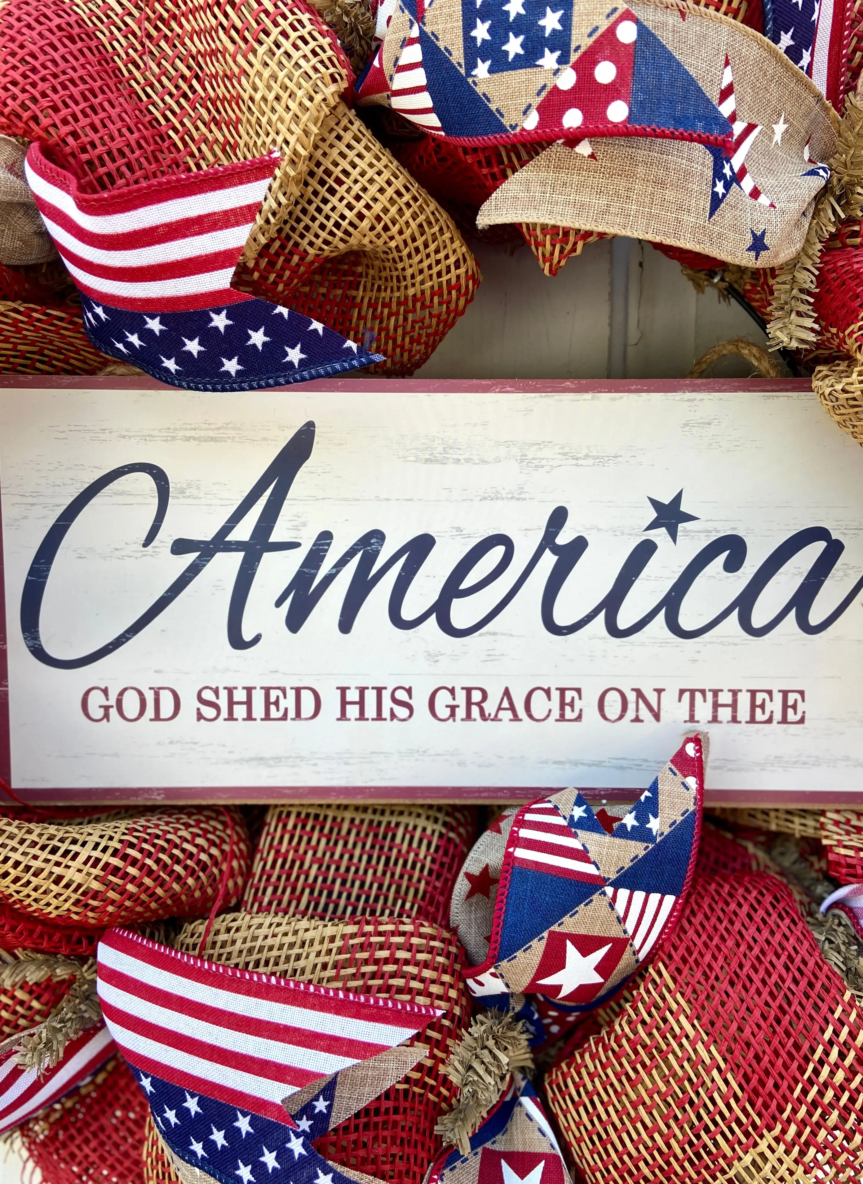 24" Diameter Patriotic Mesh and Ribbon Front Door Wreath for Spring and Summer, America Sign insert