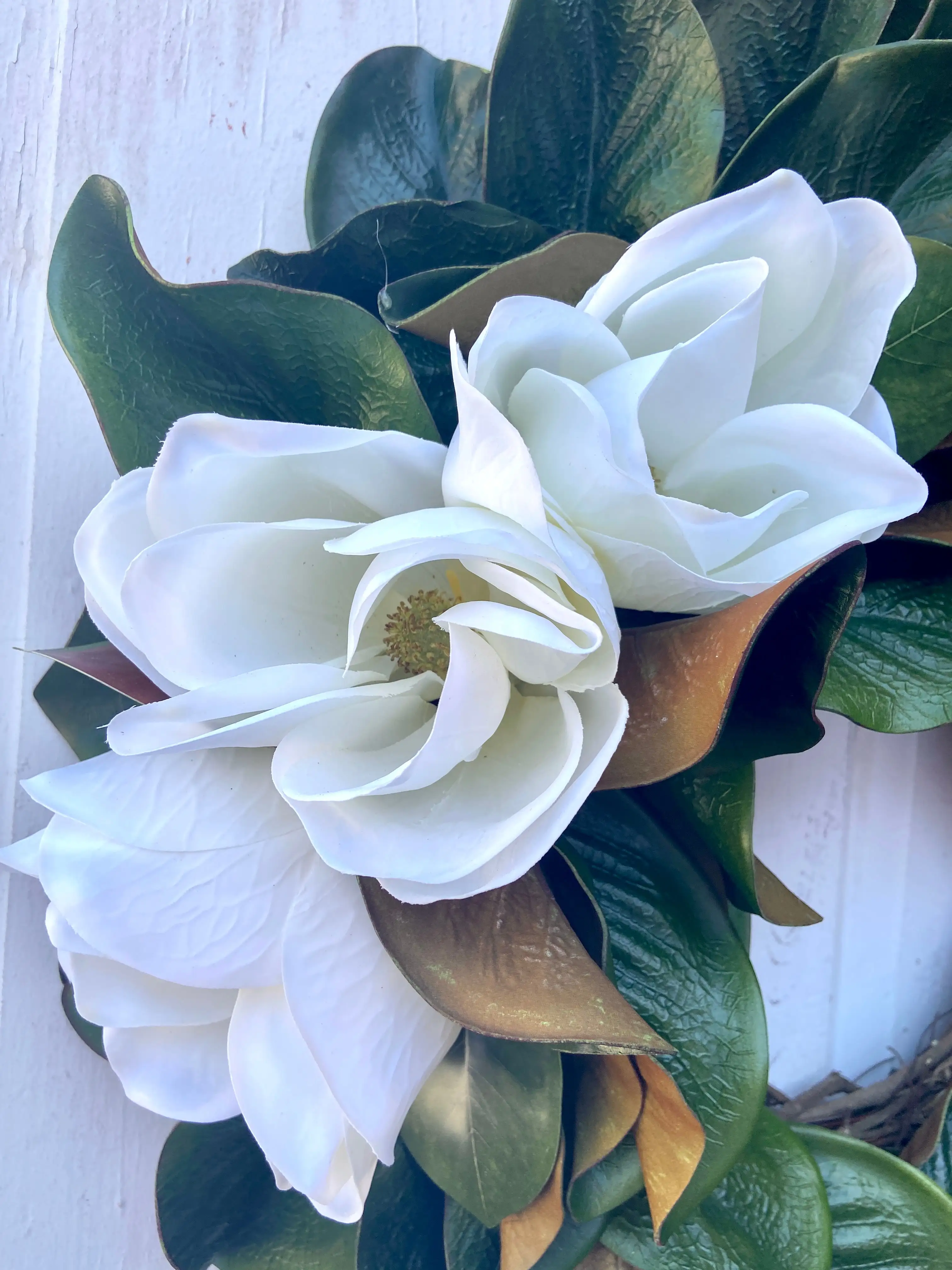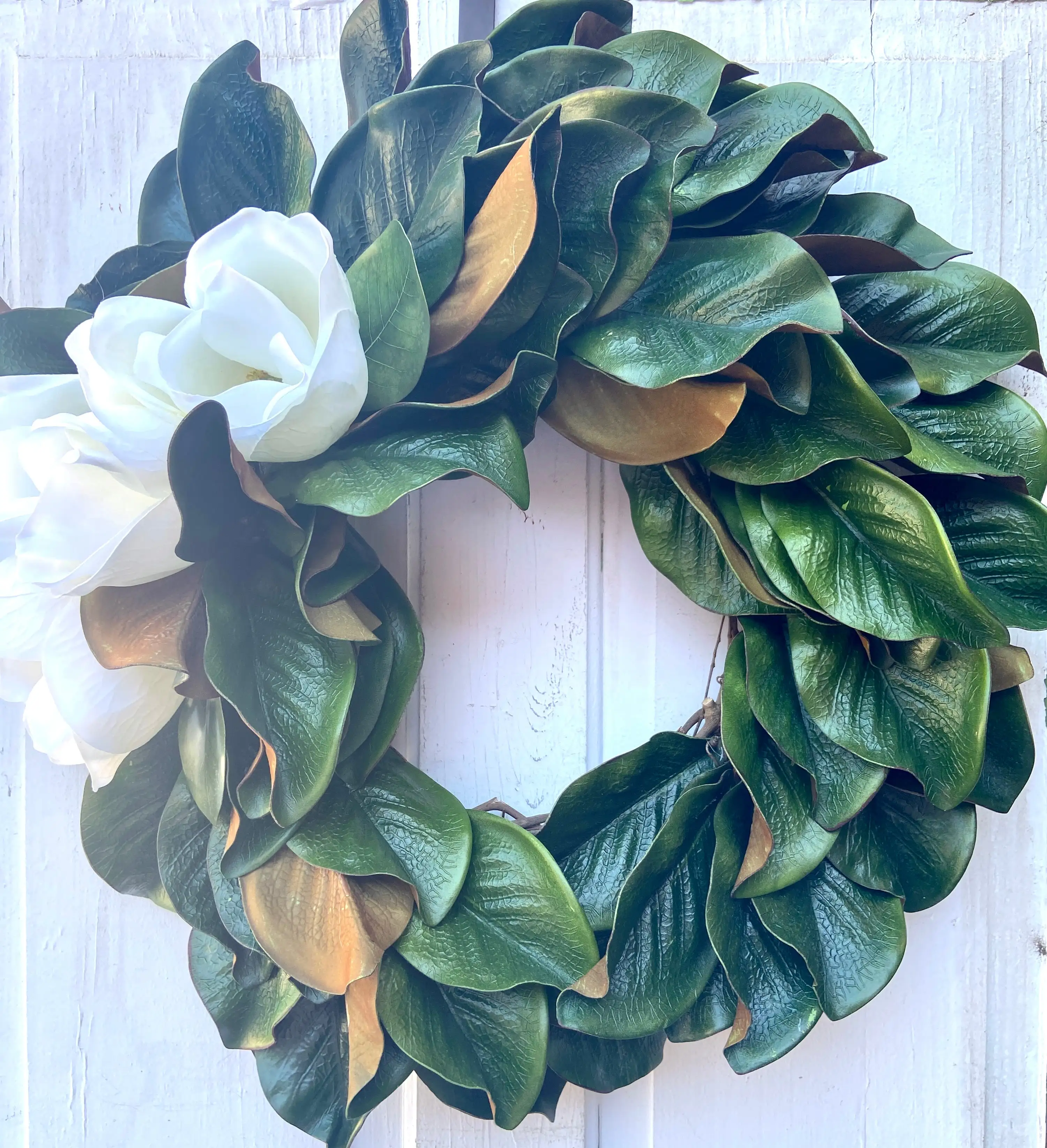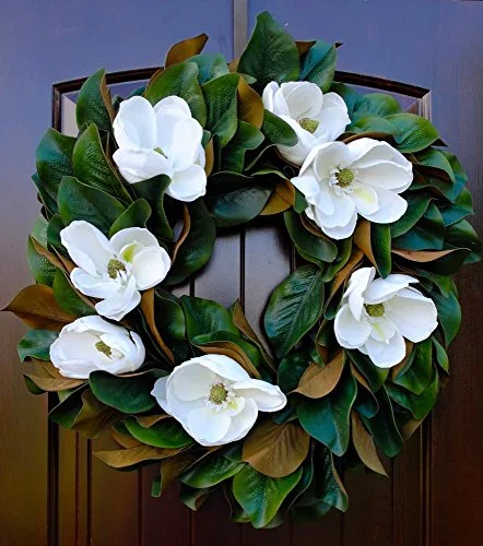 Southern Magnolia Wreath with Blooms and Leaves for Front Door Rustic Look-22-24 Diameter