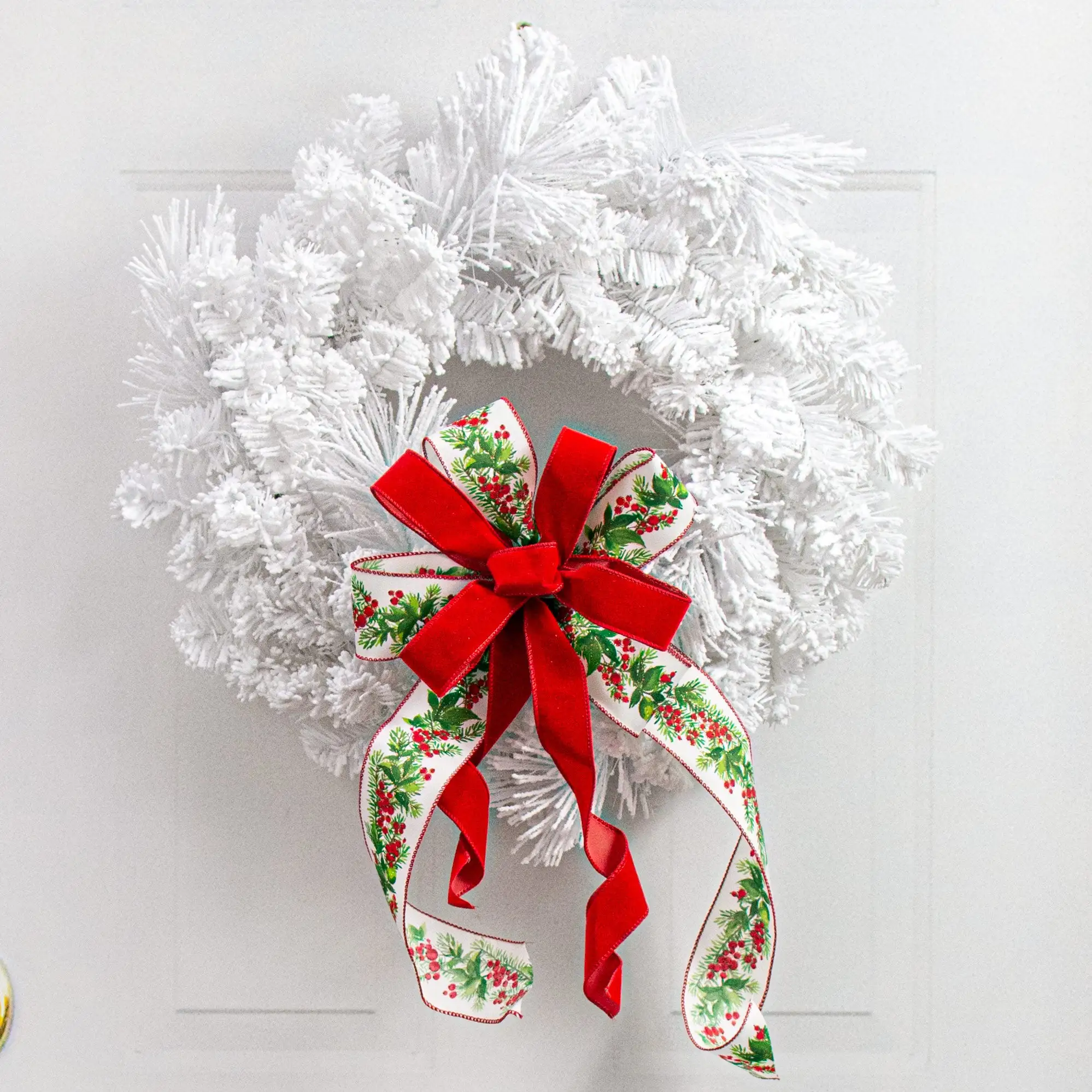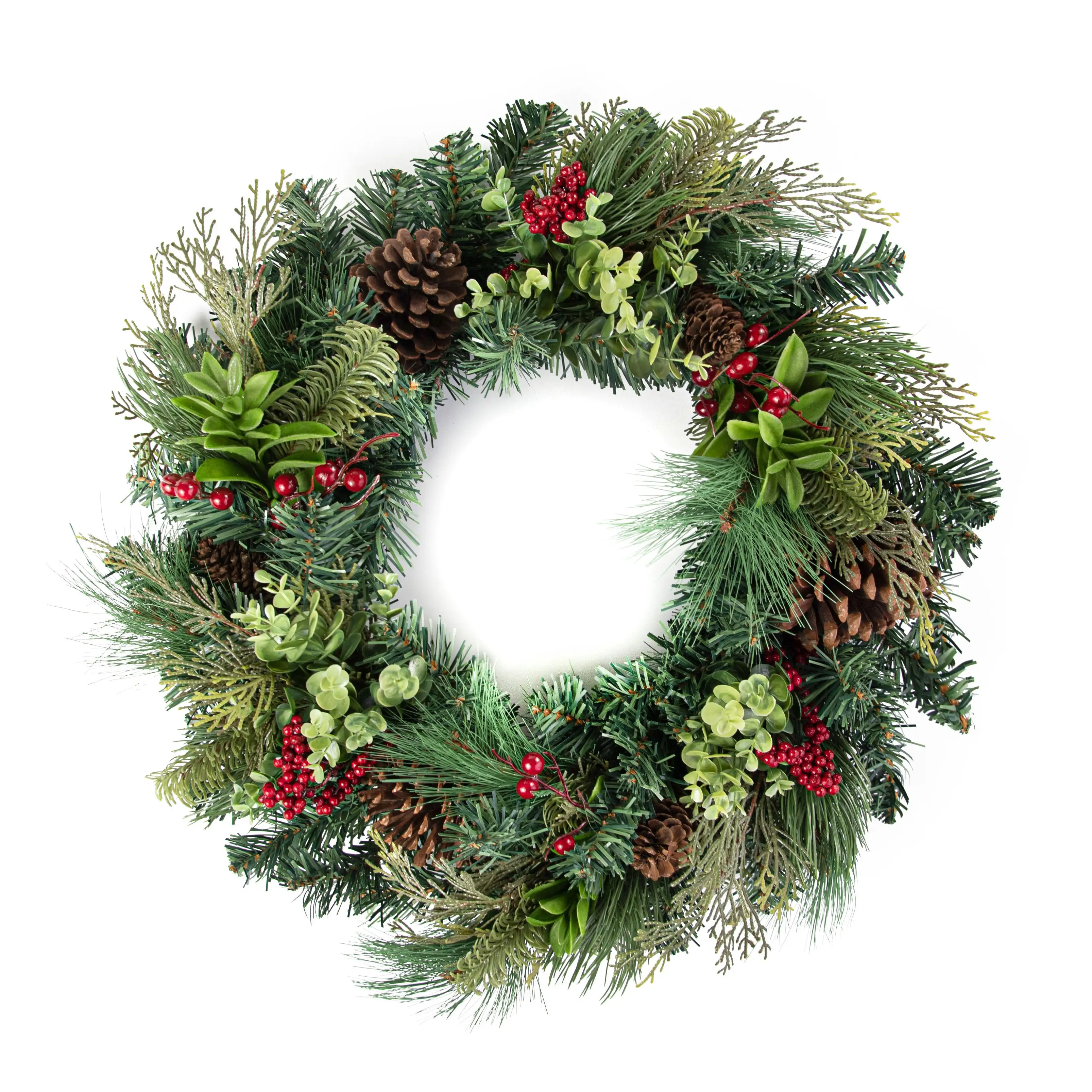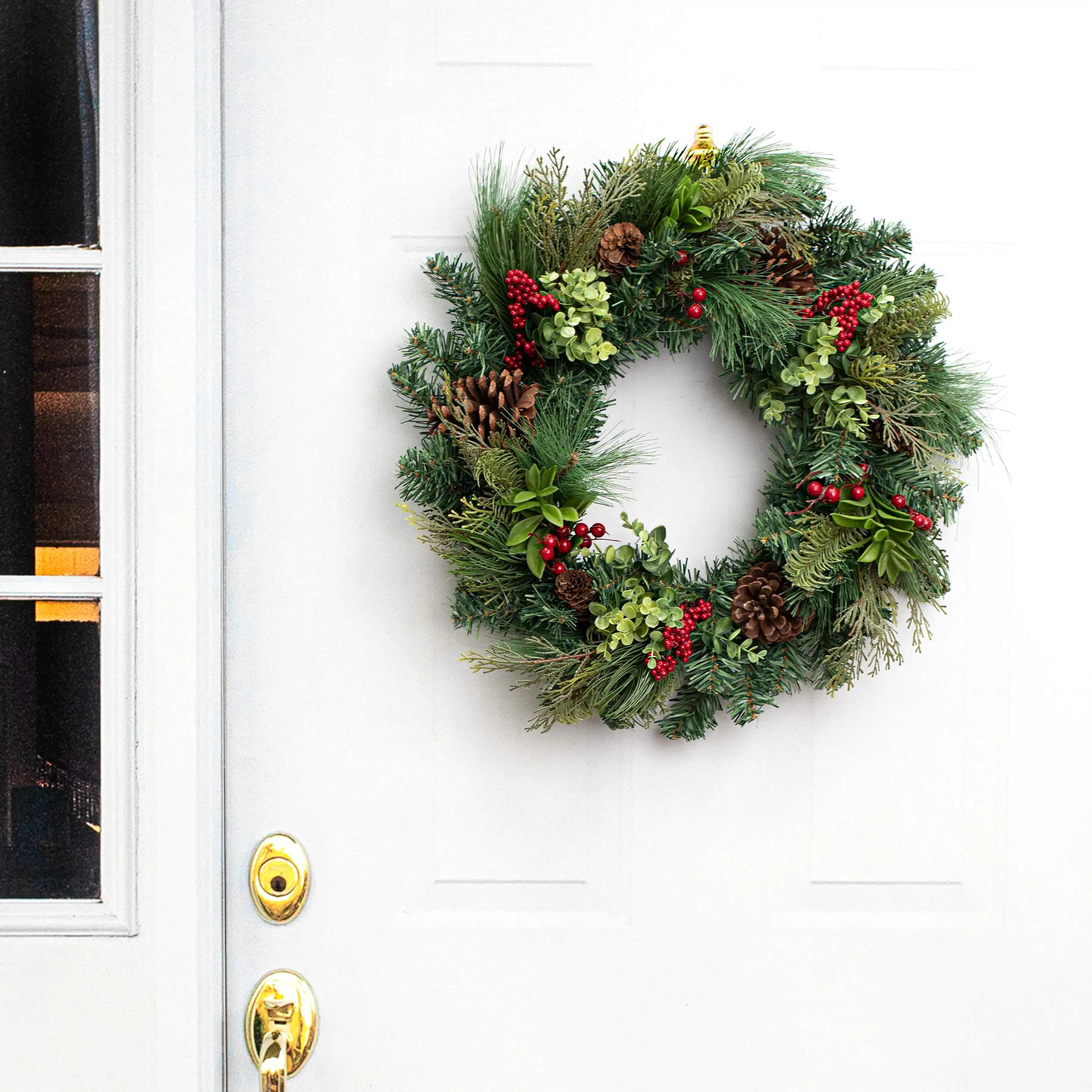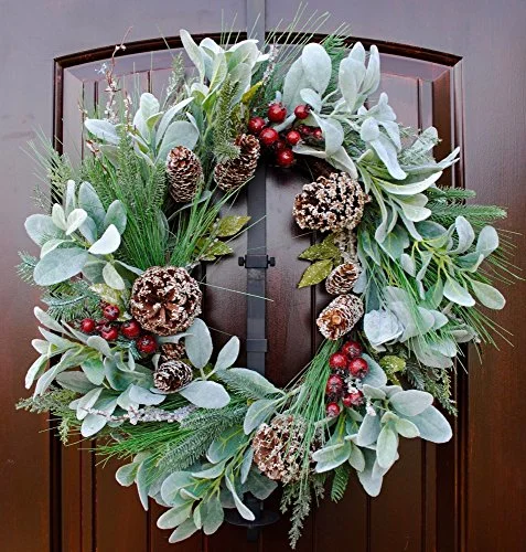 Rustic Country Christmas Door Wreath with Lambs Ear, Red Berries, Frosted Pine Branches and Pine Cones on Grapevine Base in 22" Diameter