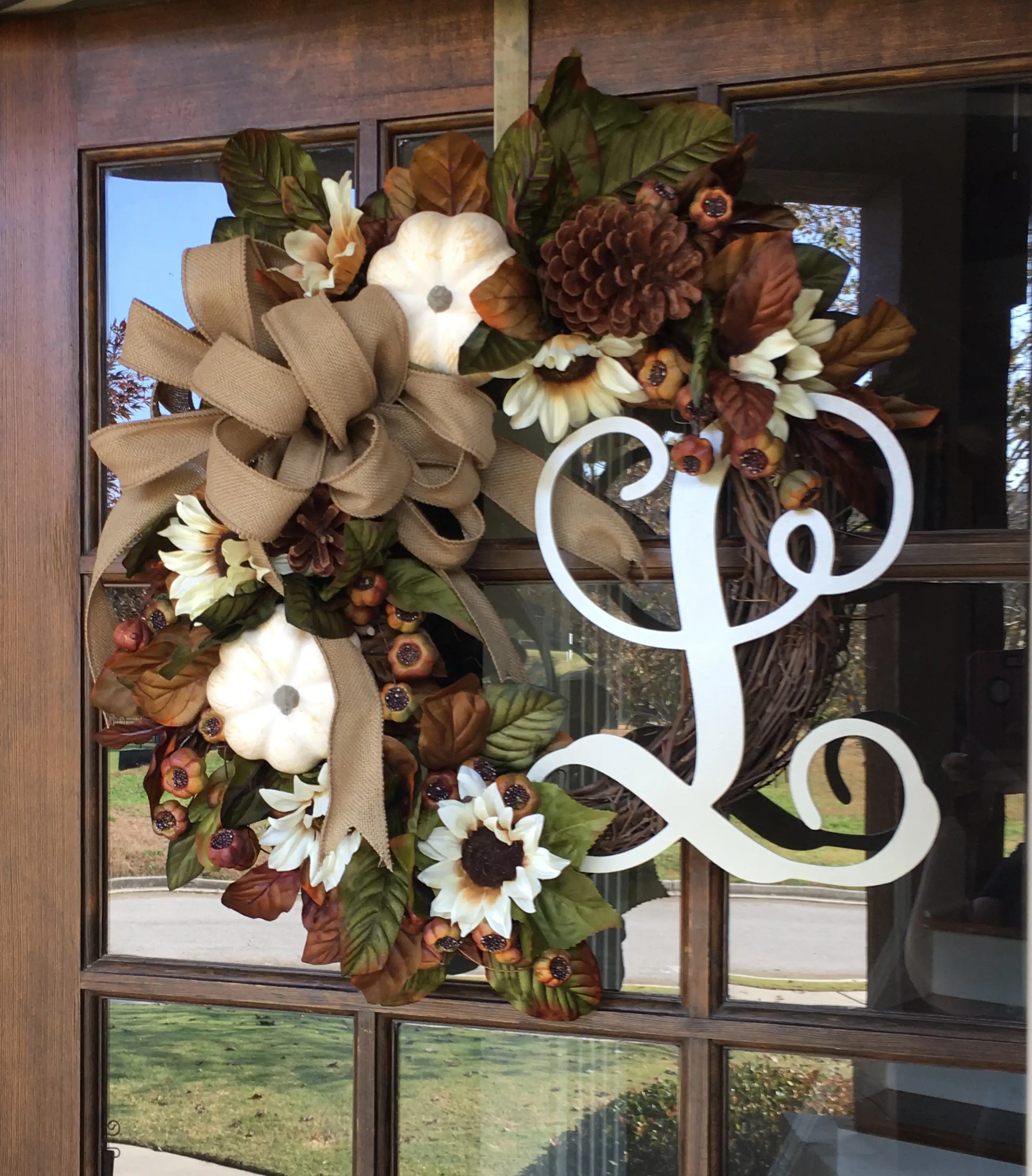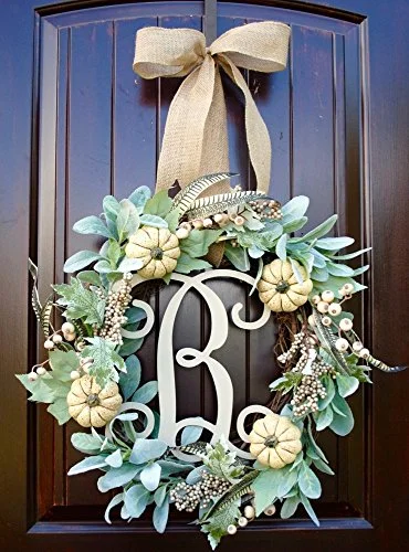 Fall Cream Pumpkin Monogram Wreath with Burlap Bow-Rustic Look 21-22" Dia