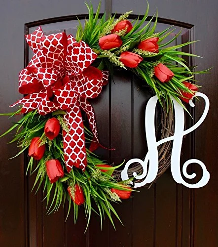 Red Tulip Front Door Wreath with Script Monogram for Door Decor-Mother's Day
