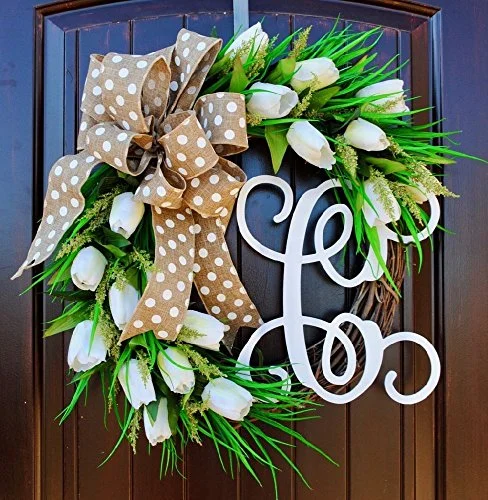 White Tulip Front Door Wreath with Script Monogram for Door Decor-Spring, Summer