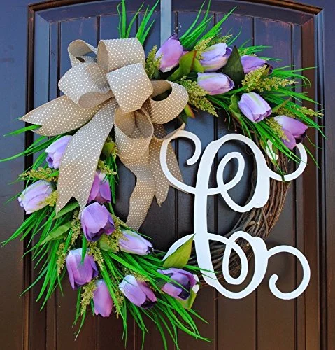 Lavender Tulip Front Door Wreath with Script Monogram for Door Decor-Mother's Day, Easter, Spring