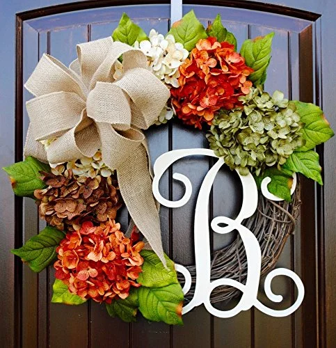Hydrangea Wreath with Monogram Letter Option made of Orange, Green, Cream, and Brown Hydrangeas with Three Bow Options on Grapevine Base