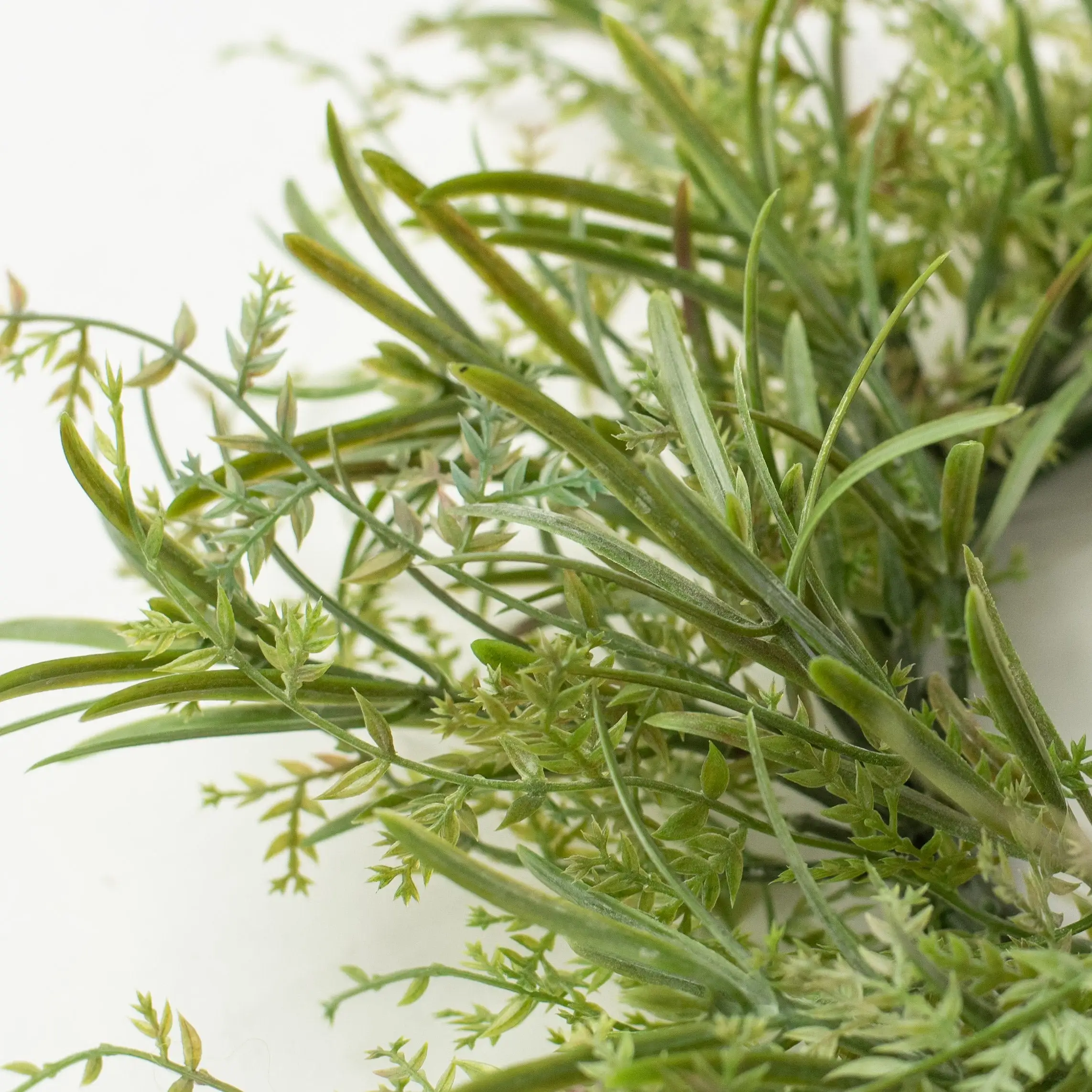 This candle ring combines a mix of wispy grasses in a light, grey-green shade. Made of plastic, it is both lightweight and waterproof. The central ring has a mold-formed hole for hanging if you prefer to use the ring as a miniature wreath.