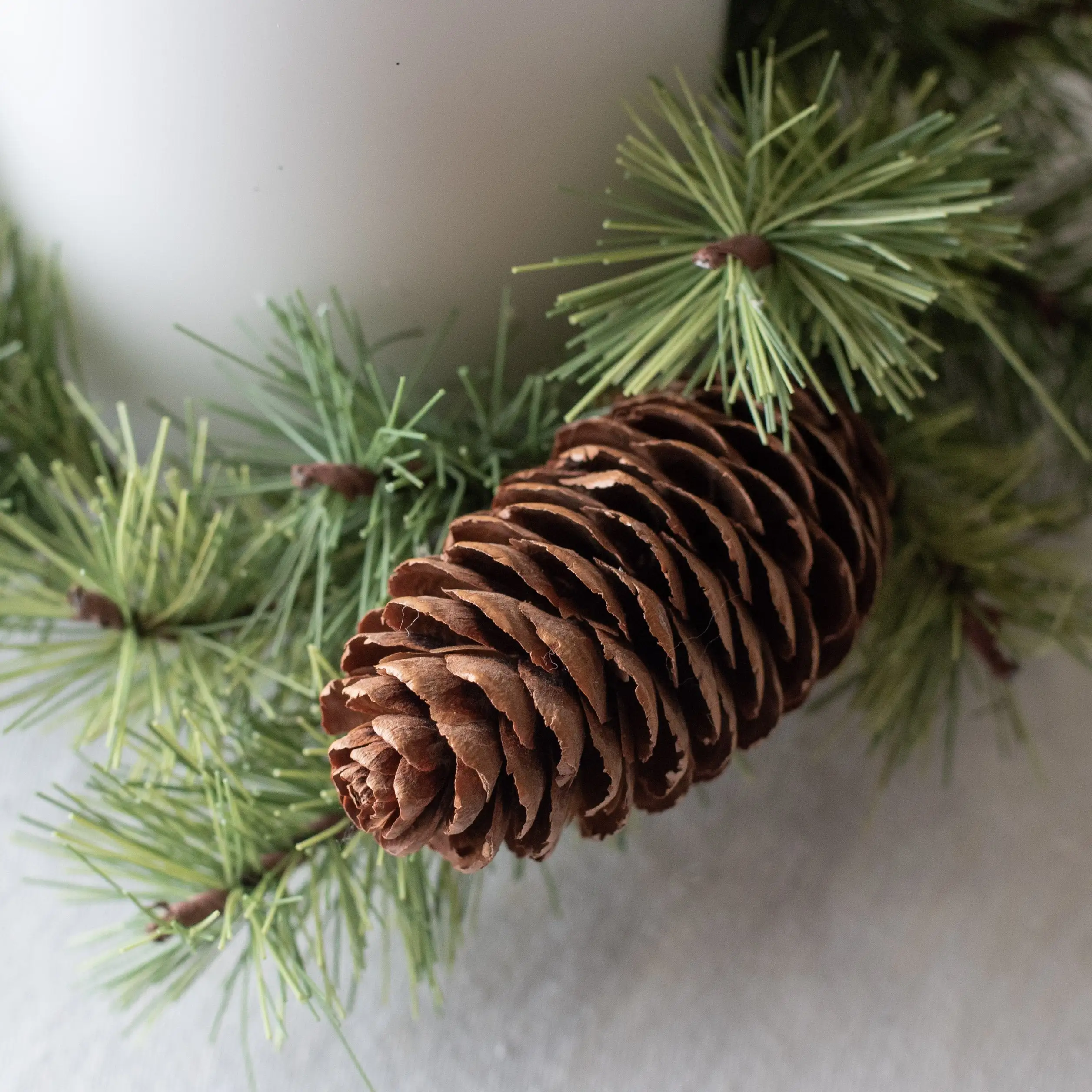 Use this pine candle ring to add a holiday touch to pillar candles, or hang it vertically as a mini Christmas wreath. Fits candles up to 3" in diameter.