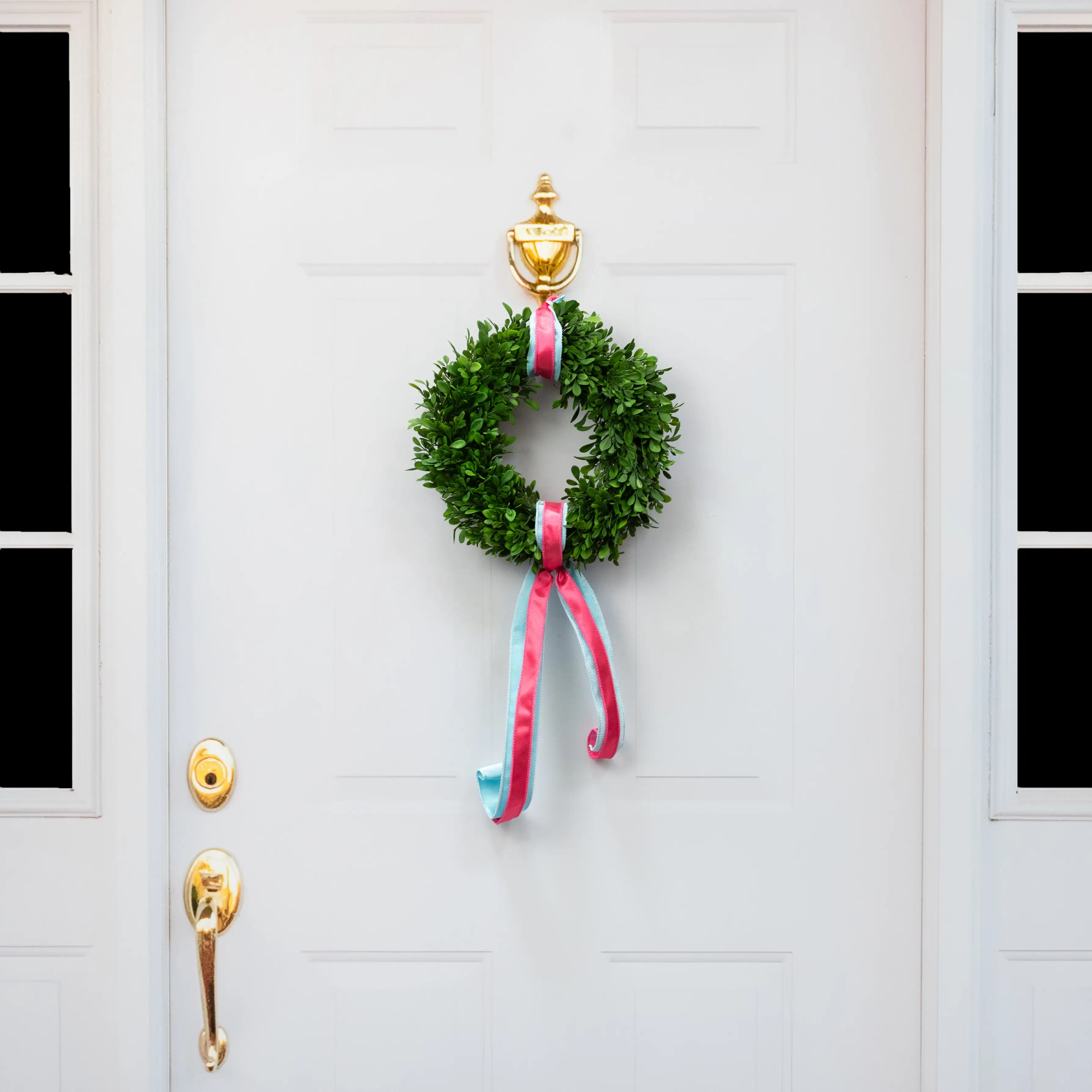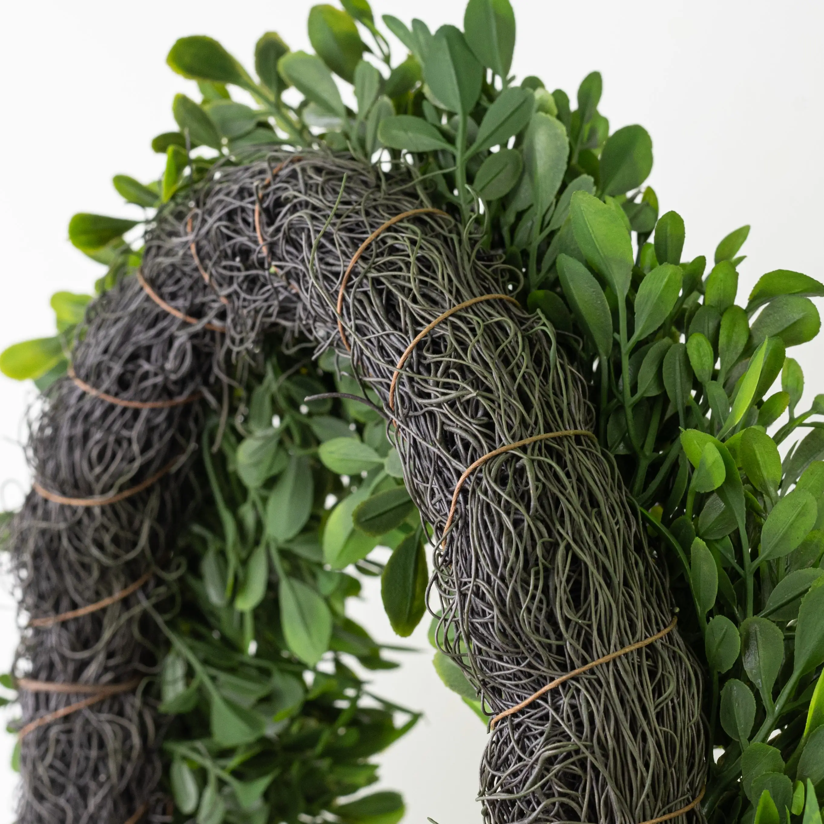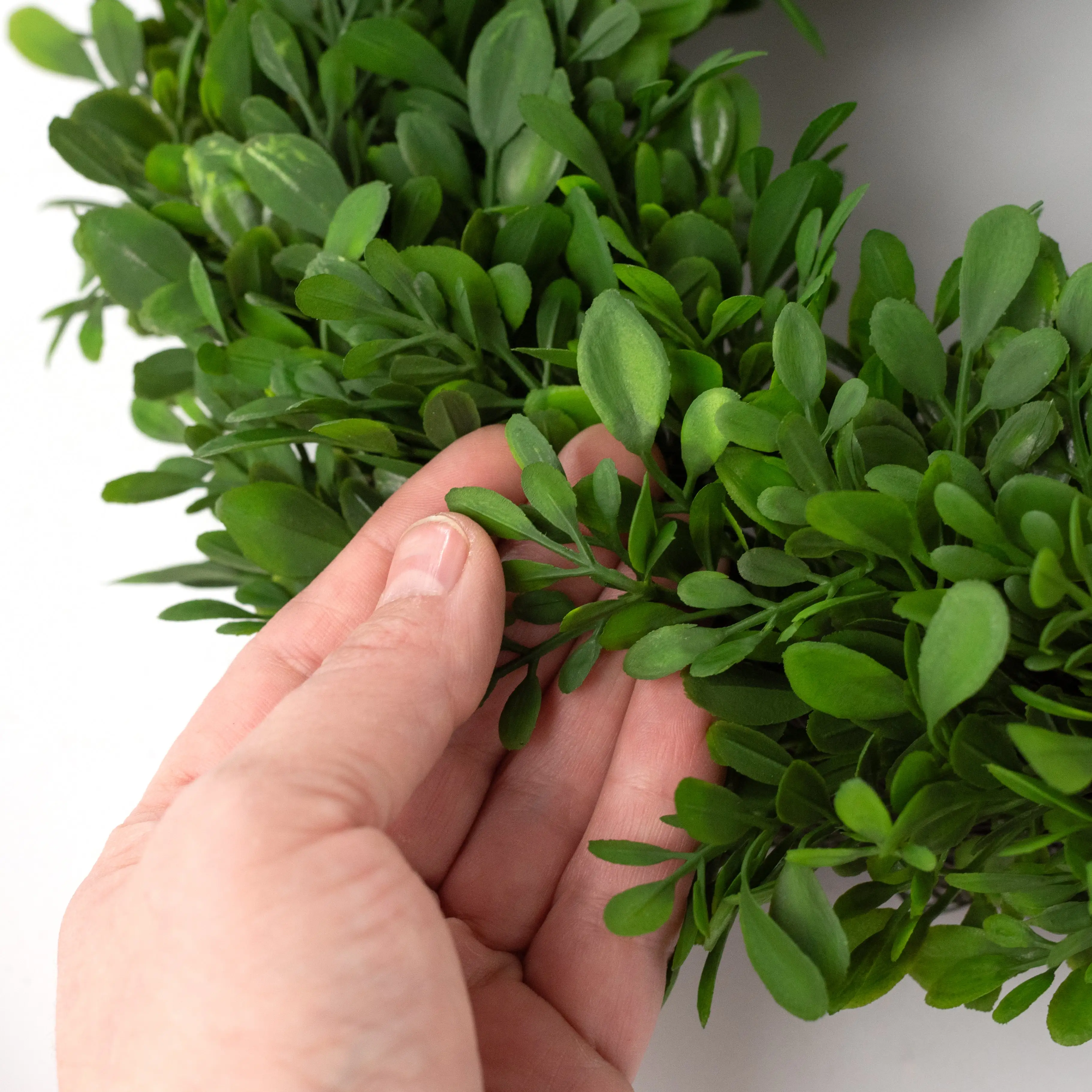 This 12-inch-diameter wreath is mini-sized for smaller spaces, but can still look great on a standard door (we added ribbon tails to ours to visually extend its length). The wreath is built on an artificial angel vine frame that gives it depth. The boxwood leaves are short but densely clustered. The leaves variegate in different places from light green to dark green, giving the foliage realism. Use with a simple sash or add florals and picks.