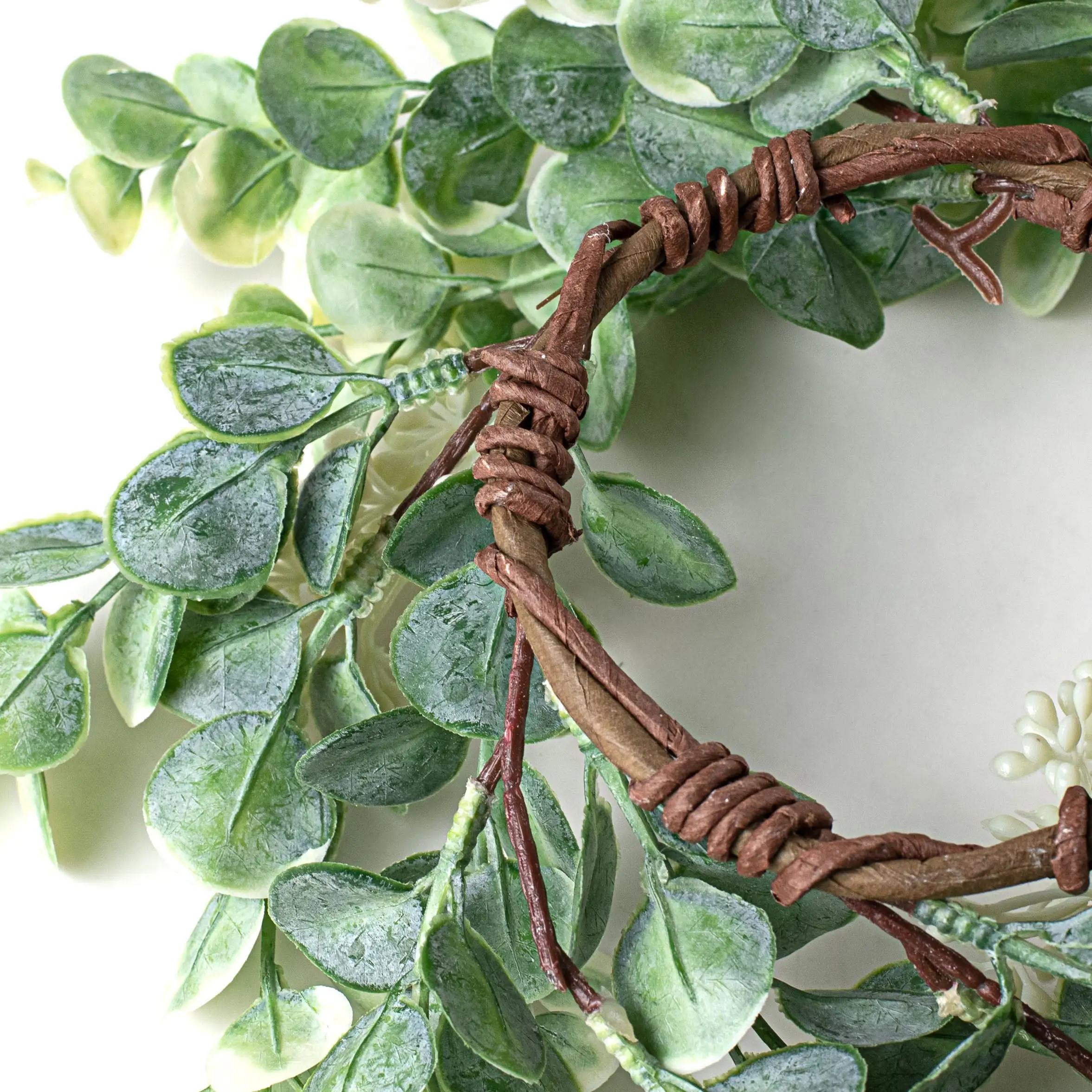 This pretty eucalyptus wreath is build on a round, wired base. The leaves are variegated from cream to light green to dark green - the cream matches the seeds. The smaller size makes this wreath appropriate for use as a candle ring.