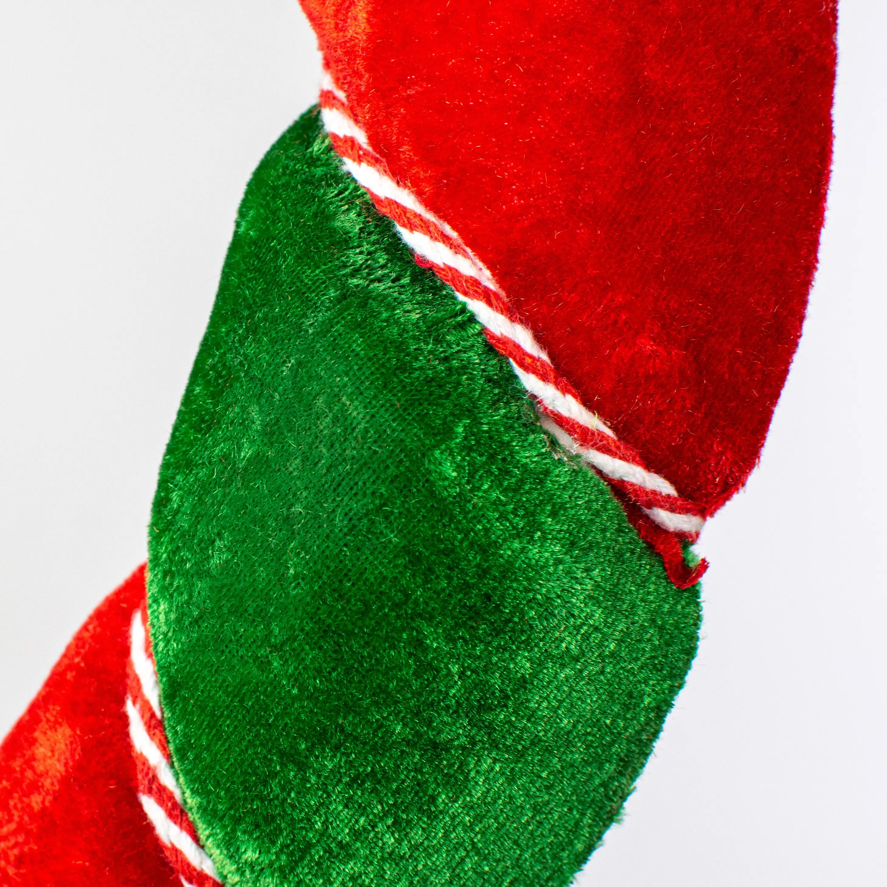 This foam wreath looks great on its own but can also be used as a base for creative endeavors. The foam can be pierced by florals and sprays, and bows can be tied around the form. The ring is molded with subtle ribbing between the emerald green and red velvet-covered sections, and the back is flat. A red and white candy cane striped rope spirals around the wreath, nestled in the ribbing. Mix and match with peppermint accessories or dress up with a simple red bow.
