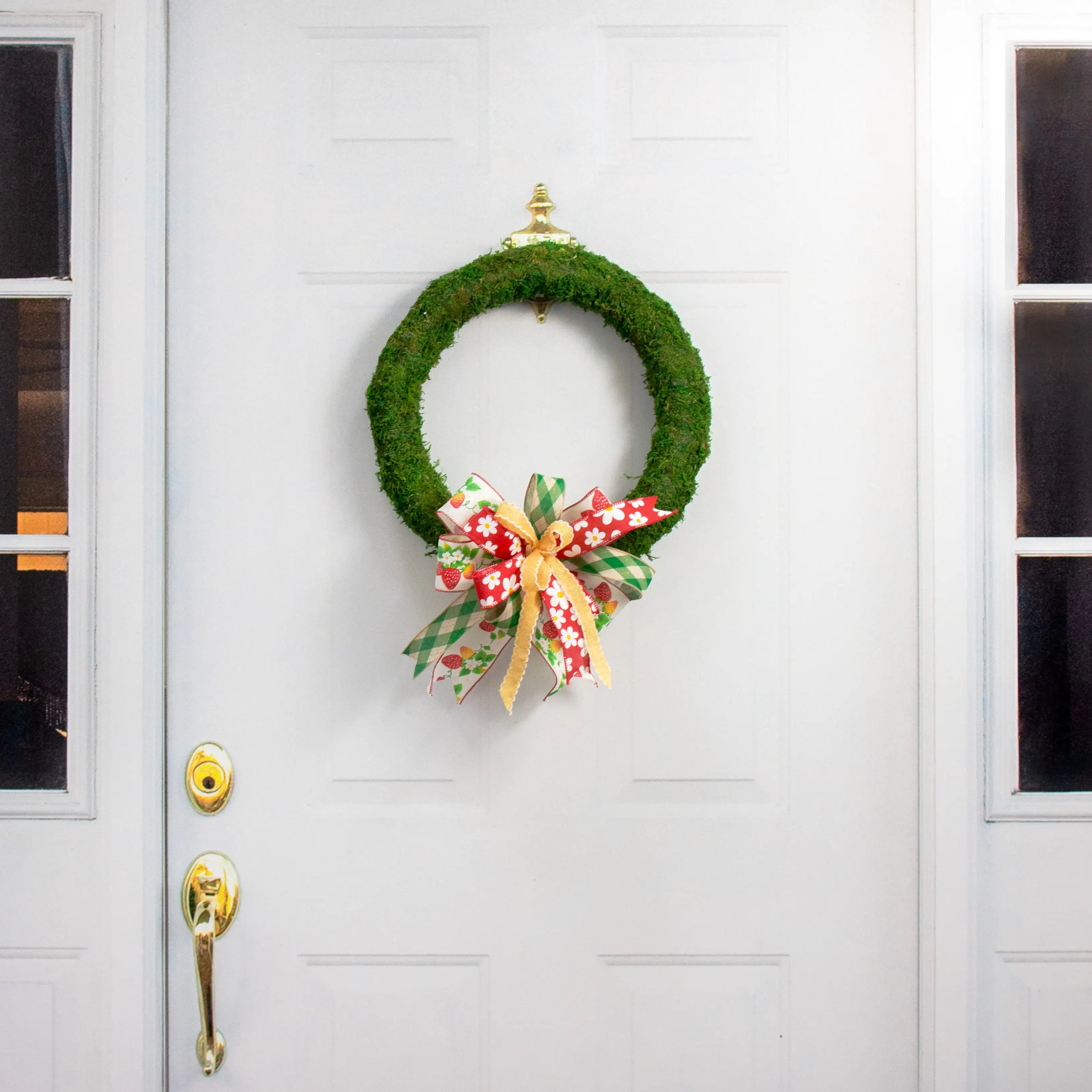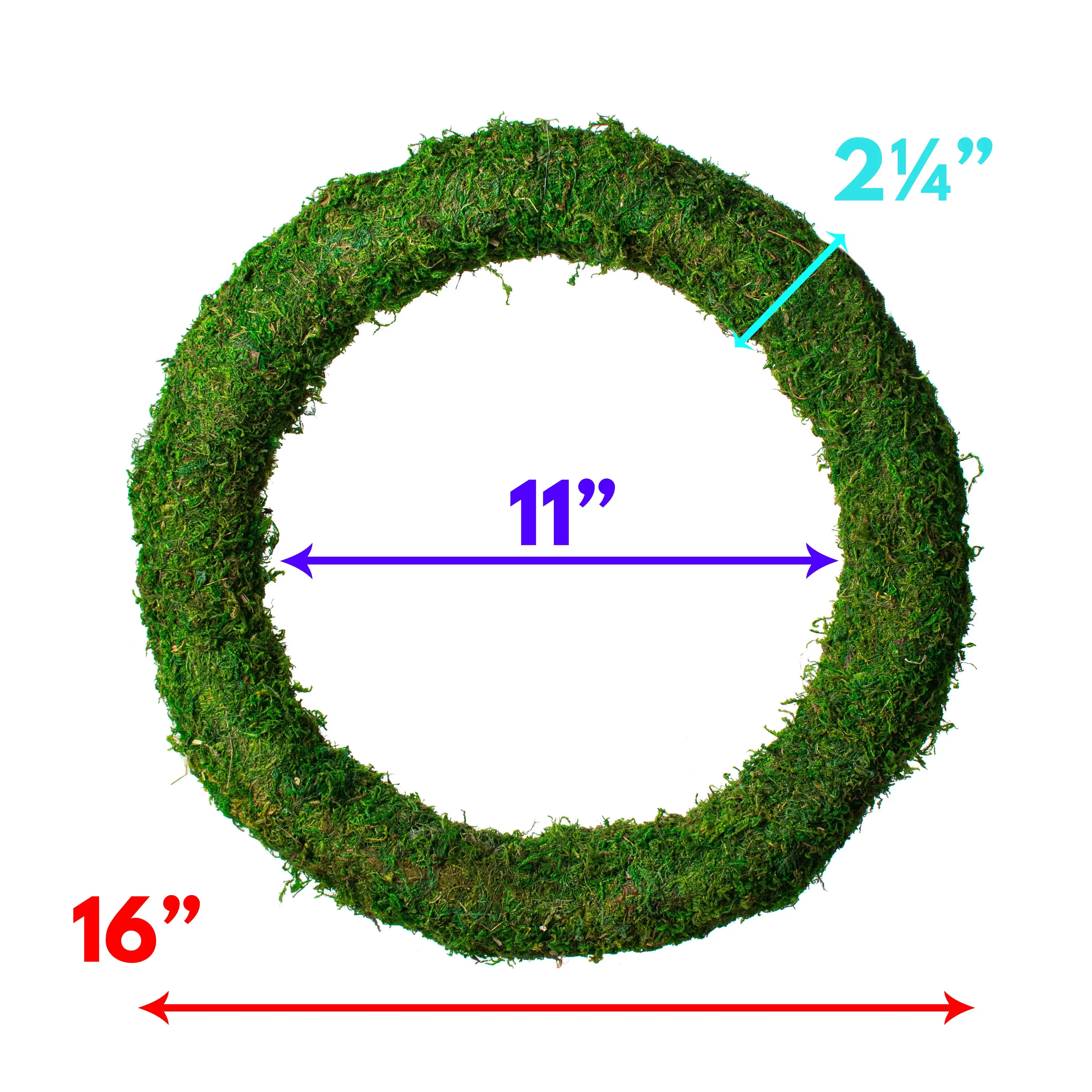This wreath has a rounded form covered in green, faux moss. The armature is made from wire and the form is puncturable - a useful trait for attaching florals.