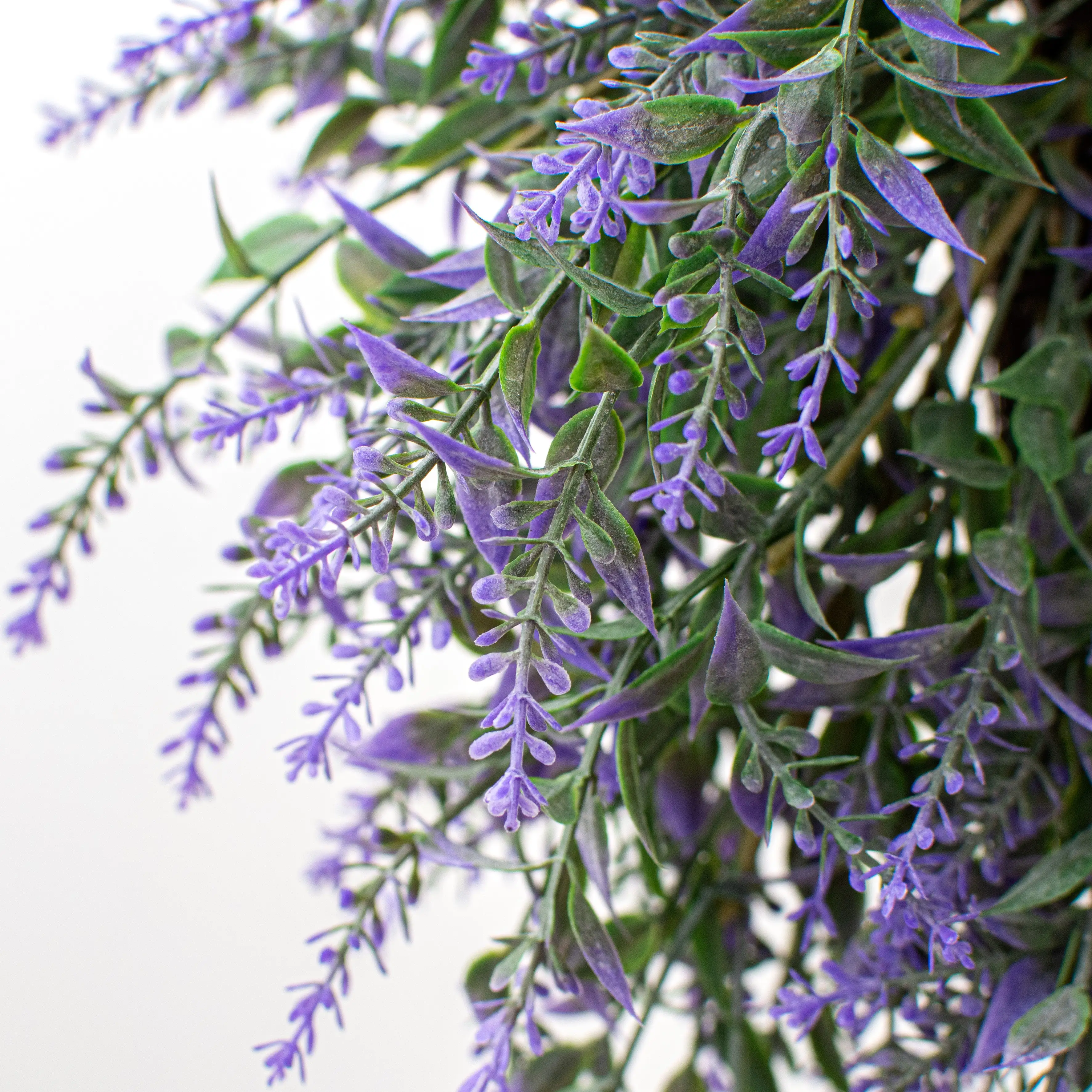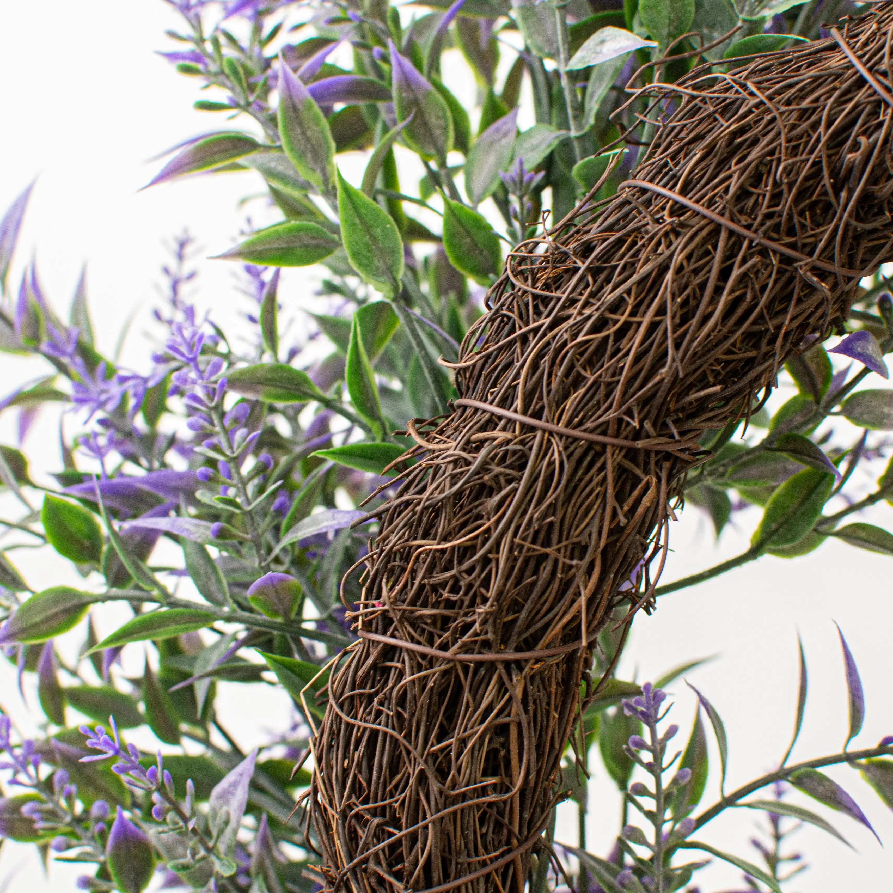 This wreath has an angel vine base that is gorged with purple lavender flowers and green and purple leaves. The repetition of a single type of flower creates a homogenous but voluminous, simple design that is universally adaptive. It's reusable, stores easily and not much fluffing is required to achieve its optimal look.