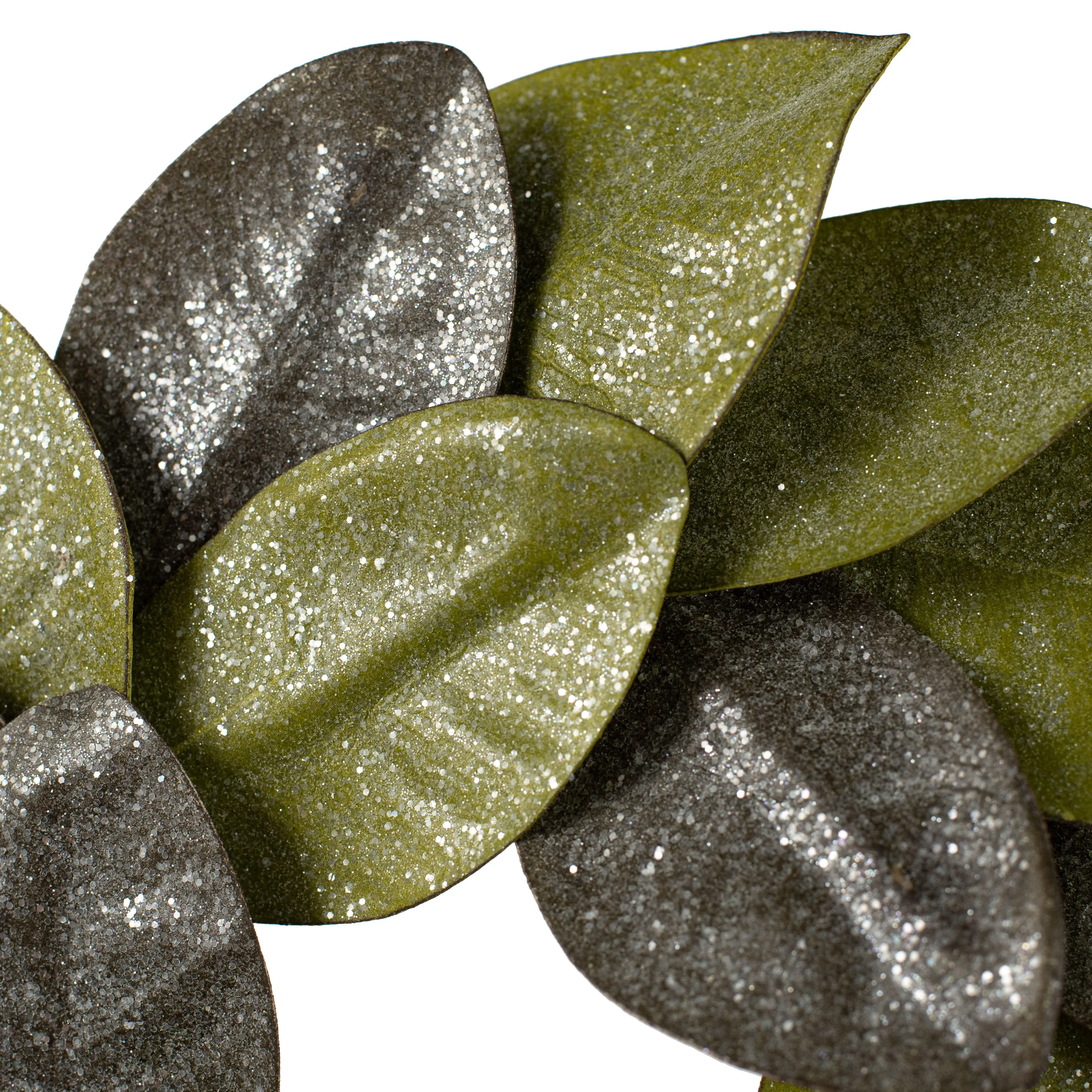Magnolia leaves in two shades of green have a frosting of icy glitter, taking this Southern staple into winter decor. The size is ideal for decorating small spaces or for use as a candle ring. We pictured it here encircling three of our 3-inch-diameter flameless candles.