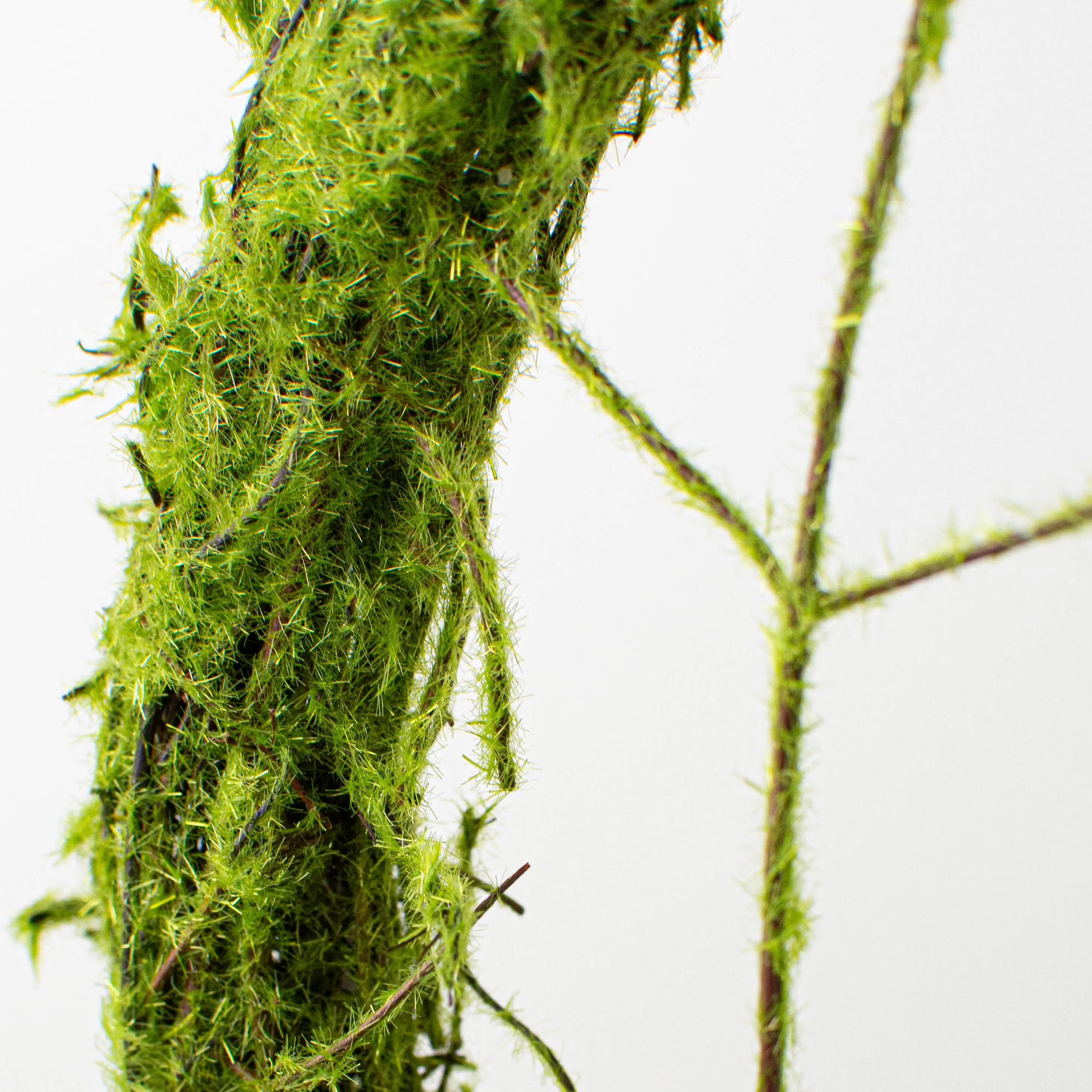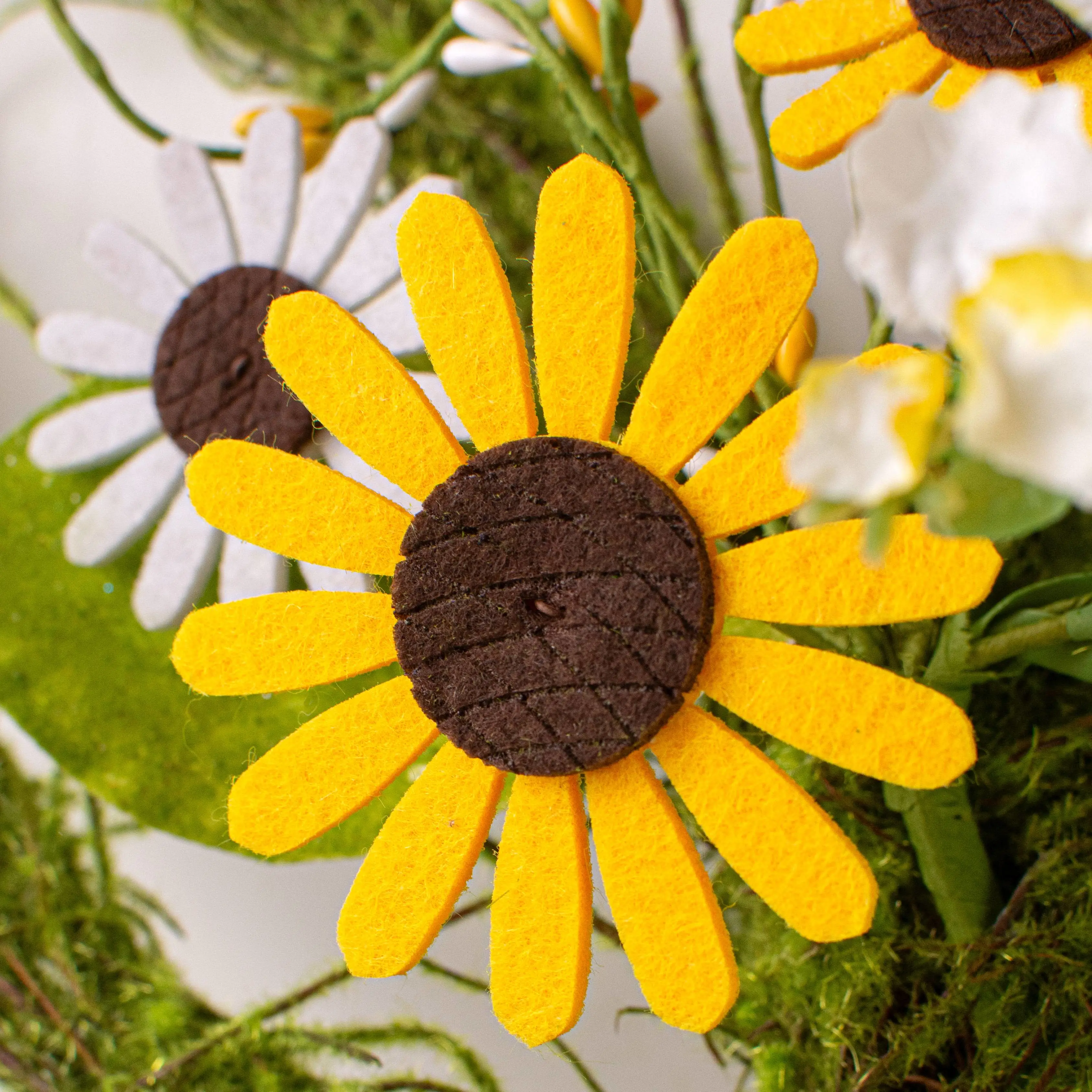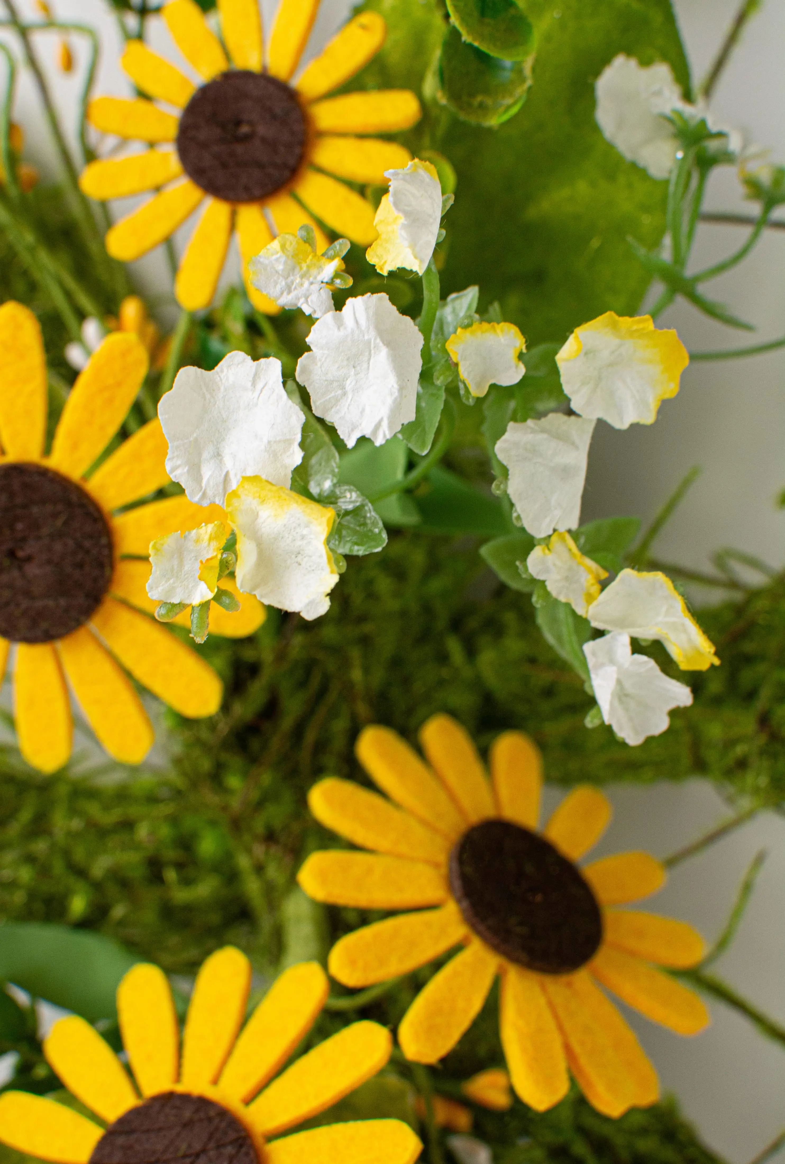 Natural grapevine is wrapped around a wire frame to form the shape of a butterfly. The grapevine is flocked with faux moss that matches the greens in the wreath's leaves and eucalyptus. Yellow and white felt sunflowers with brown centers join paper flowers and pips in the same colors. Each element is wired.