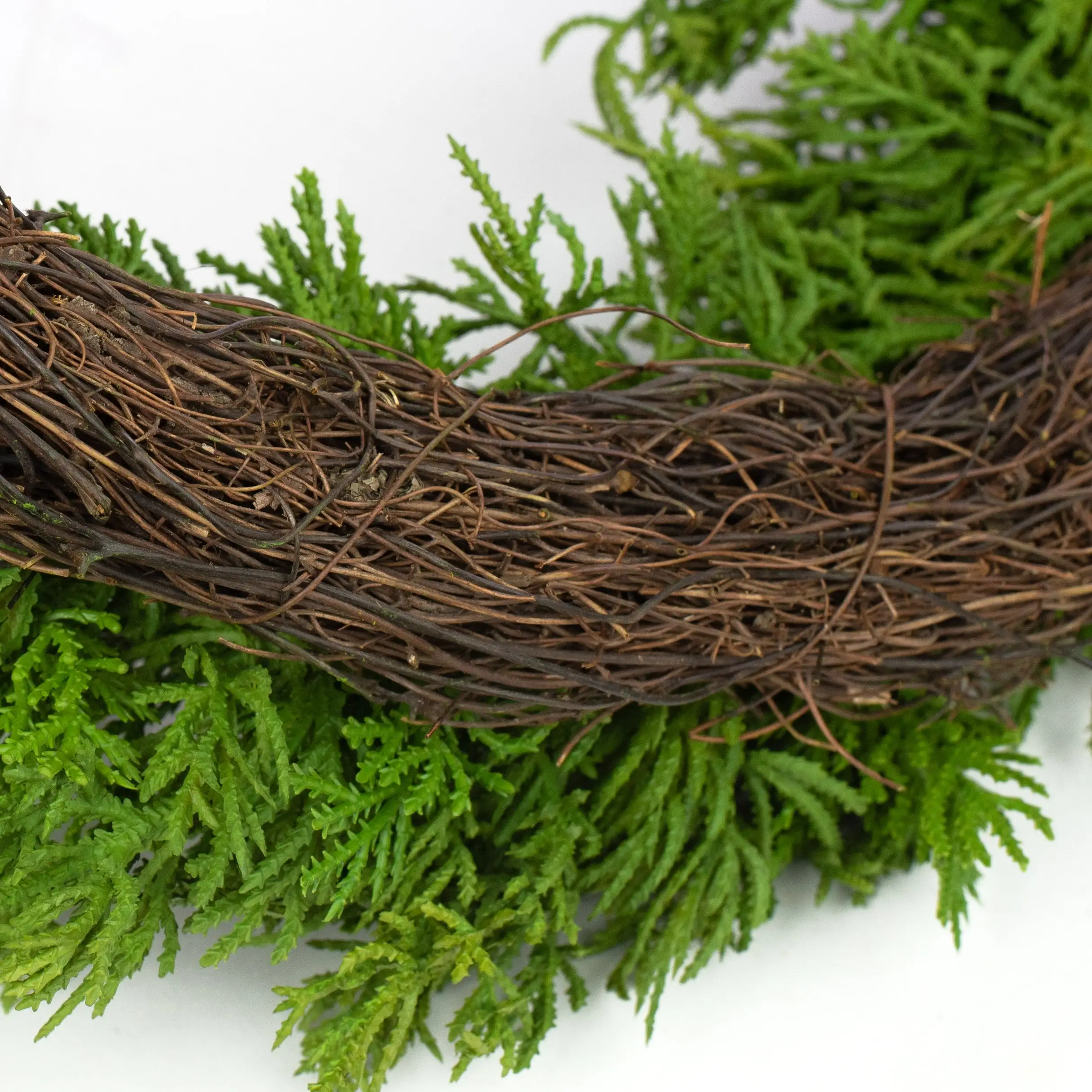 This beautifully textured wreath mimics the look and feel of cedar pine. Tufts of the cedar needles are tucked into a round angel vine base, giving the appearance of depth.