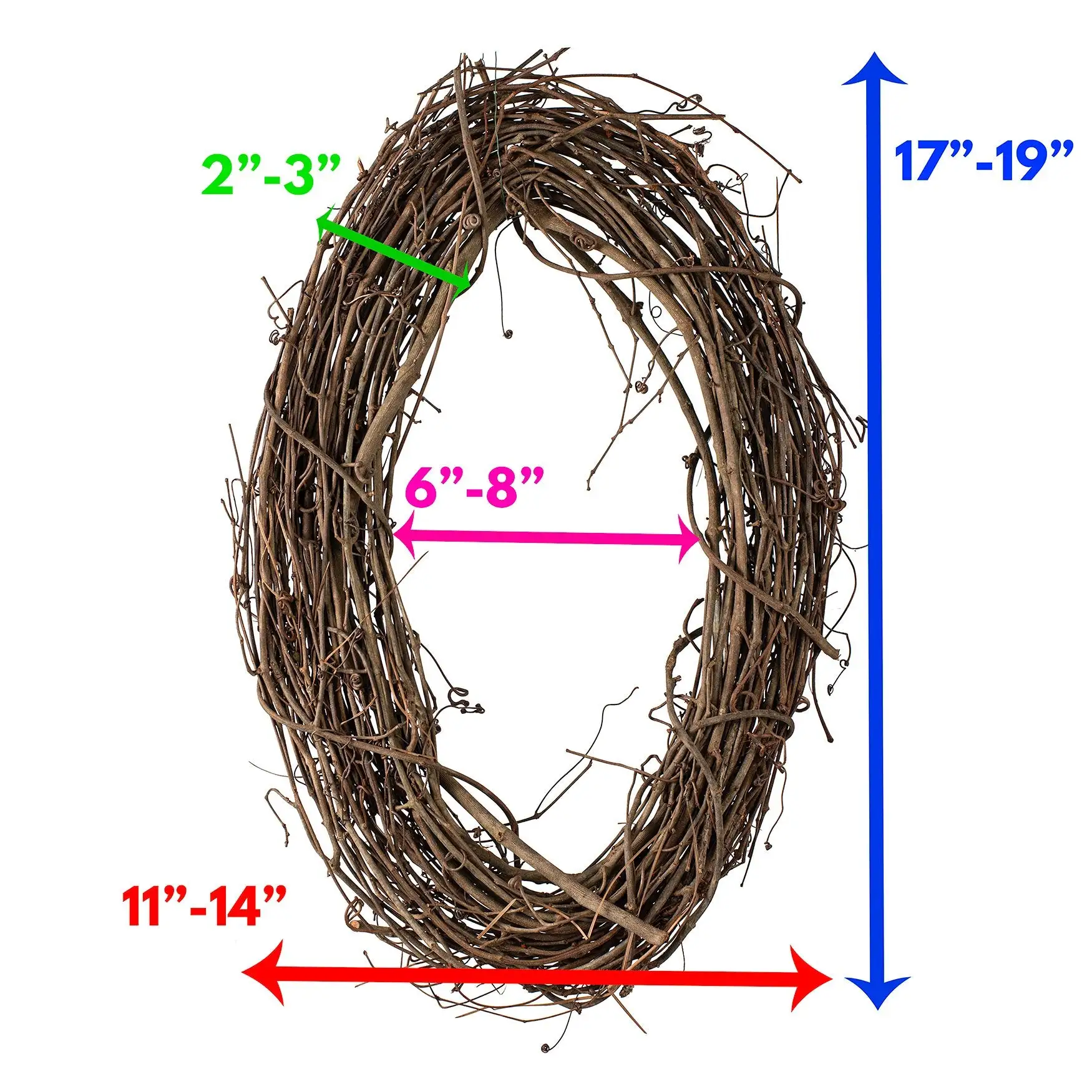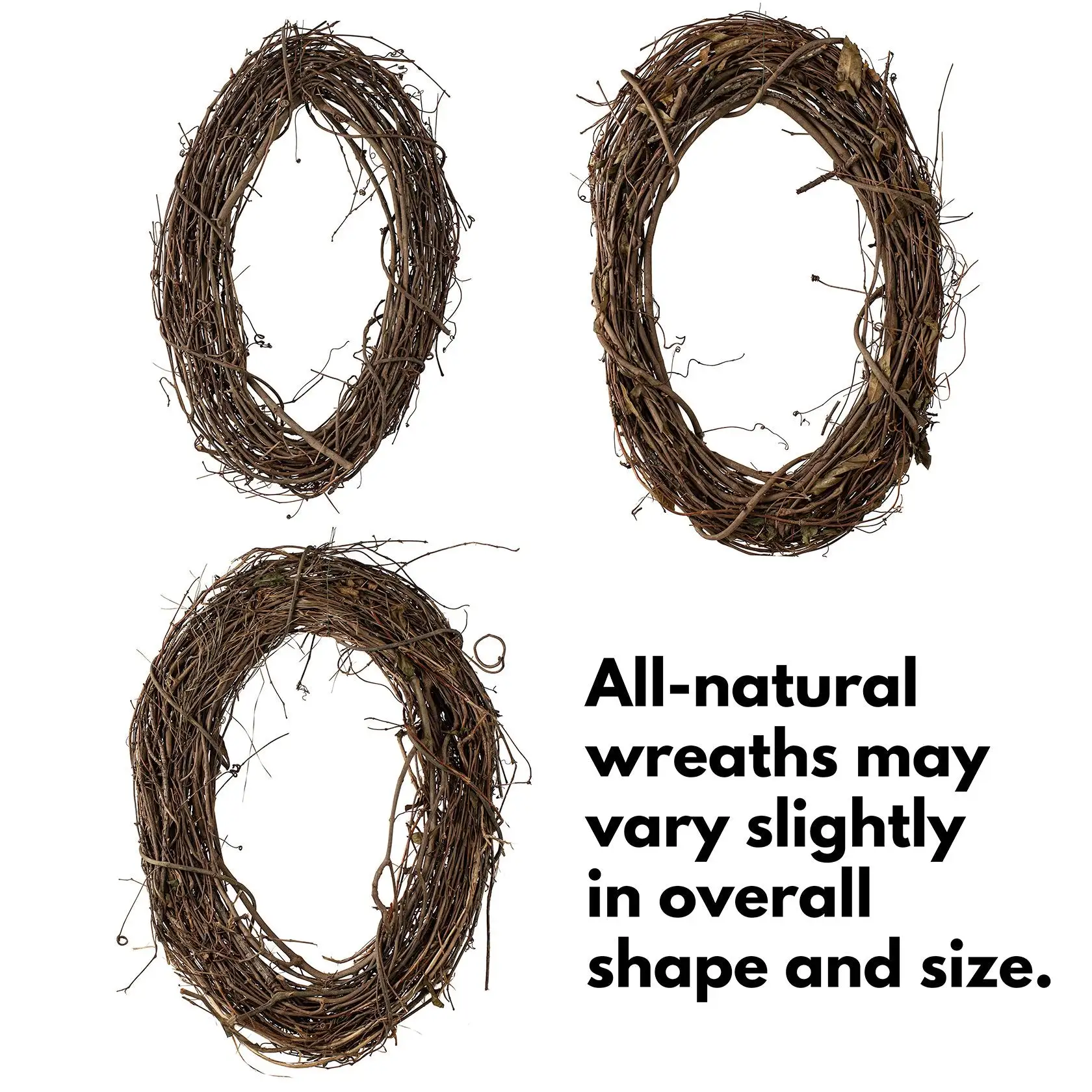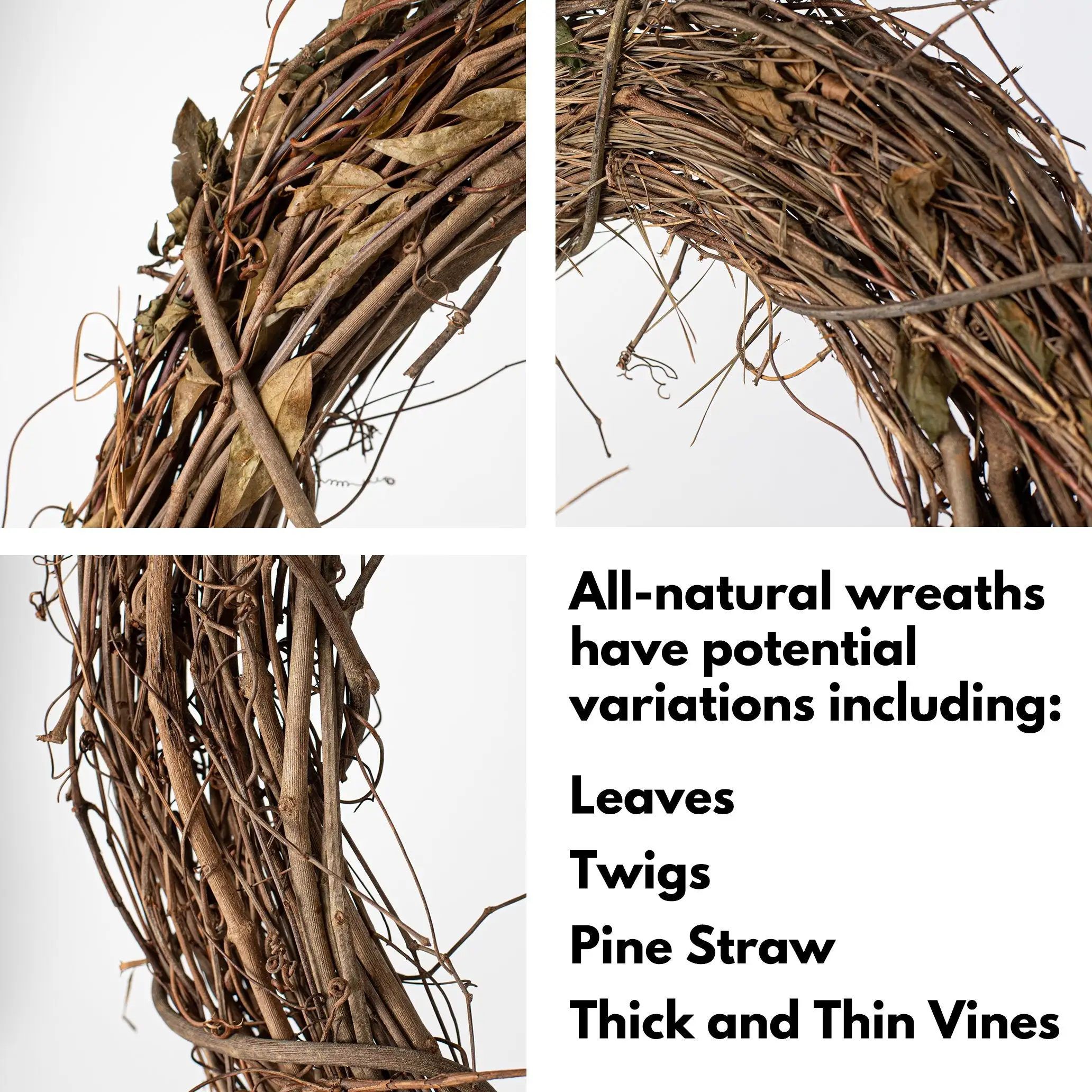 The grapevine is grown in the USA and harvested throughout the year, which may result in the inclusion (or exclusion) of natural seasonal elements such as leaves, pine straw and twigs. These elements contribute to the uniqueness of each individual wreath. As each one is handmade, the overall shape of the wreaths may vary as well as the exact dimensions.