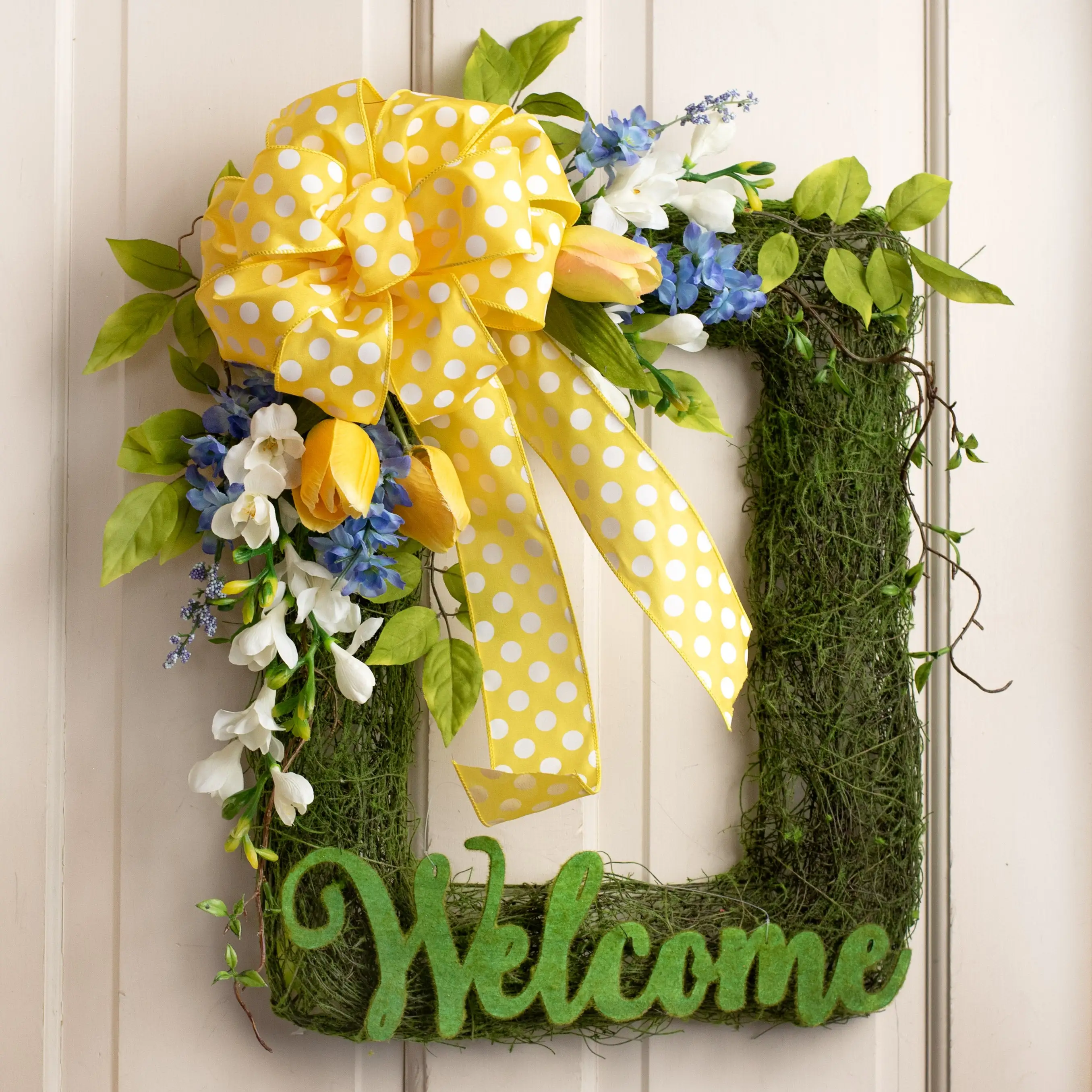A convex curved wire frame is generously covered with moss flocked angel vine. The flat back makes the frame lay easily against doors and walls. The convex curve allows room for attaching flowers by poking their stems through.