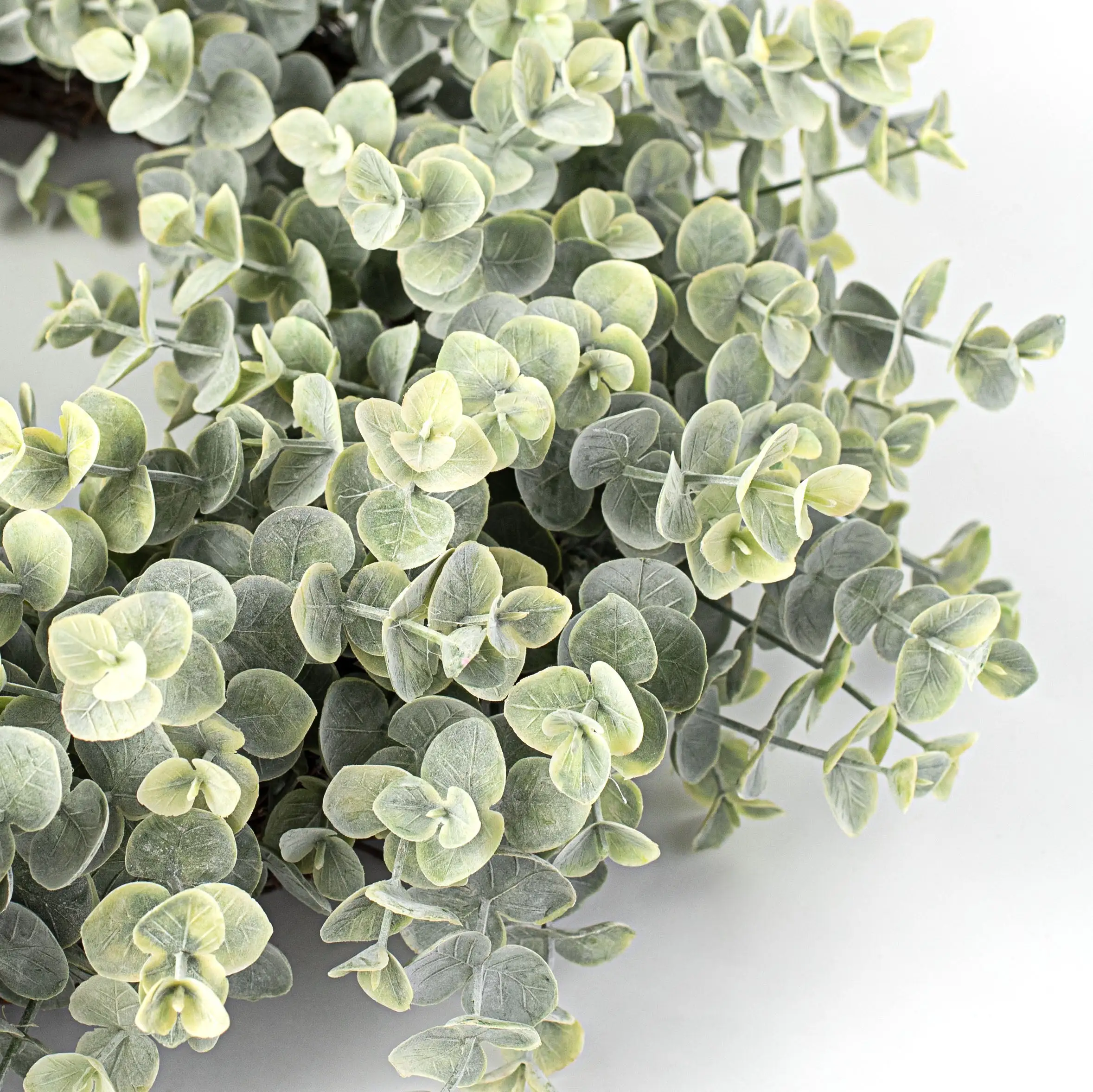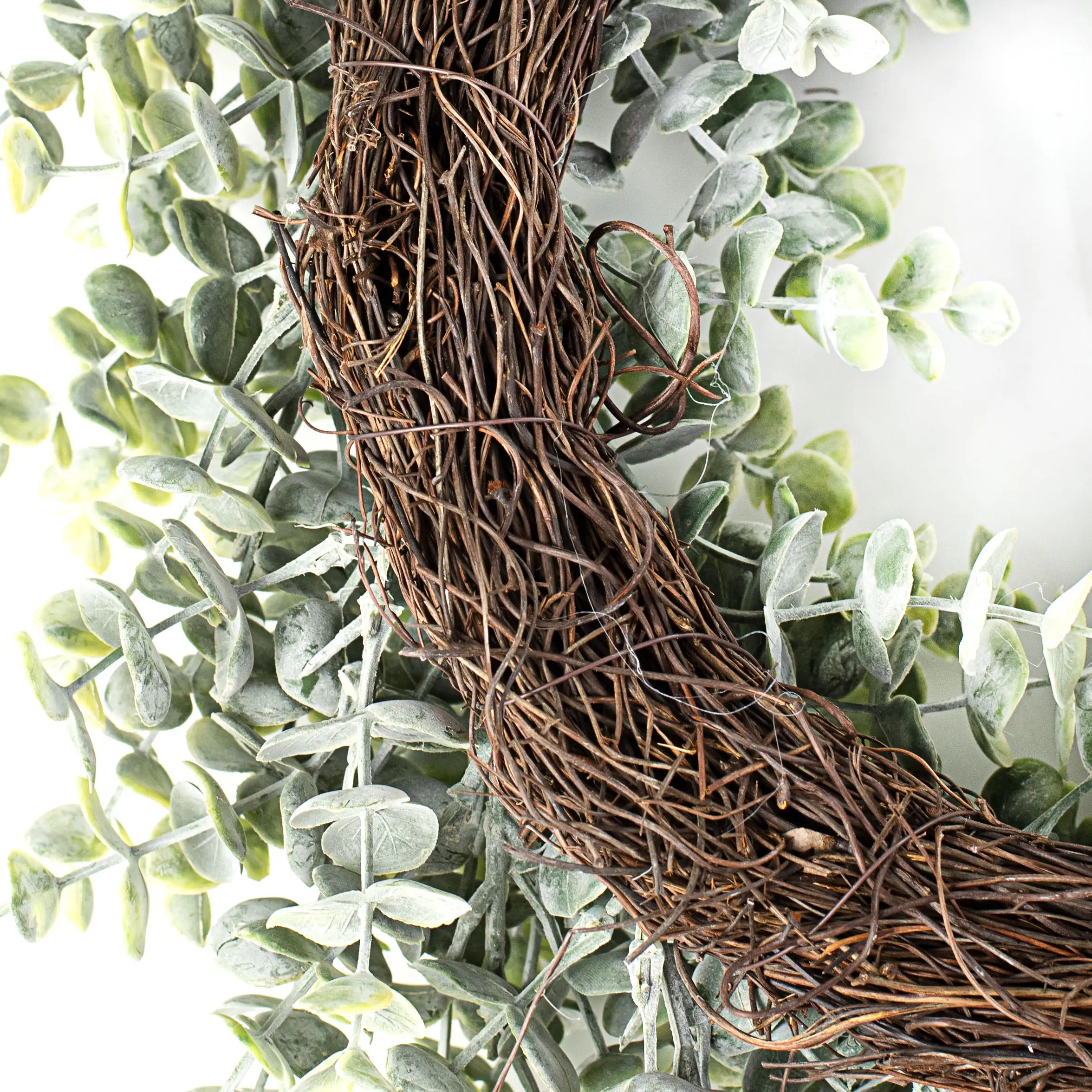 This wreath has an angel vine base that is full of densely packed eucalyptus. The foliage is variegated with a soothing, light sage green color scape.