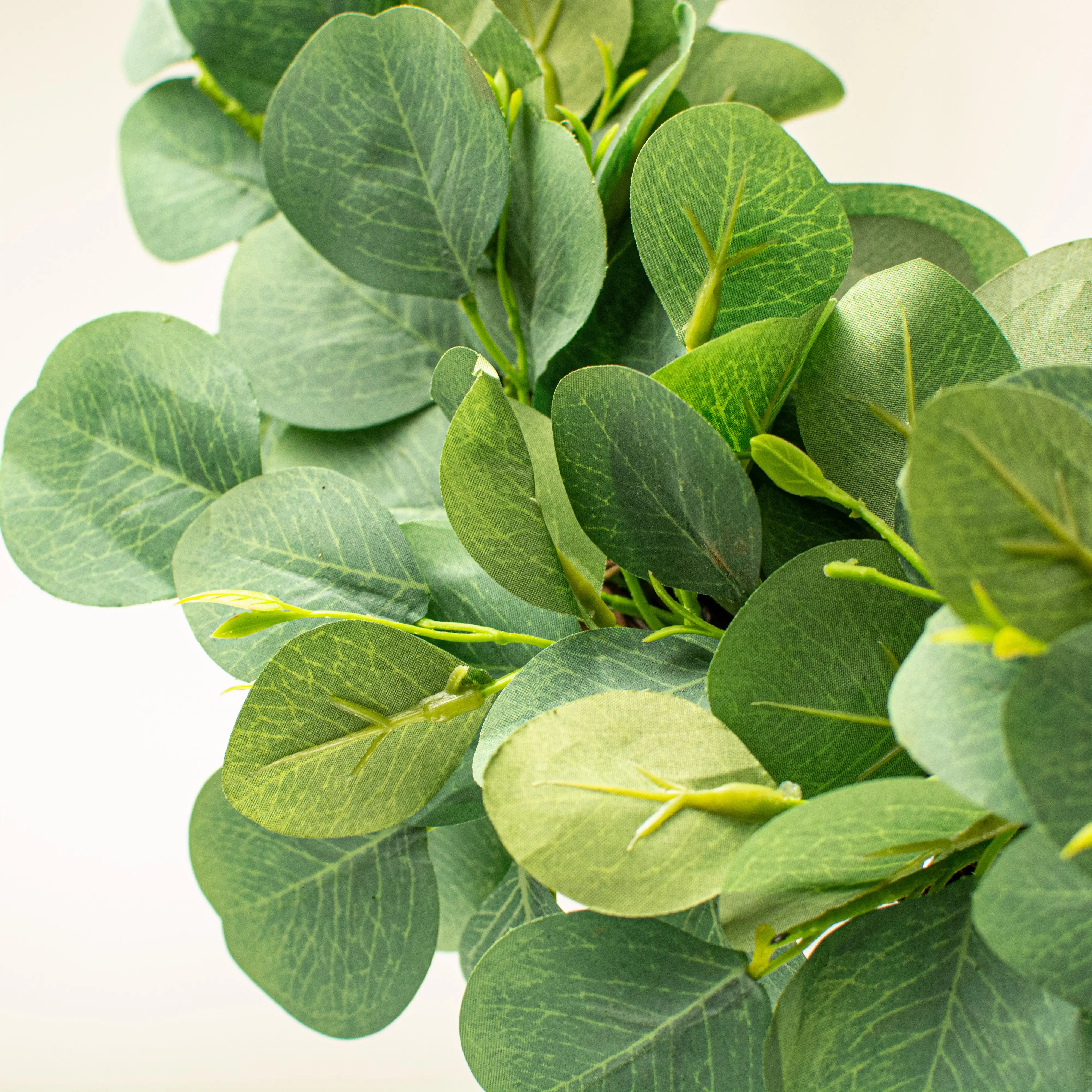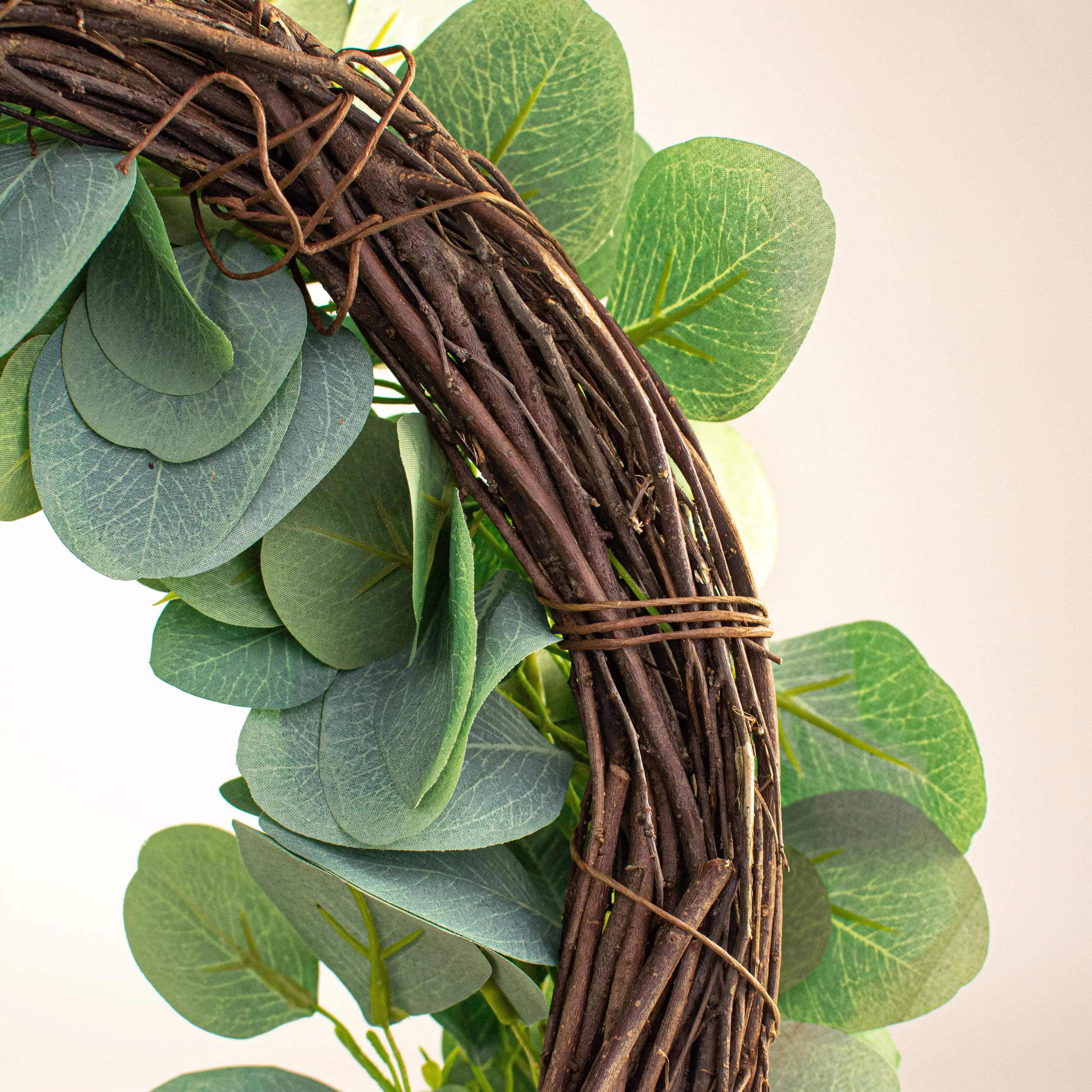 This round grapevine wreath is topped with oval-leaf eucalyptus. The short, bushy sprigs allow the leaves to show their top an undersides for subtle color variation. Keep it around all year and add a simple bow for each season.