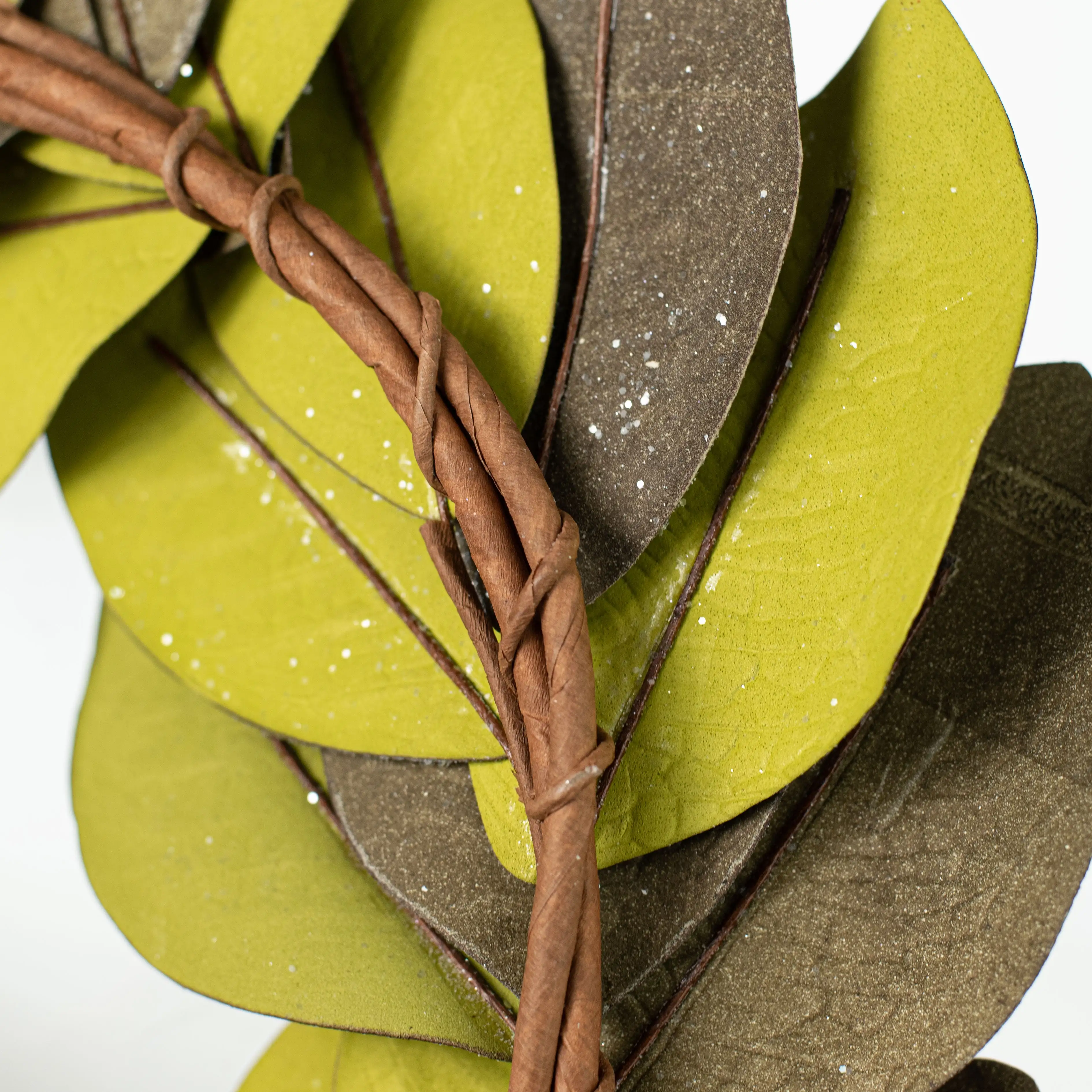 Magnolia leaves in two shades of green have a frosting of icy glitter, taking this Southern staple into winter decor. The stately wreath is attractive on its own but can easily be dressed up with a bow.