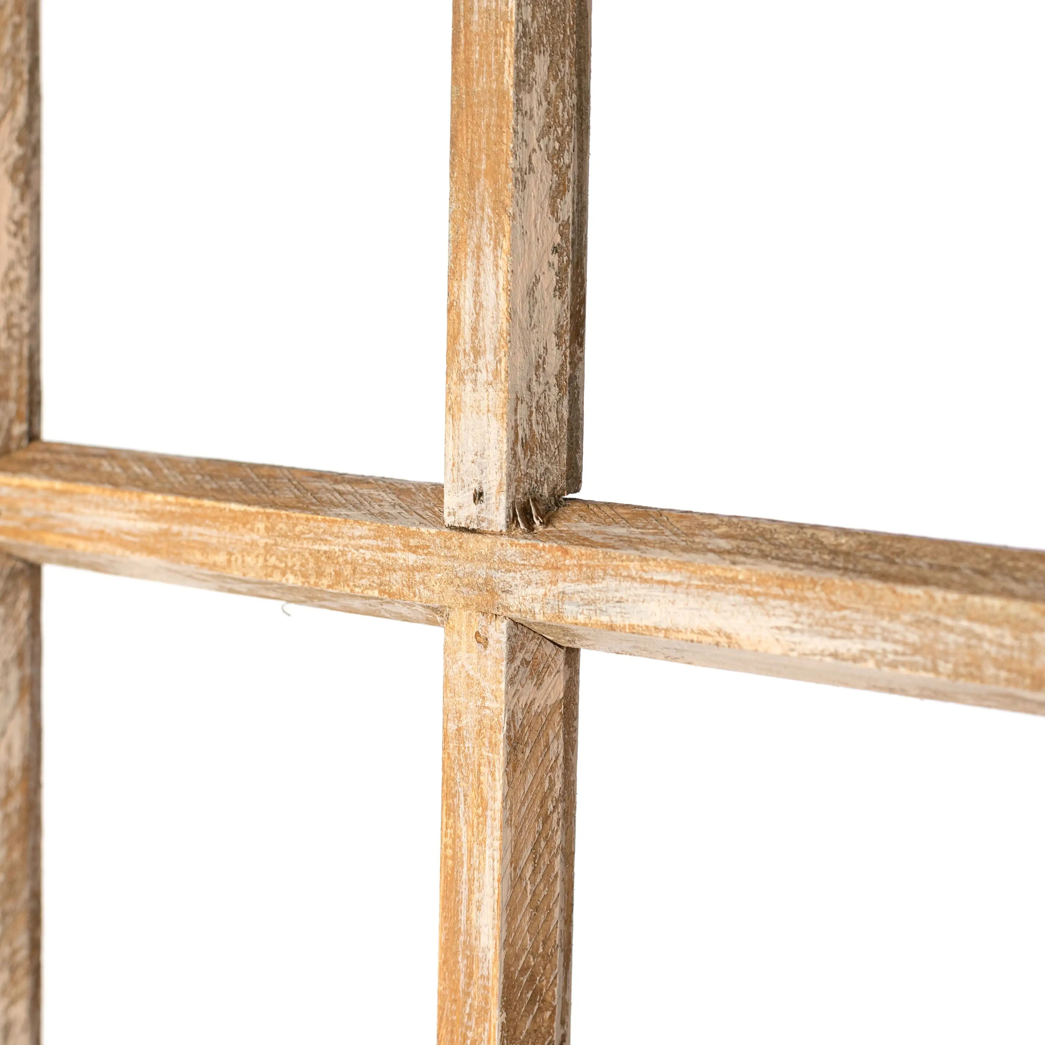 This faux window frame has four empty panes with an antique, farmhouse look. The beveled wood is brown with a wash of beige paint. It can be used as a base for florals, ribbons and small cabinet wreaths/candle rings.