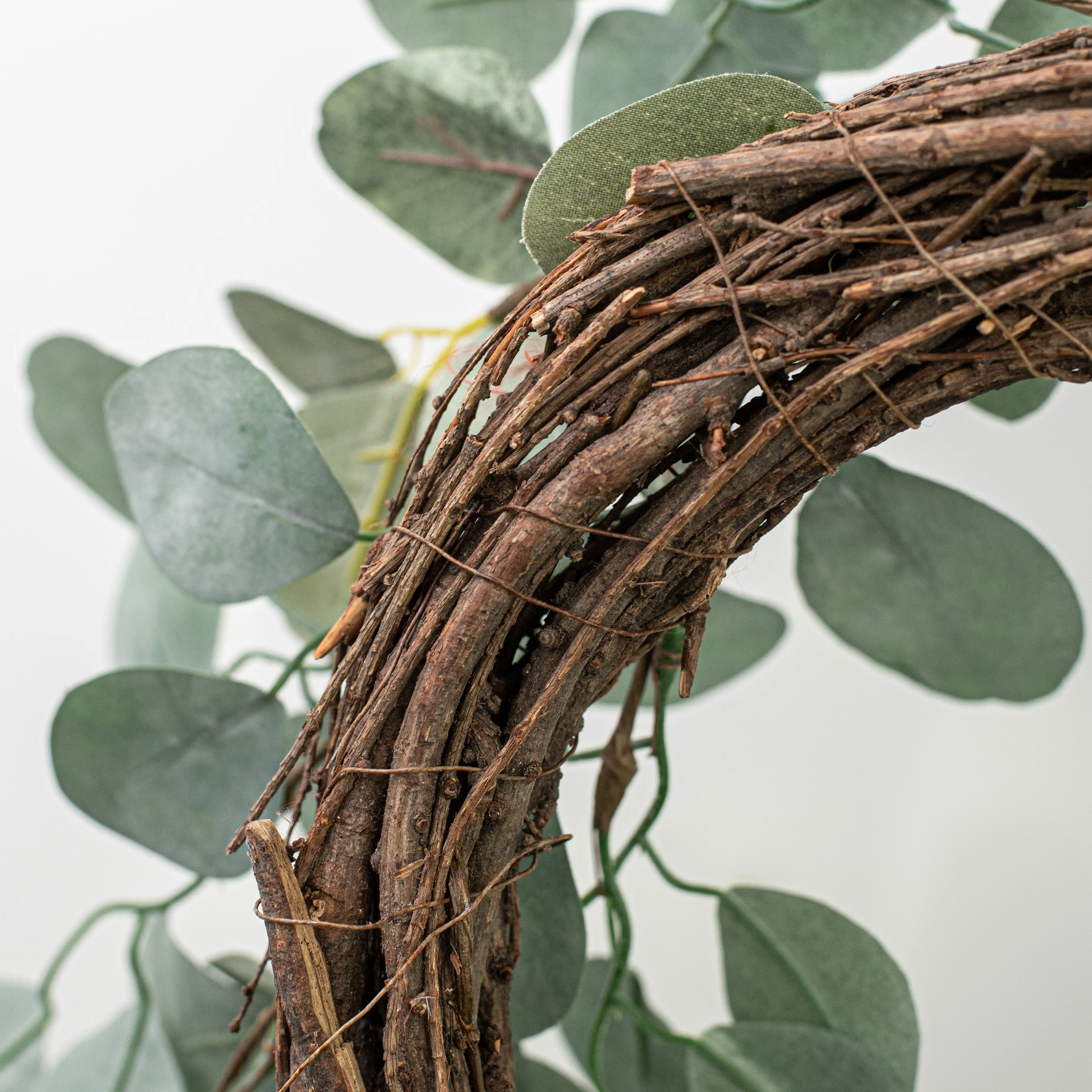 This grapevine wreath is filled with branches of sage green, silver dollar eucalyptus leaves. Each branch is wired and can be adjusted outwards and upwards to achieve the desired look. Keep it simple with a bow or add flowers.
