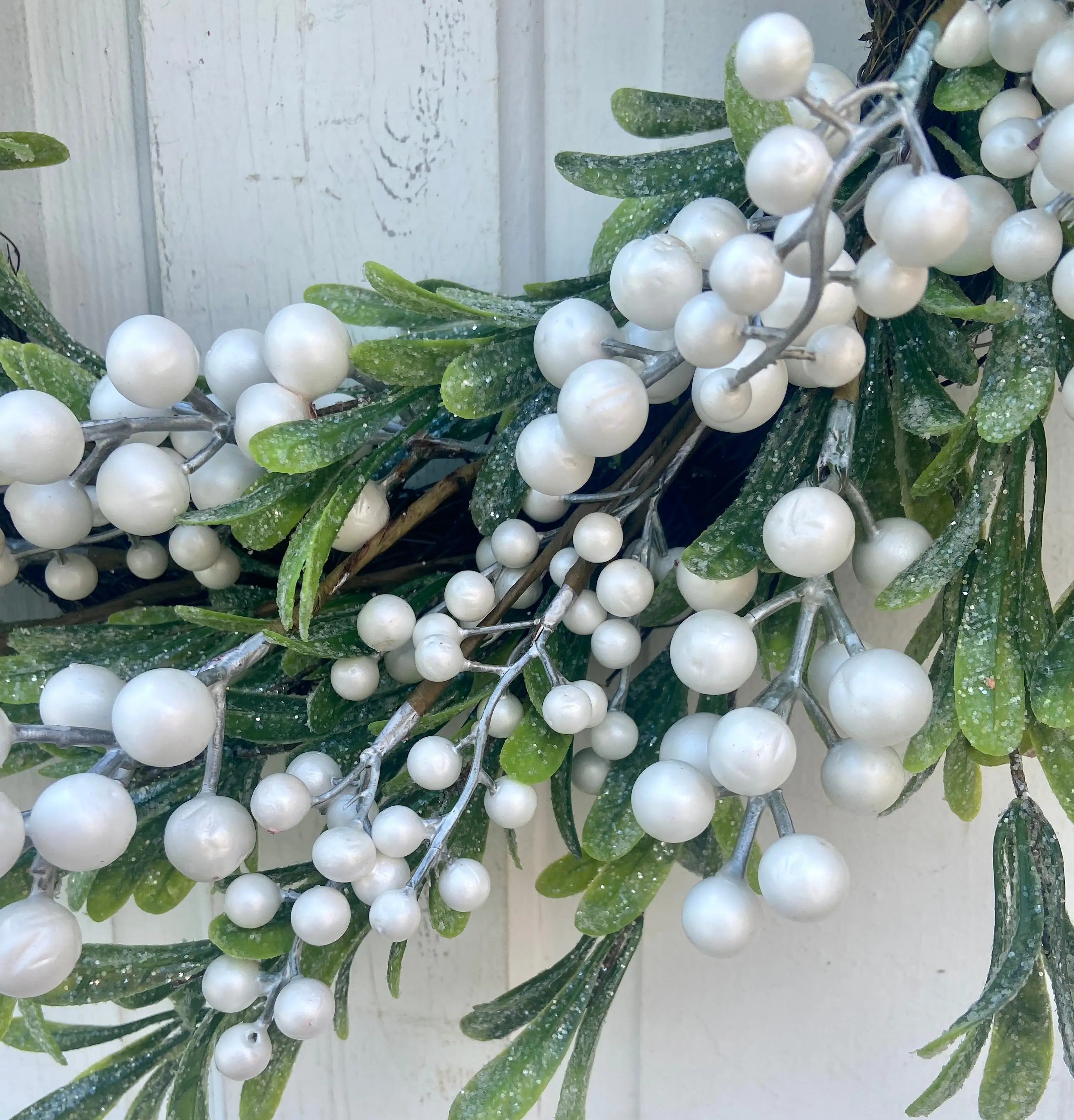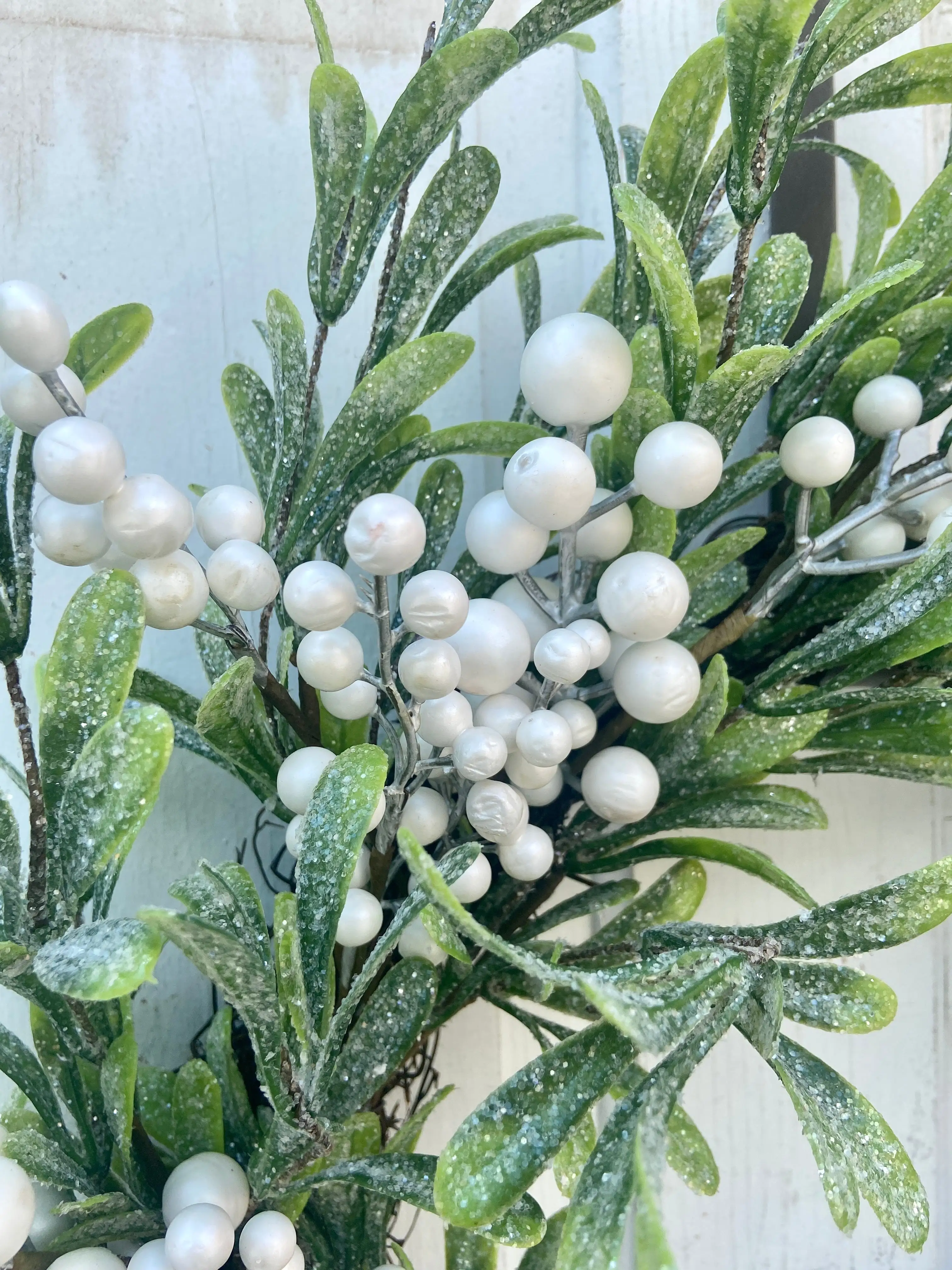 This gorgeous glittered green mistletoe and white berry bush is perfect front door decor for Christmas all the way through Winter. The size is ideal for standard doors and will also look great on an interior wall or door. The base is natural grapevine.