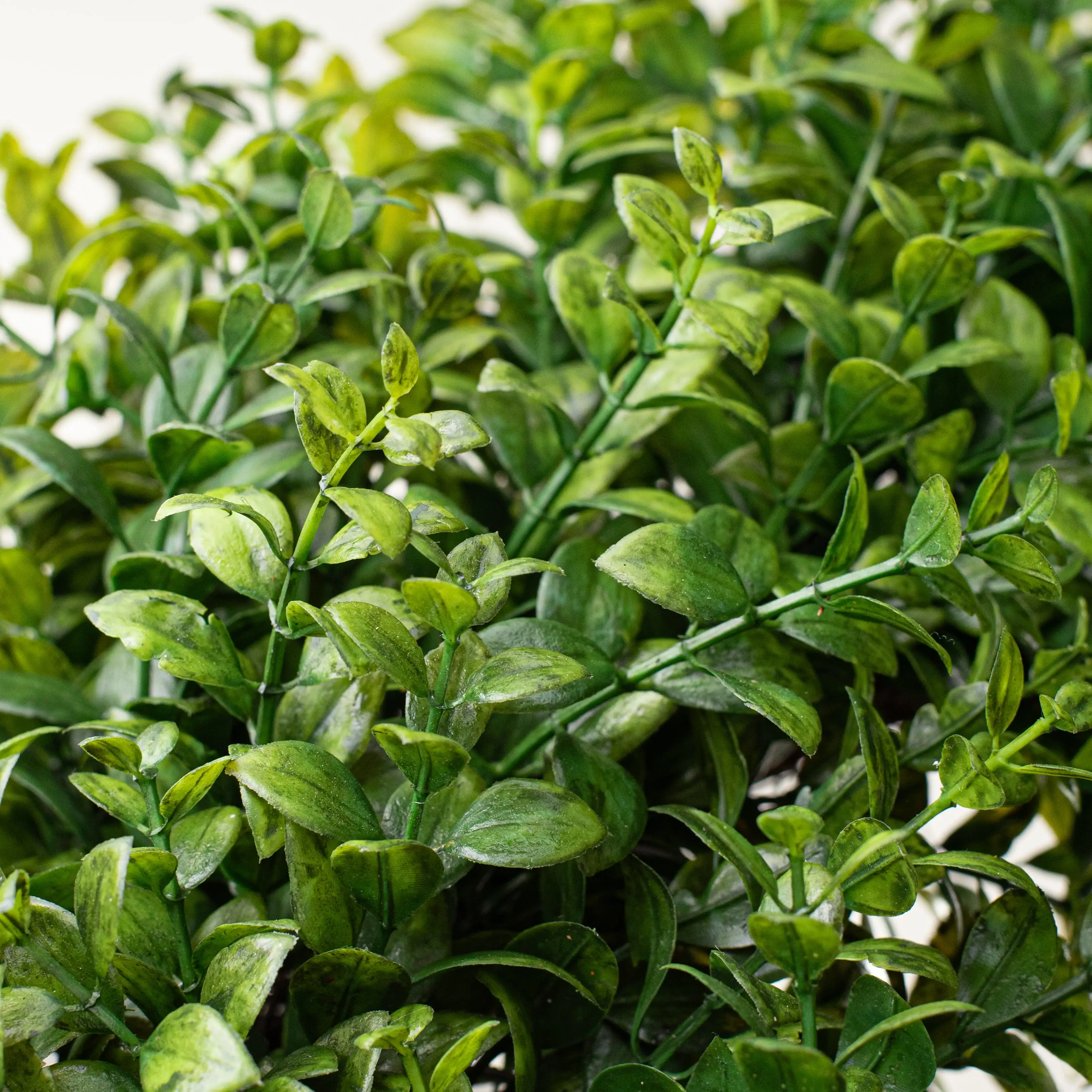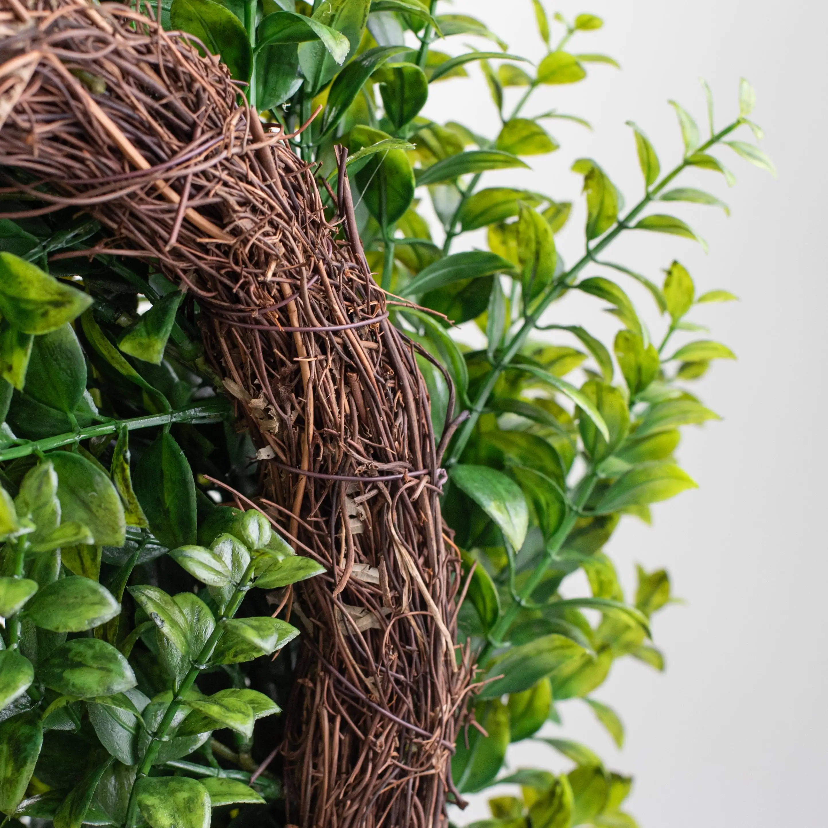 This wreath has thick, ample foliage built onto a natural, angel vine base. The plastic sections of eucalyptus leaves variegate from dark green to lighter green and have a semi-glossy finish that enhances the depth of this wreath.