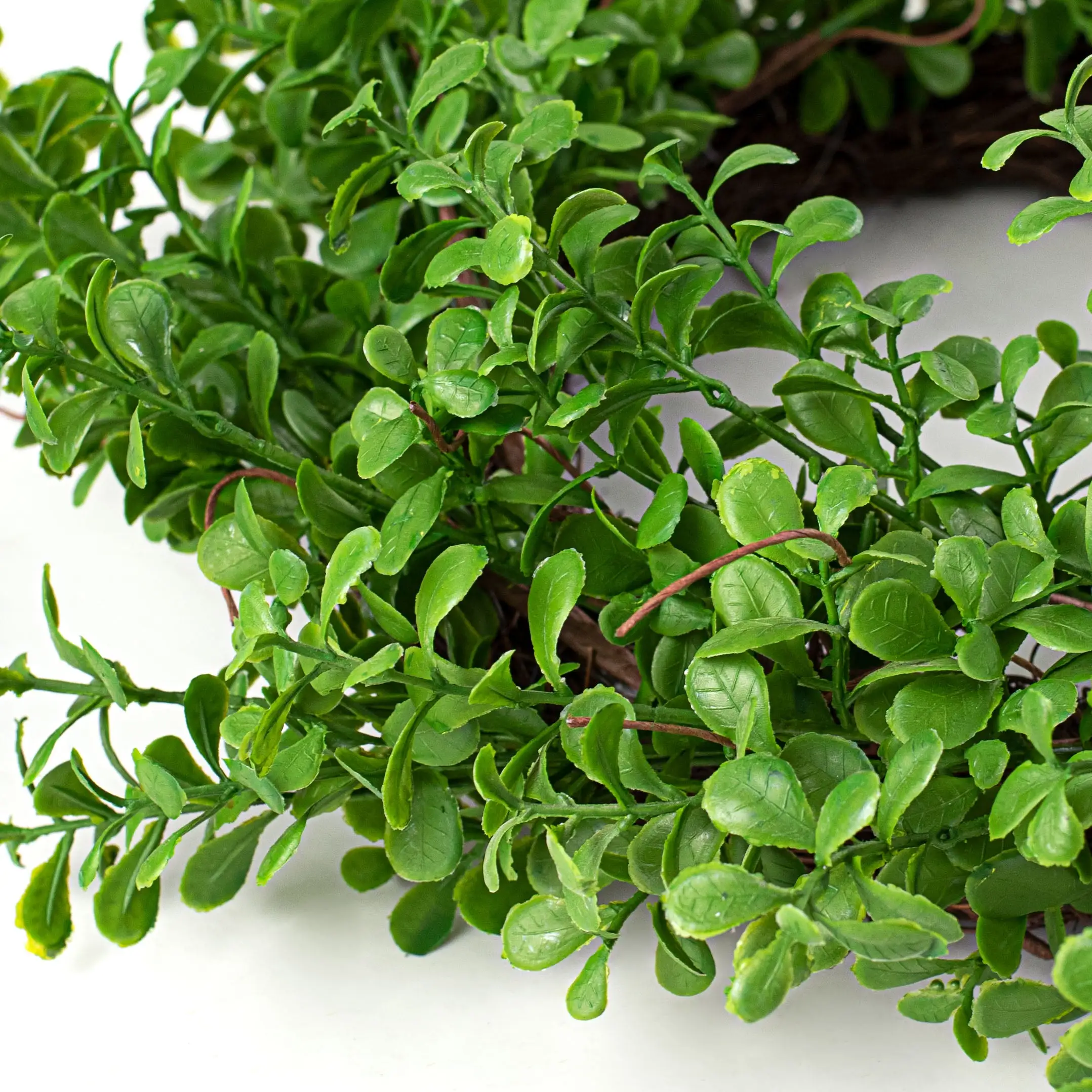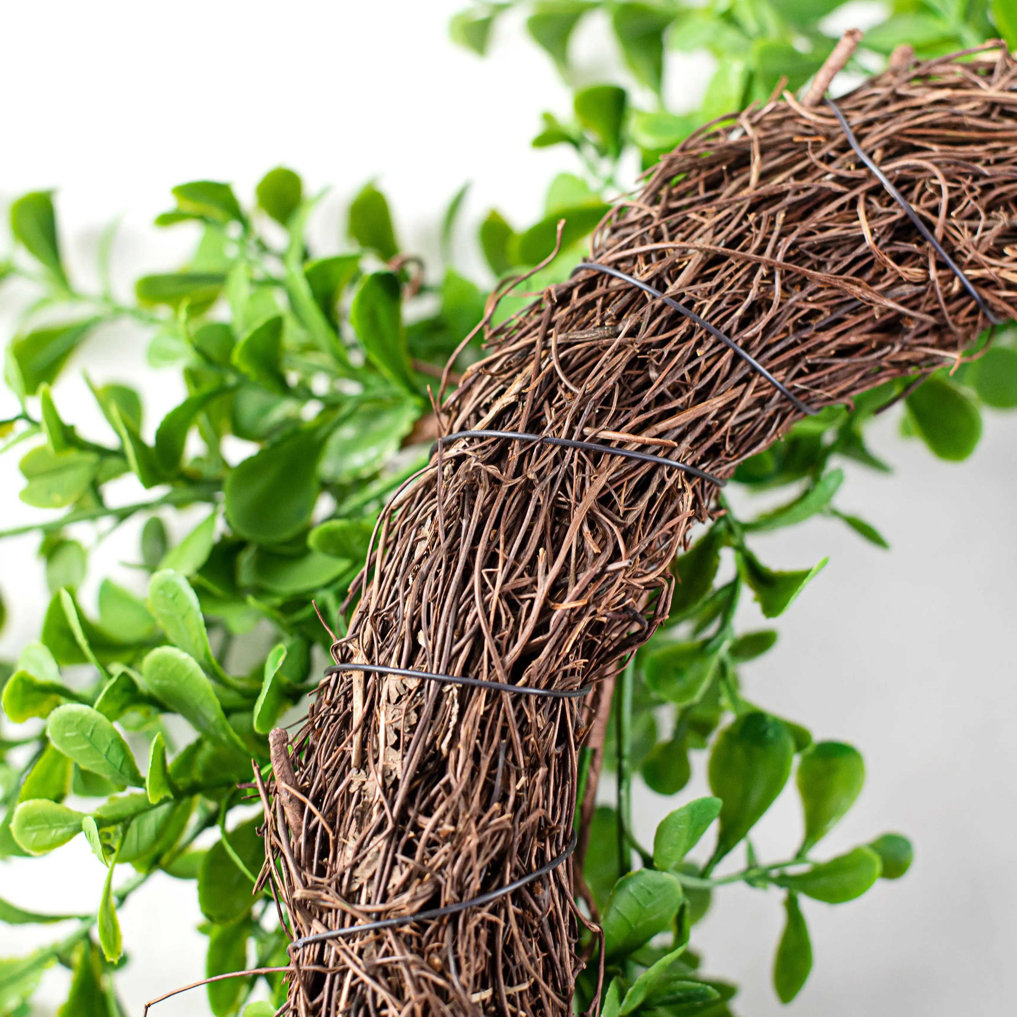 This rich green boxwood wreath is built on an angel vine base. Twig-like wired spirals are interspersed among the leaves for a new-growth, spring look. Each of the leafy sections is attached with wired stems for shaping control.