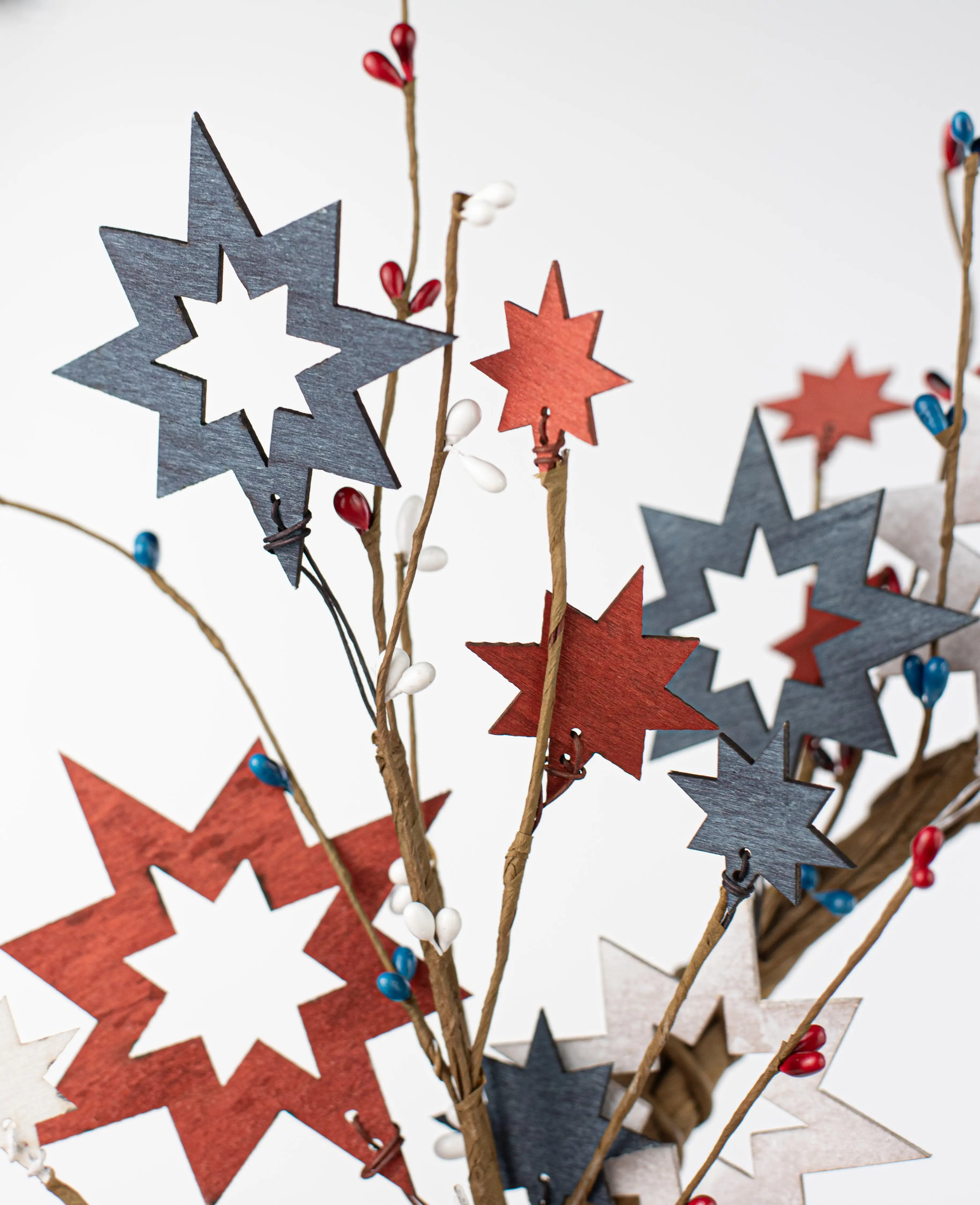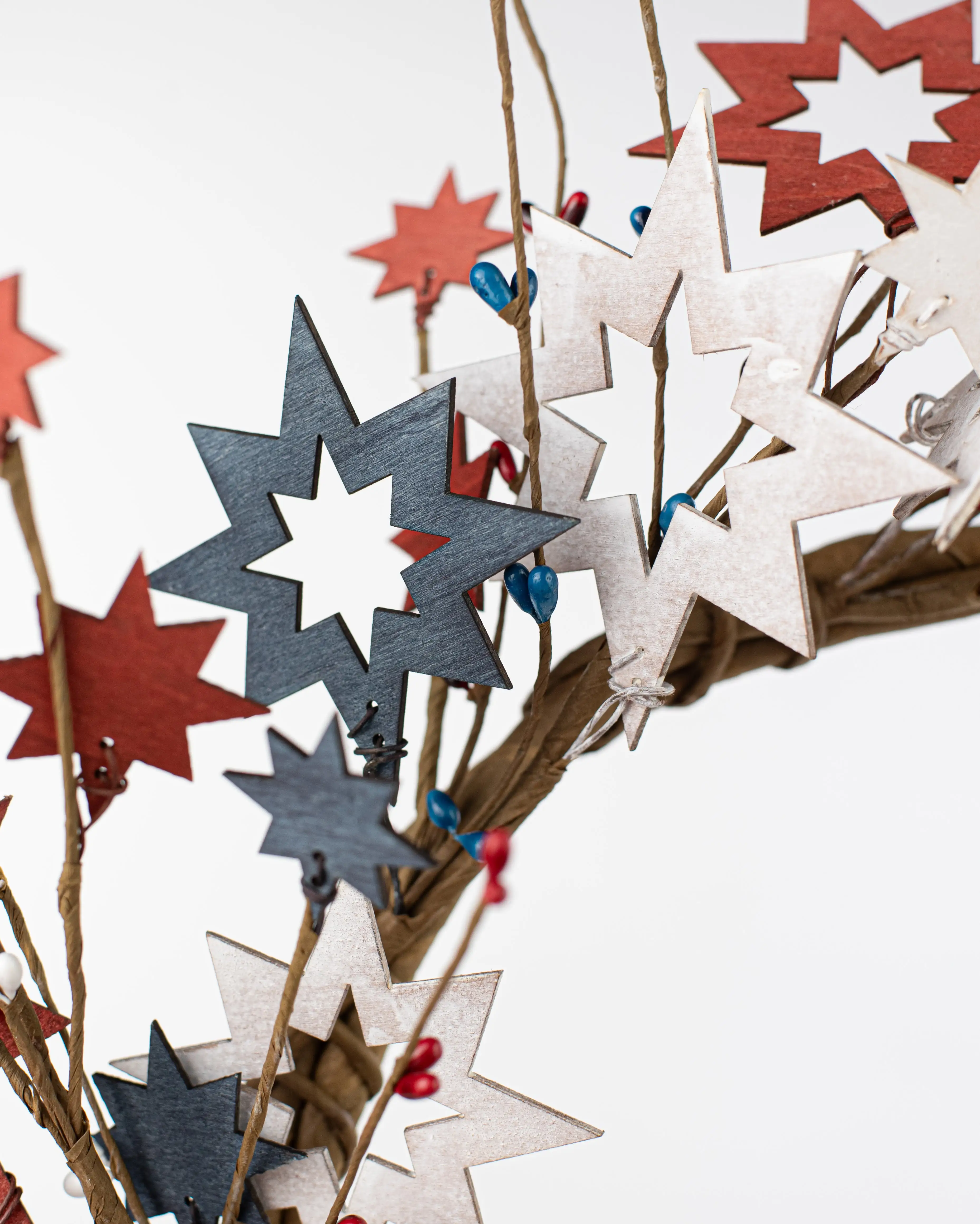 This wreath is full of wooden star cutouts that are like bursts of fireworks. The stars come in red, white and blue and are accompanied by pips in the same colors. The wooden stars and pips are bundled into sections that are easy to arrange.