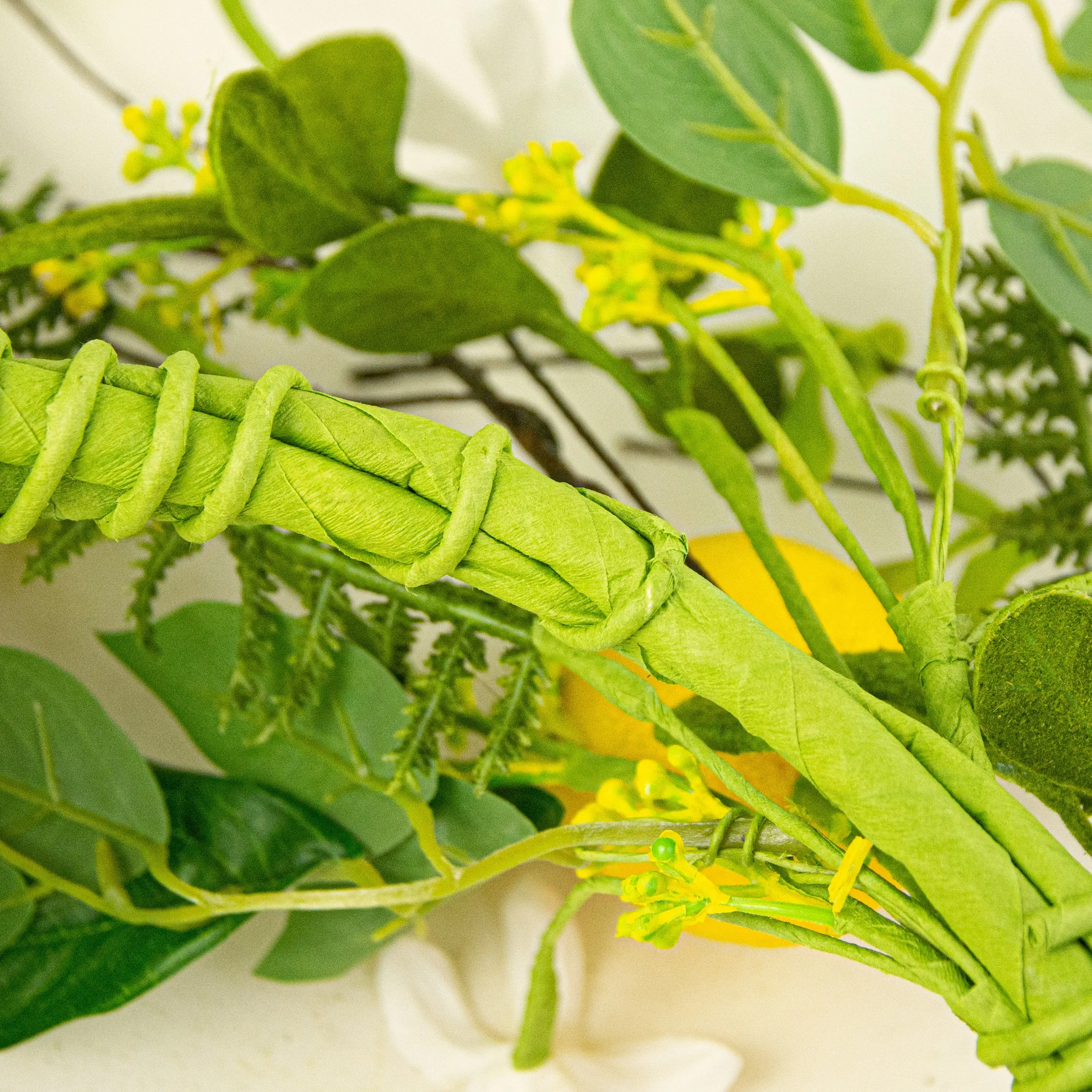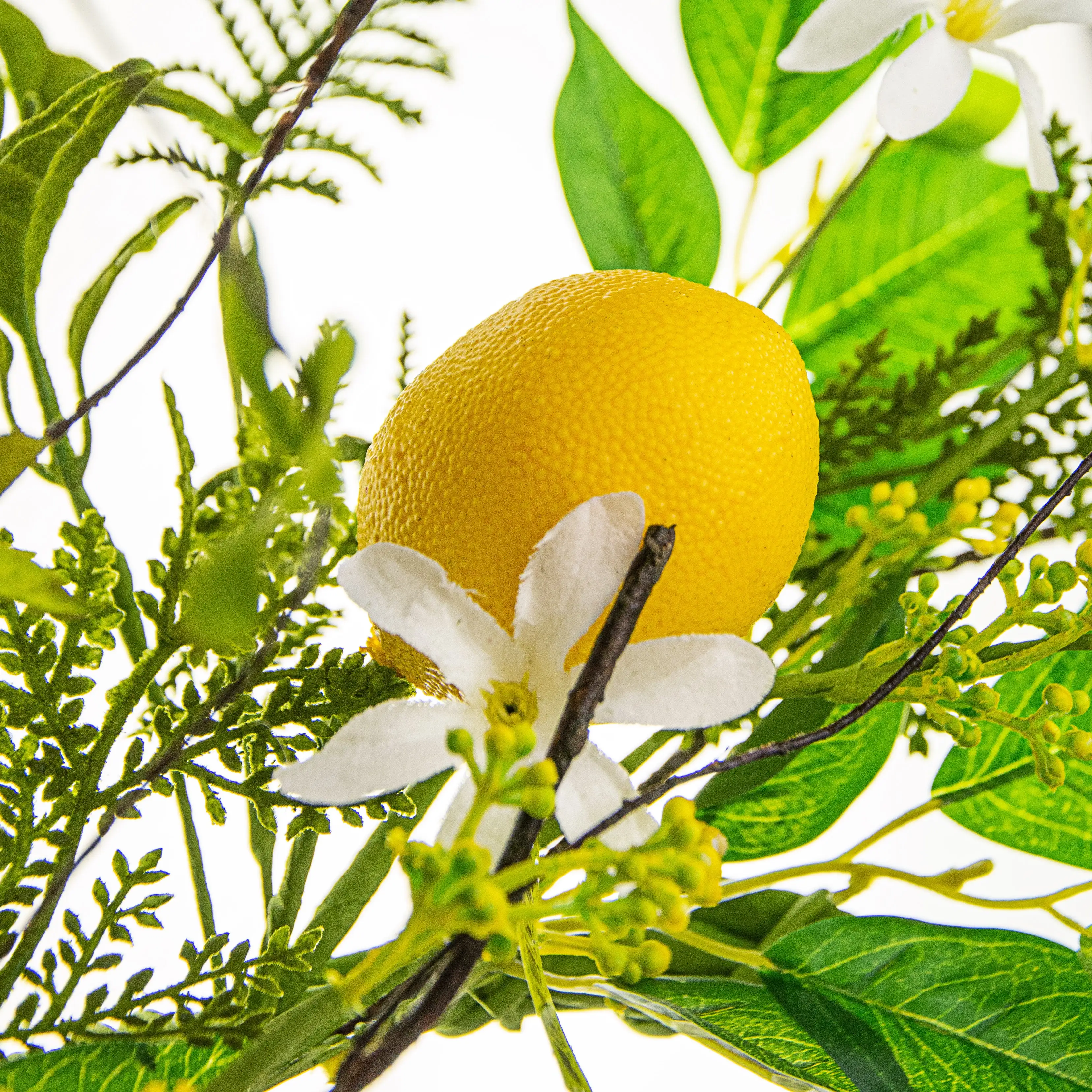 Wired arms filled with lightly flocked ferns, twigs, white flowers and life-sized lemons spiral out from a circular frame. Add a wooden monogram to the center and paint to match or hang it as is. Look for our matching garland and sprays.