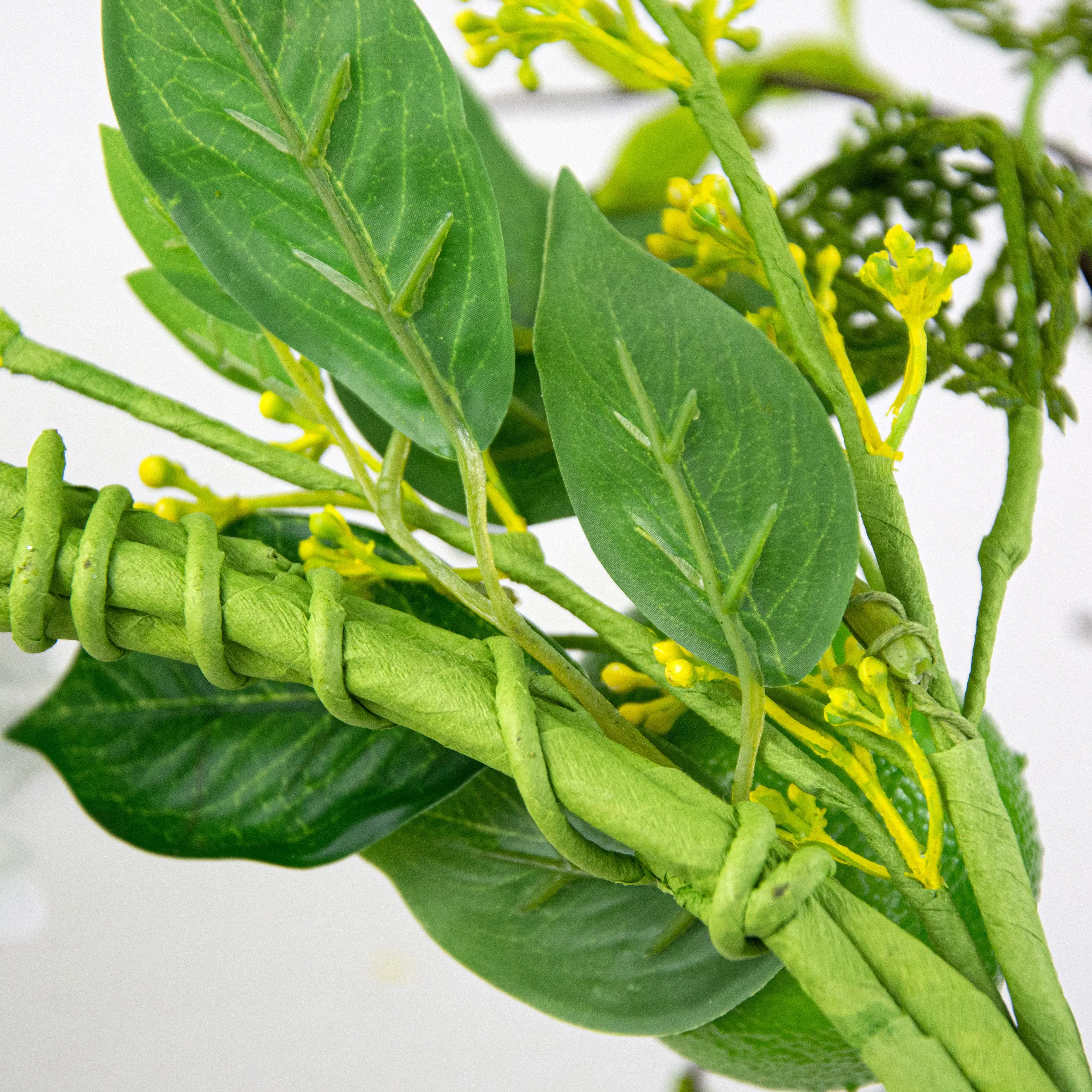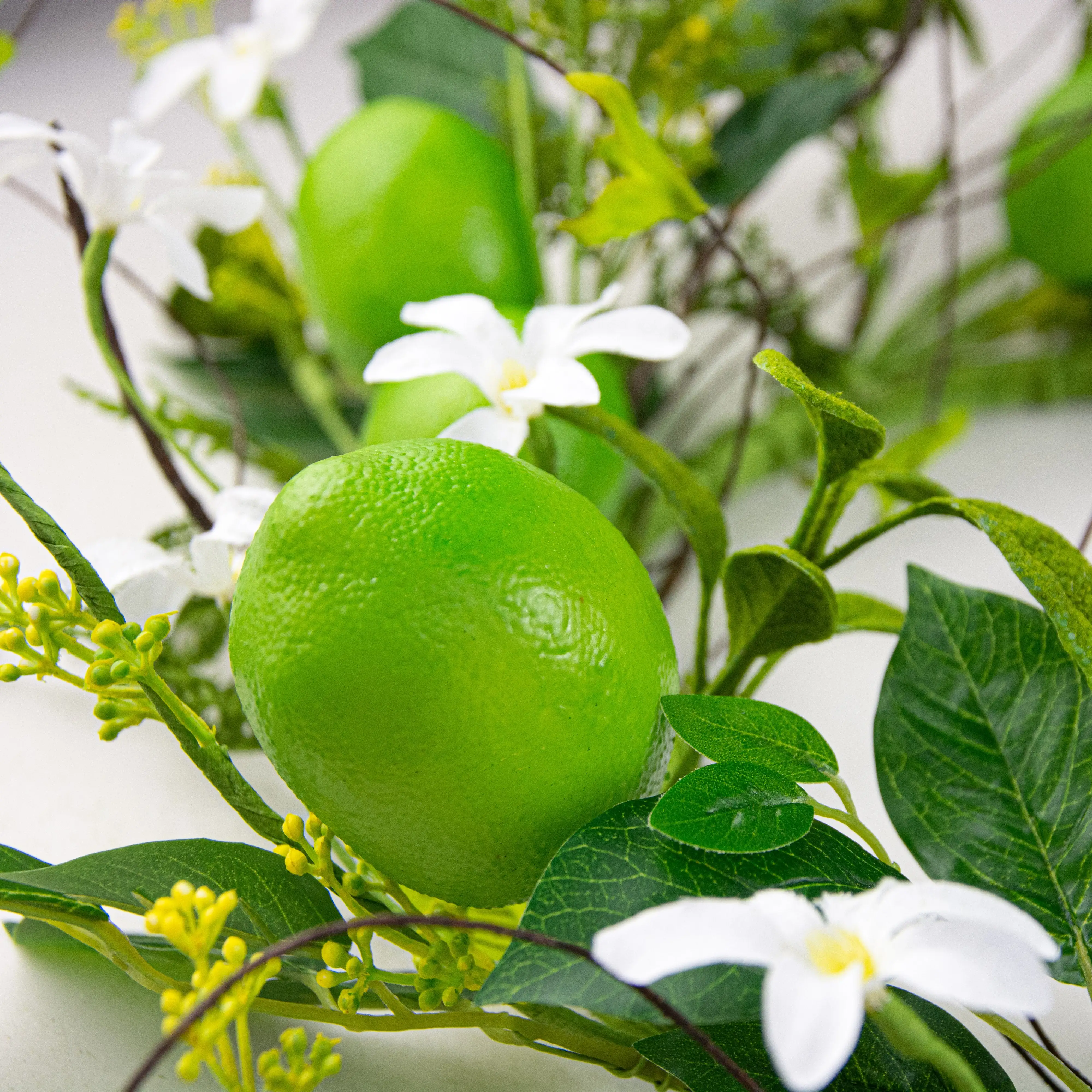 Wired arms filled with lightly flocked ferns, twigs, white flowers and life-sized limes spiral out from a circular frame. Add a wooden monogram to the center and paint to match or hang it as is.