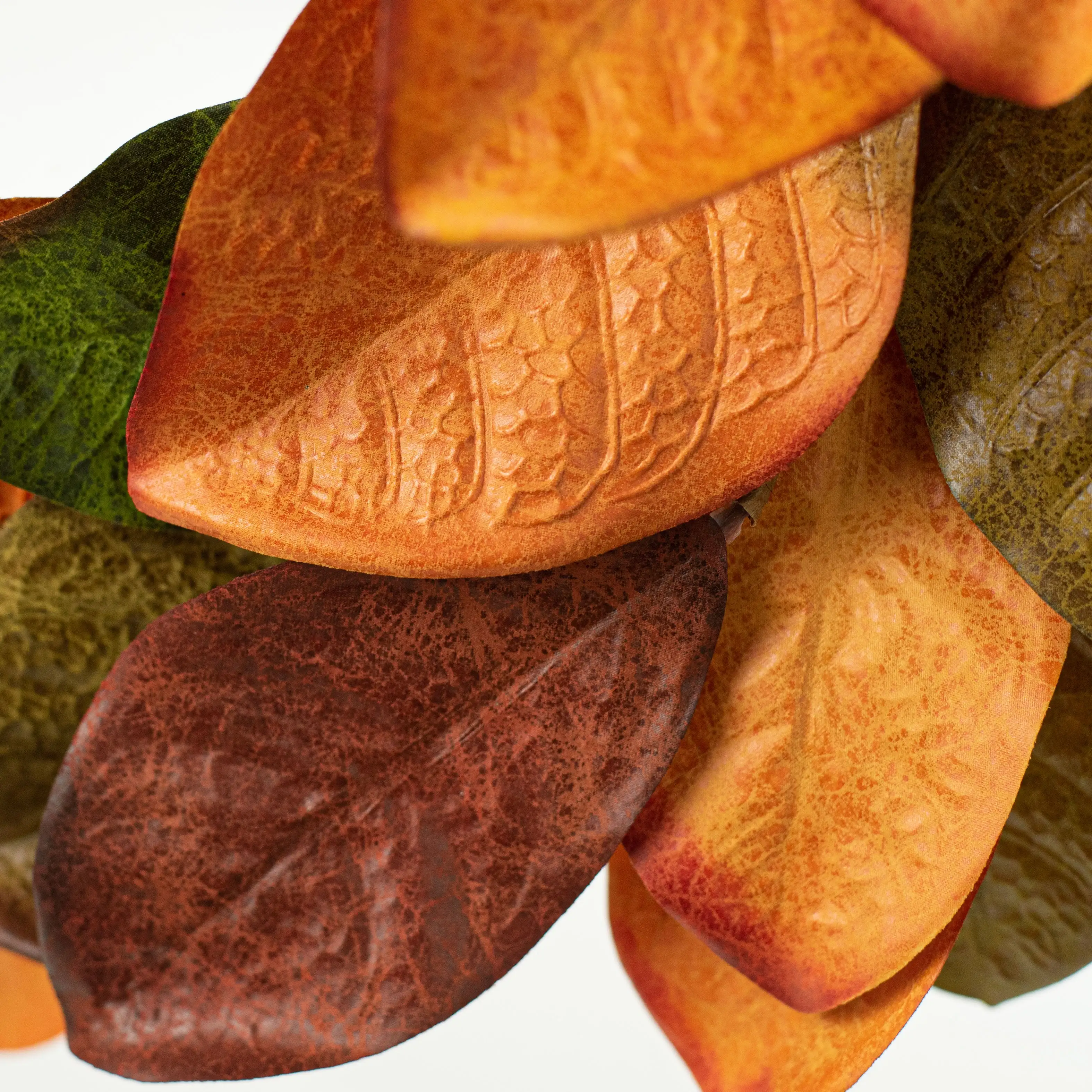 These polyester Magnolia leaves have a leathery look and a semi-gloss shine. Their colors variegate from olive green to orange to burgundy, making them a classic for fall. Each leaf is wired along its spine for shaping and is attached to a wired, circular base.