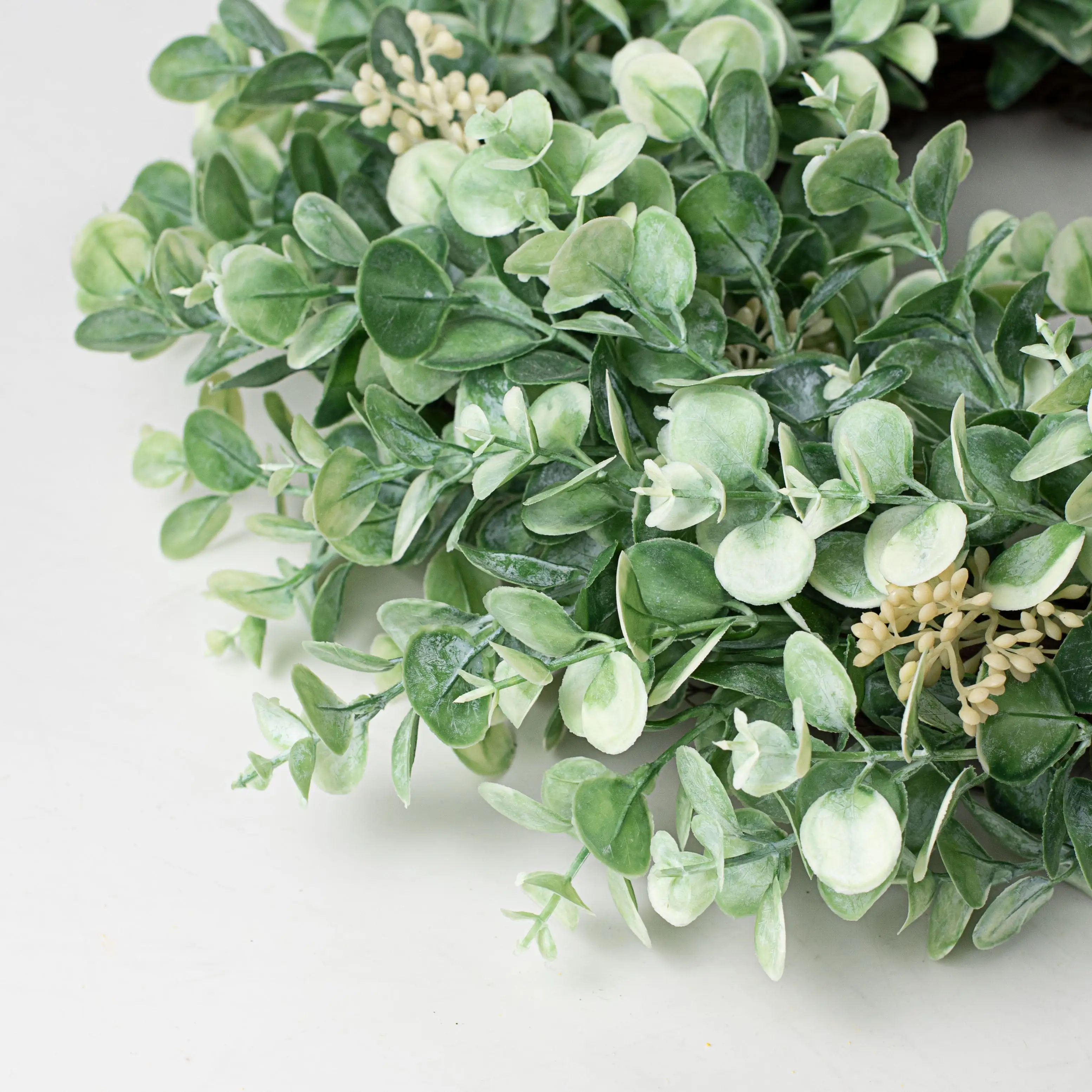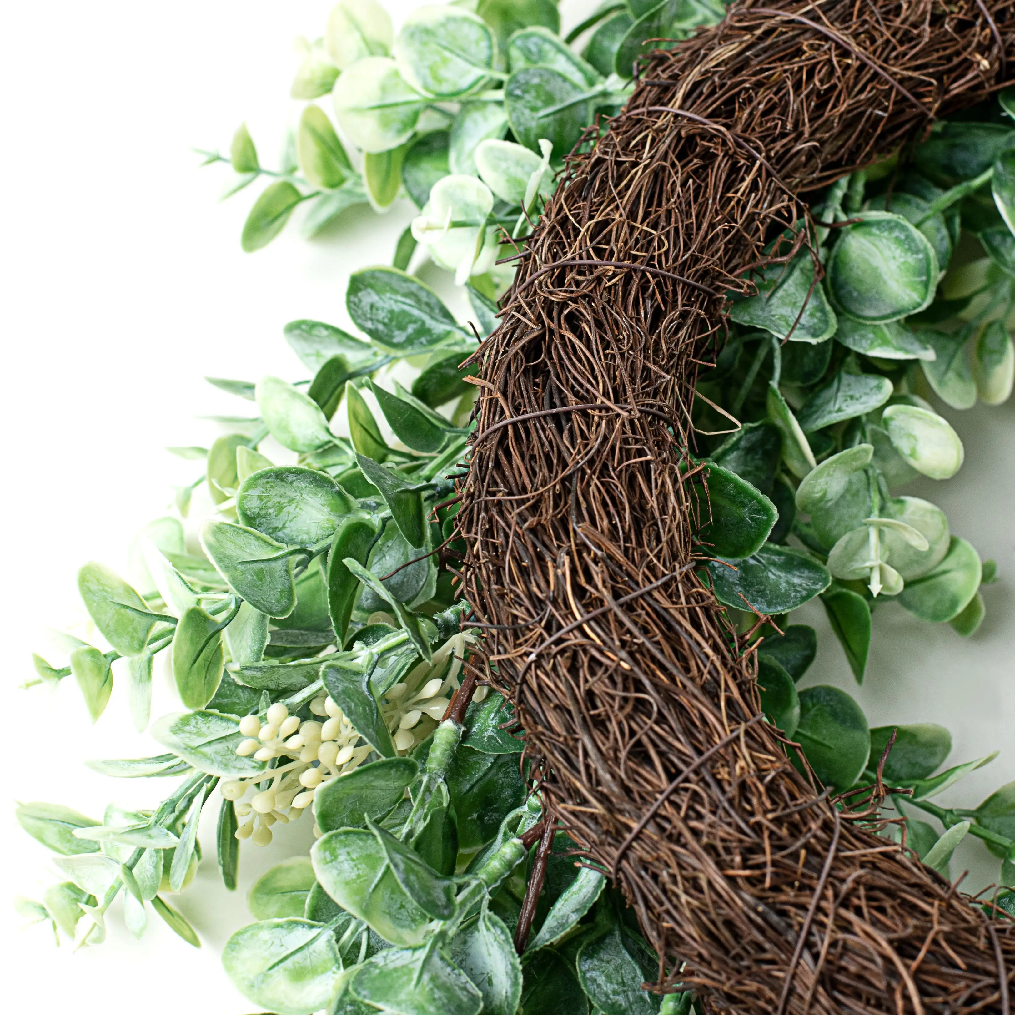 This fluffy eucalyptus wreath is build on a round, angel vine base. The leaves are variegated from cream to light green to dark green - the cream matches the seeds - and are attached with short wires, which means this wreath requires very little shaping.