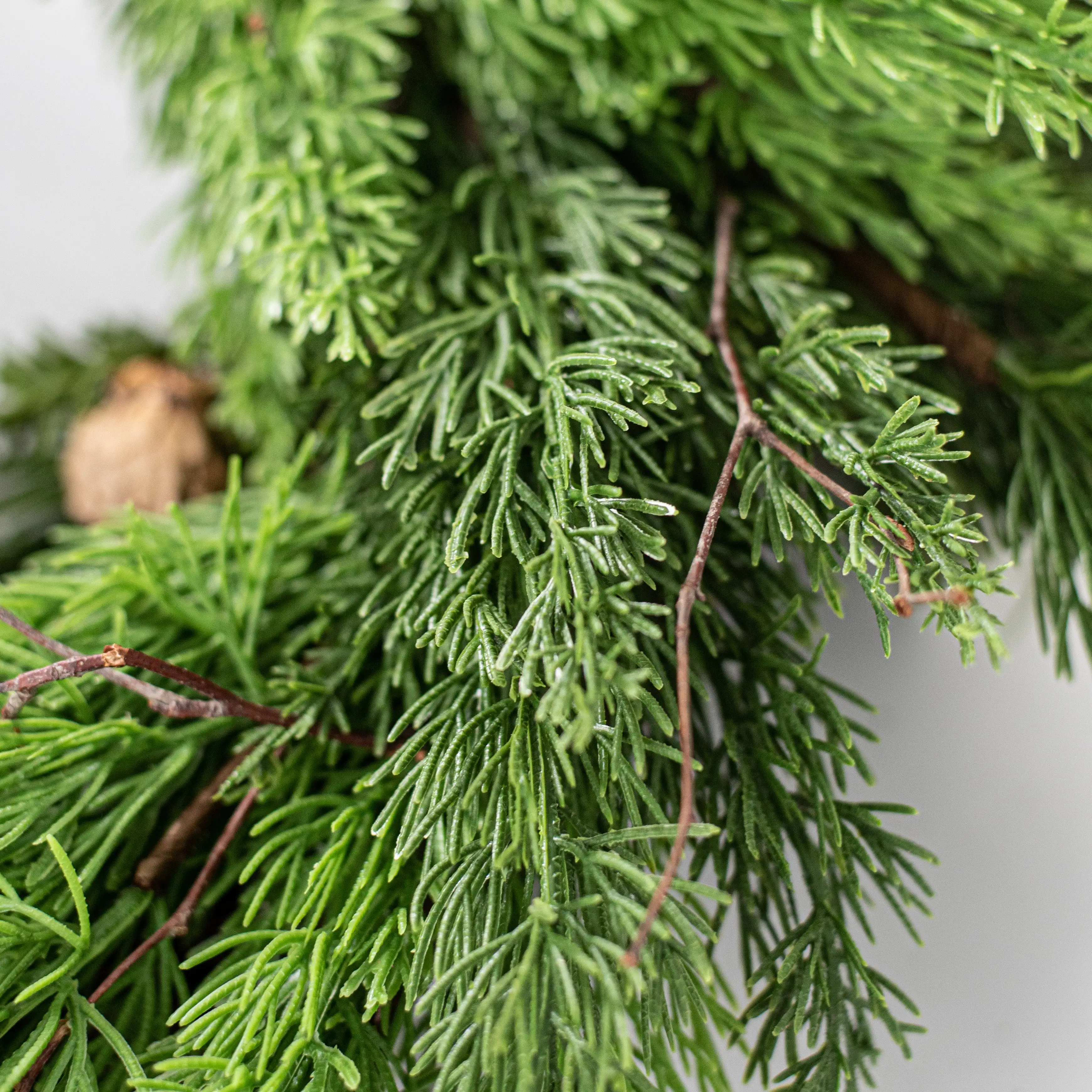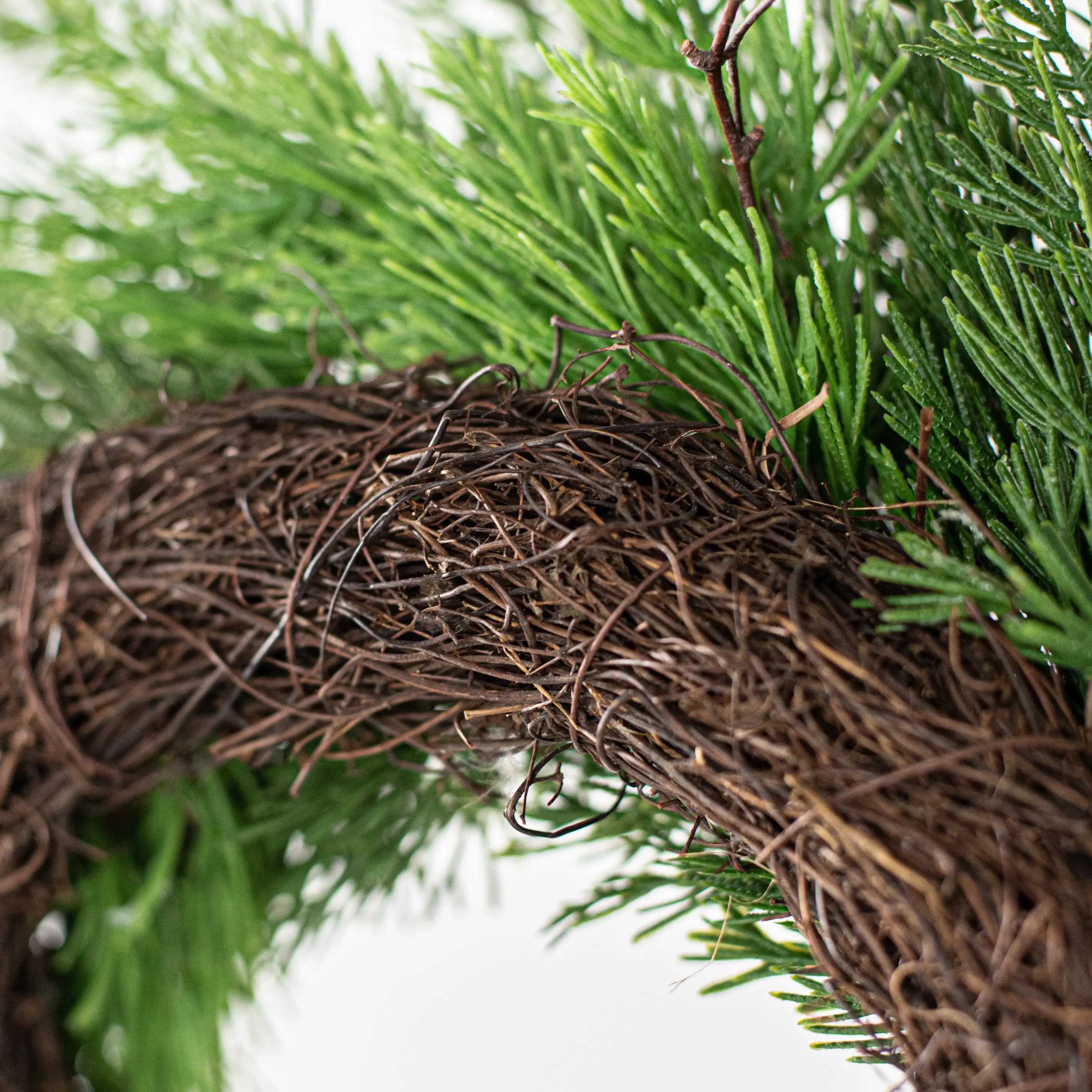 This lush cedar pine wreath is built on a thick angel vine base, giving it ample depth. The realistic pine alternates its two shades of green, and each section is wired for fluffing. Bare twigs are interspersed throughout.