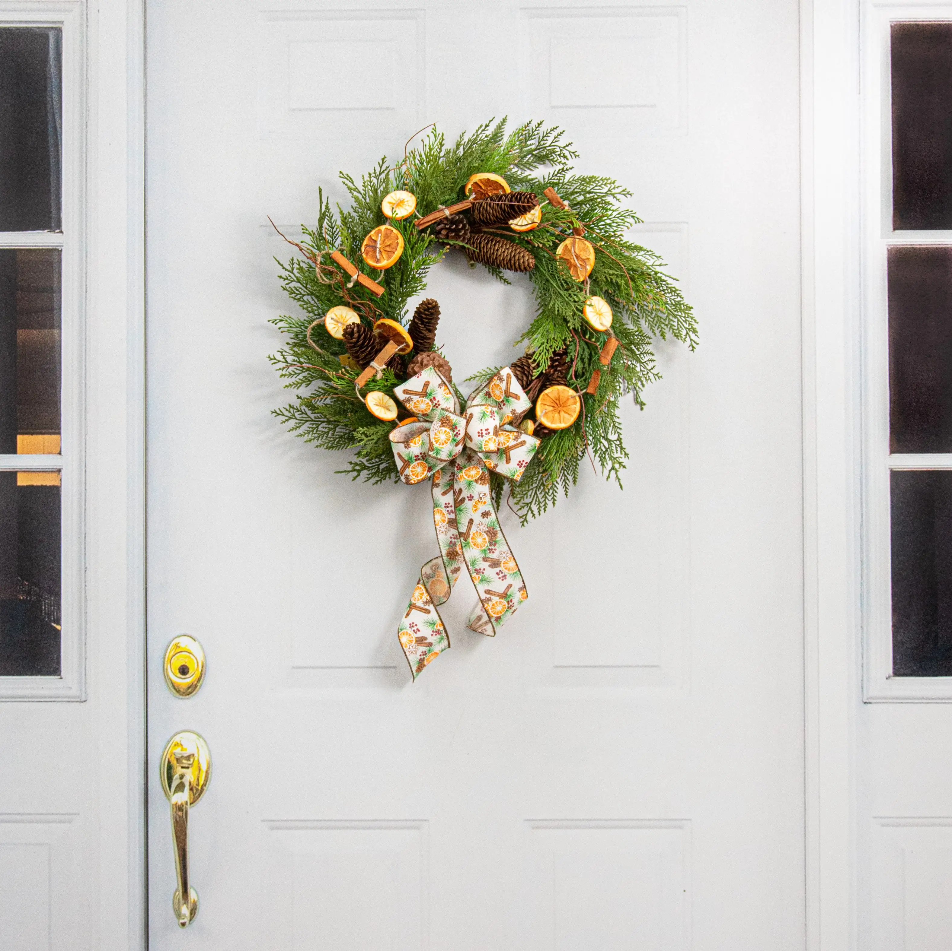 This feathery wreath mixes incense cedar pine in two shades of green, naked twigs and pinecones. Each piece of pine is wired along its spine for shaping. Use alone or add accents like our "5' Orange, Lemon, Cinnamon Garland" and "2.5" Linen Holly, Dried Fruits, Cinnamon Ribbon."