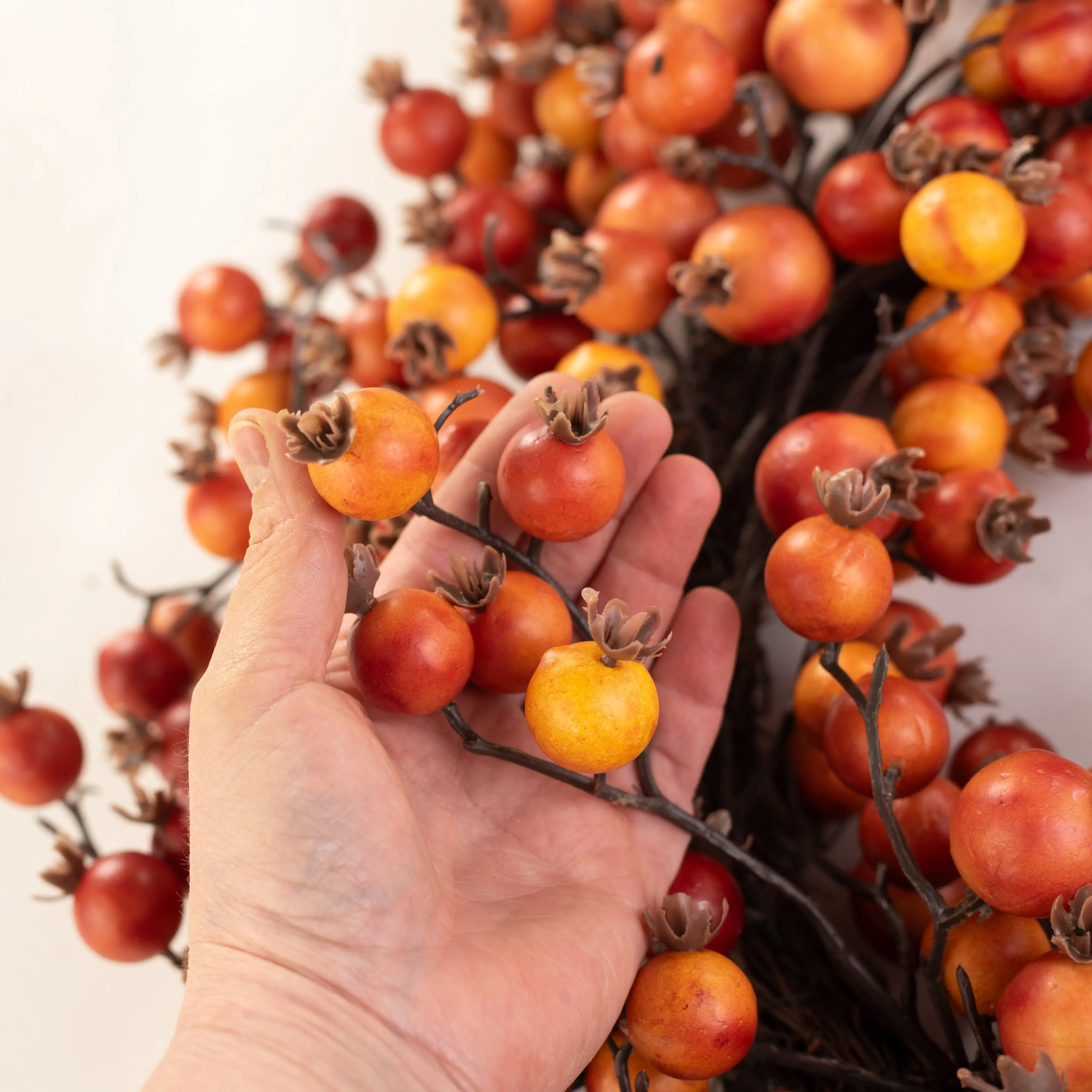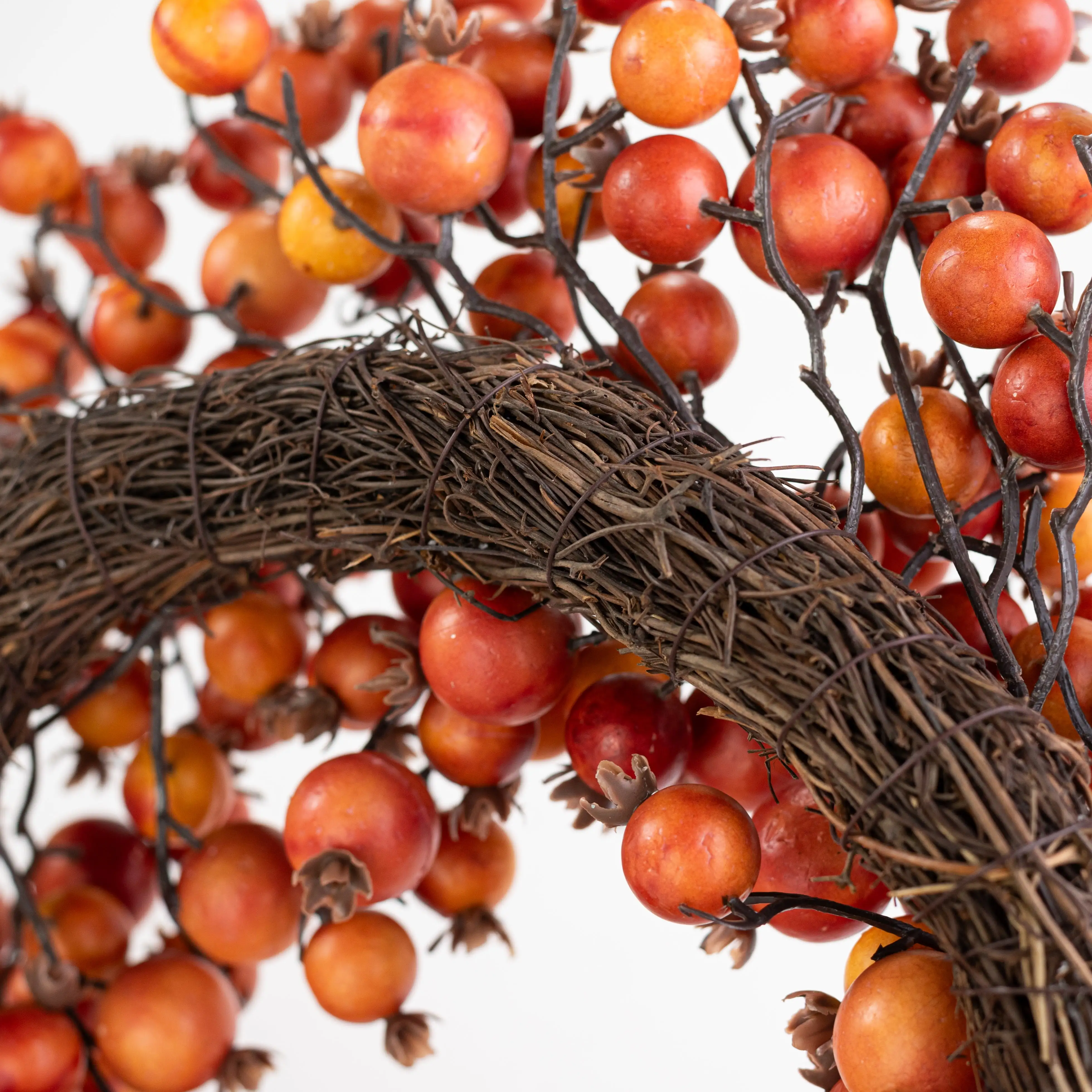 This wreath has a round angel vine base that is covered with foam berry sprays. The berries vary in size and have variegated coloring in shades of orange. Use as-is or add a simple bow for easy fall decorating.