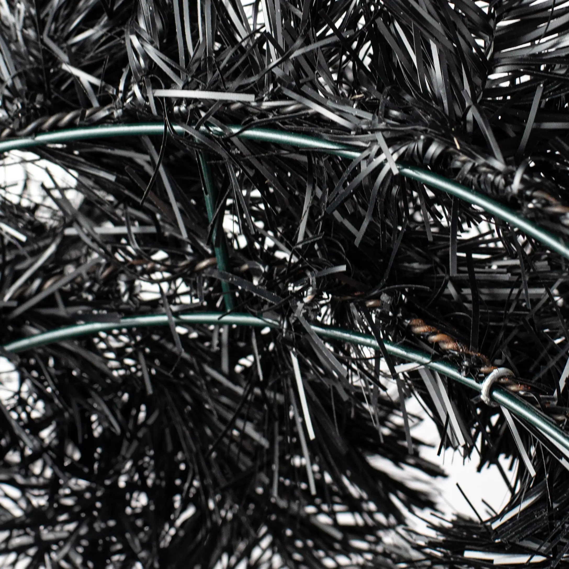 This wreath is made with solid black PVC pine. Each of the PVC pine sprigs is wired for shaping, which makes adding ribbon and accessories a snap. The wreath is built on a metal frame. It's great for Halloween but can also produce dramatic results for Christmas and Valentine's Day projects.