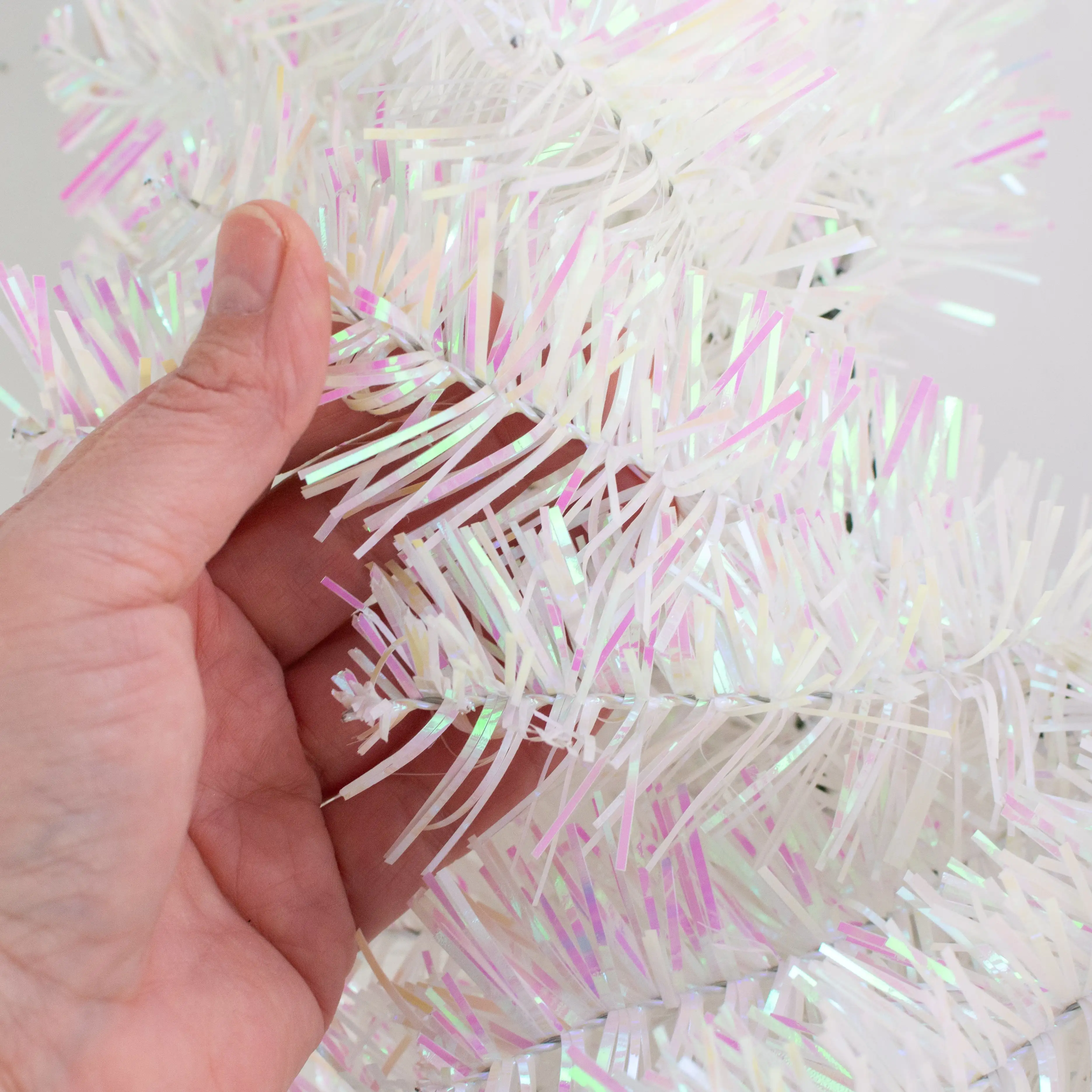 This wreath is made with white, iridescent PVC pine. Each of the PVC pine sprigs is wired for shaping, which makes adding ribbon and accessories a snap. The wreath is built on a metal frame. It's great for spring, Valentine's Day, Easter and Christmas projects.