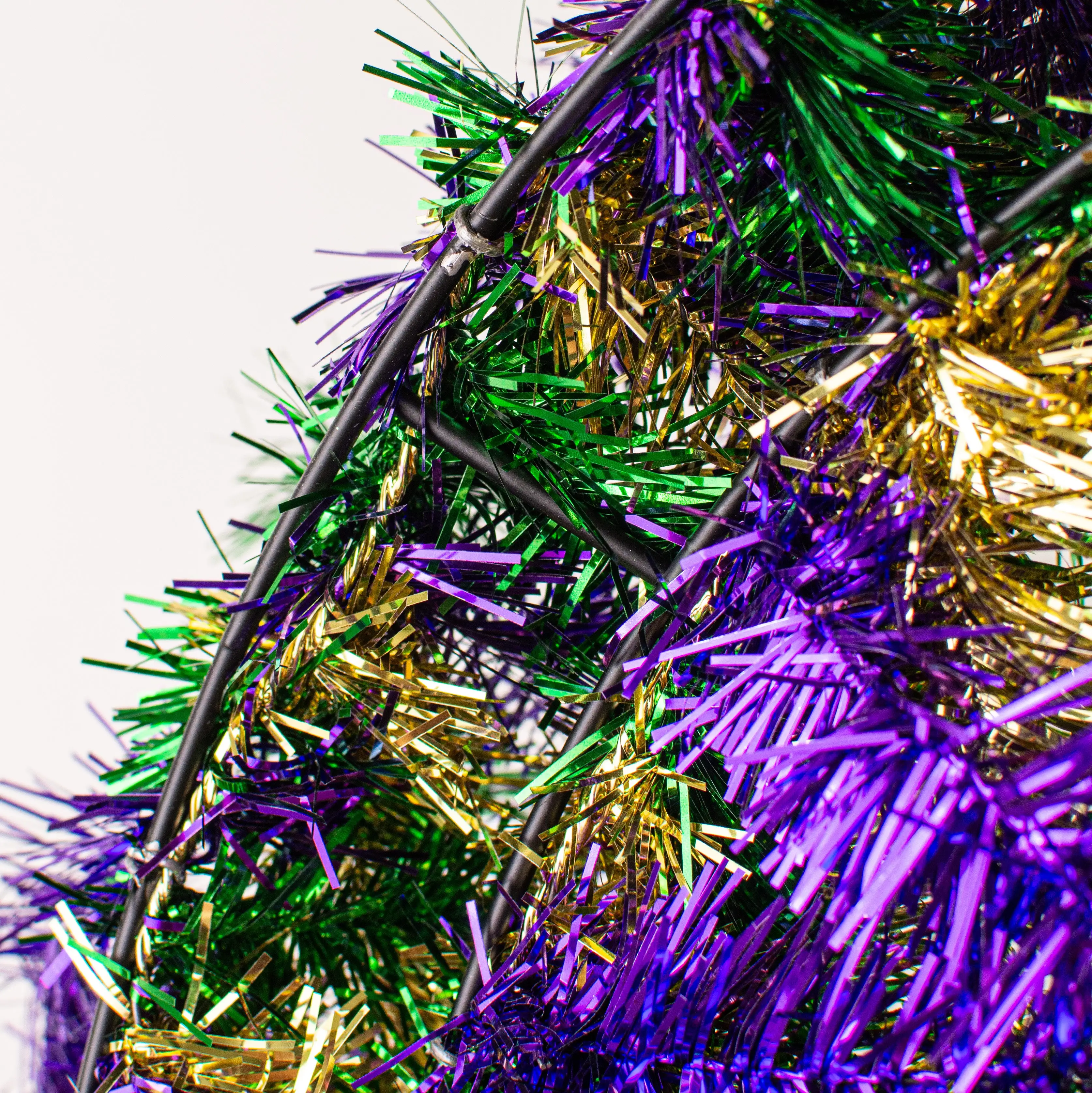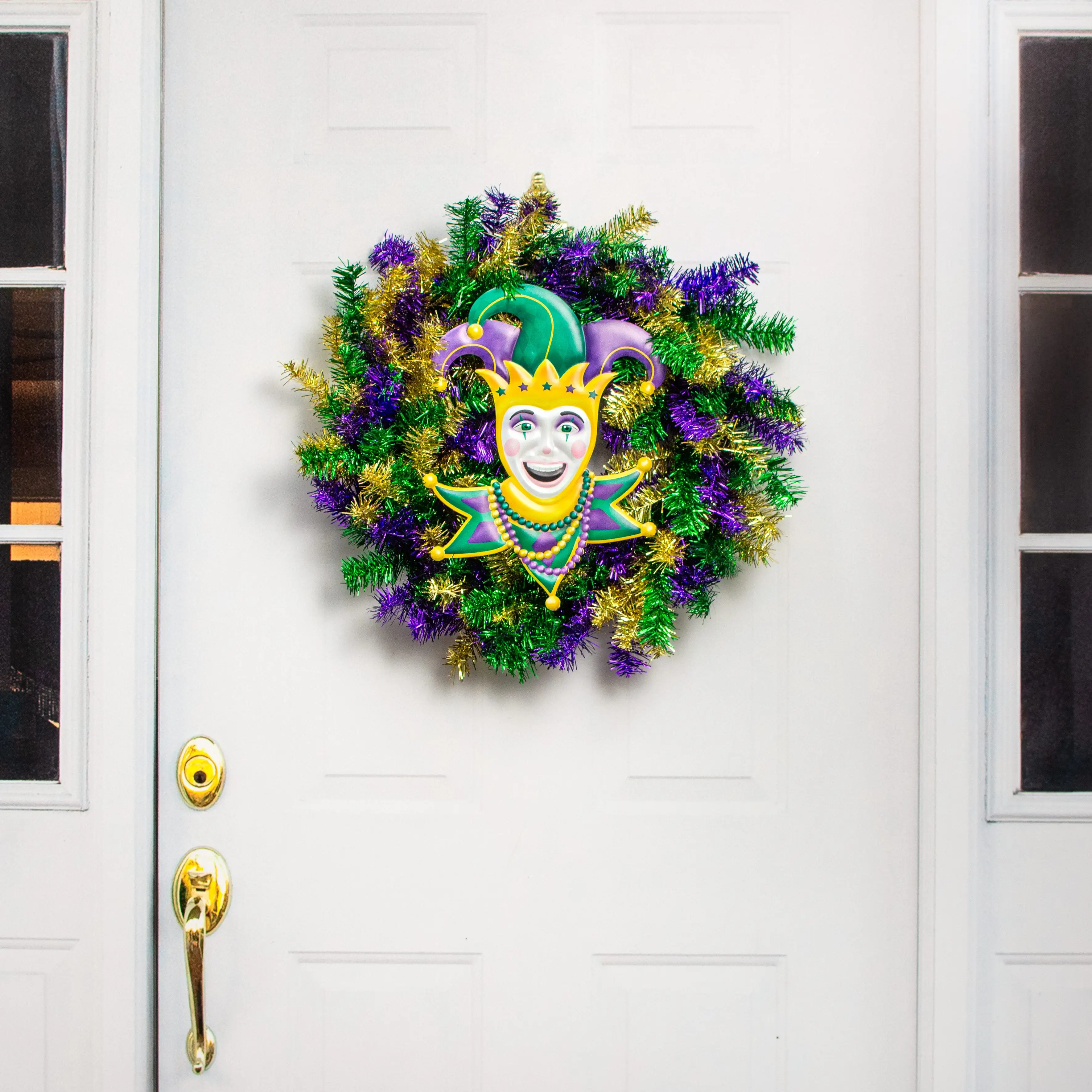 This wreath has a metal base covered in tinsel pine. The shiny purple, green and gold pieces are blended together for a festive Mardi Gras look. Each piece is wired, so attaching decorations like our 15" Metal Embossed Sign: Mardi Gras Jester Head is a snap.