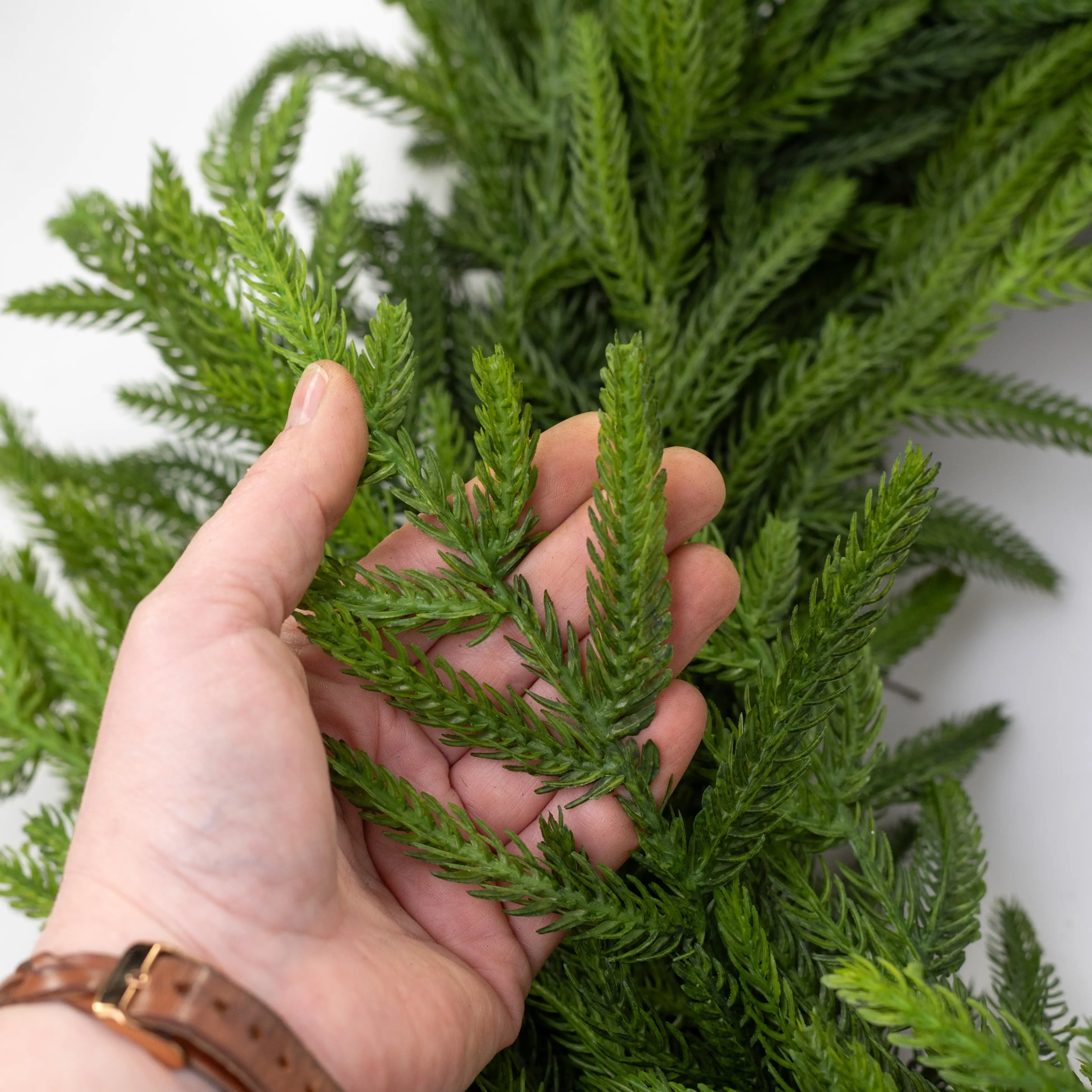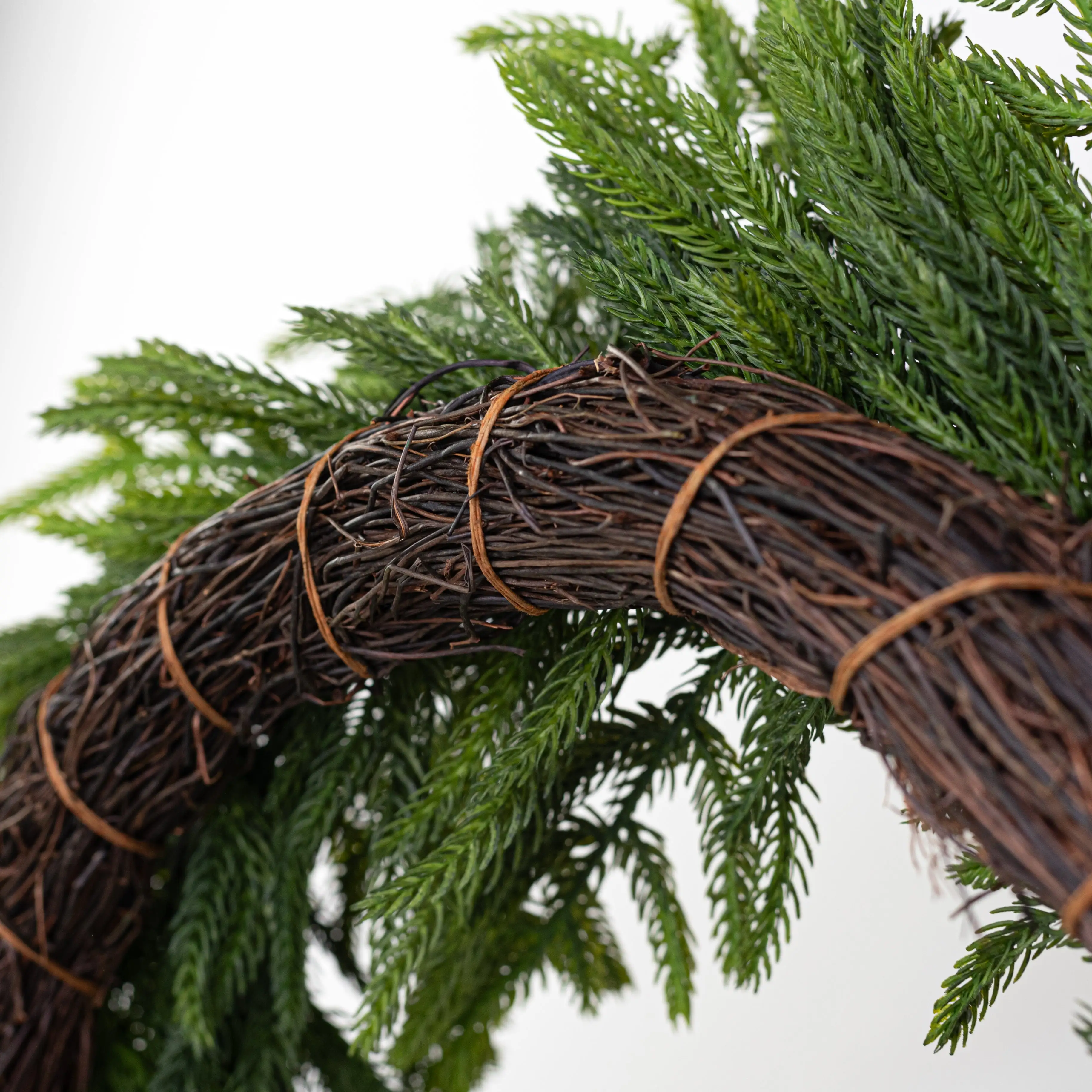 This beautiful wreath has a grape vine base loaded with real touch Norfolk pine. These pine pieces are soft to the touch with sturdy wire in their spines. You can let them lay flat or give them a little arc to create volume. The coloring is also lifelike, with variations from dark to light green.