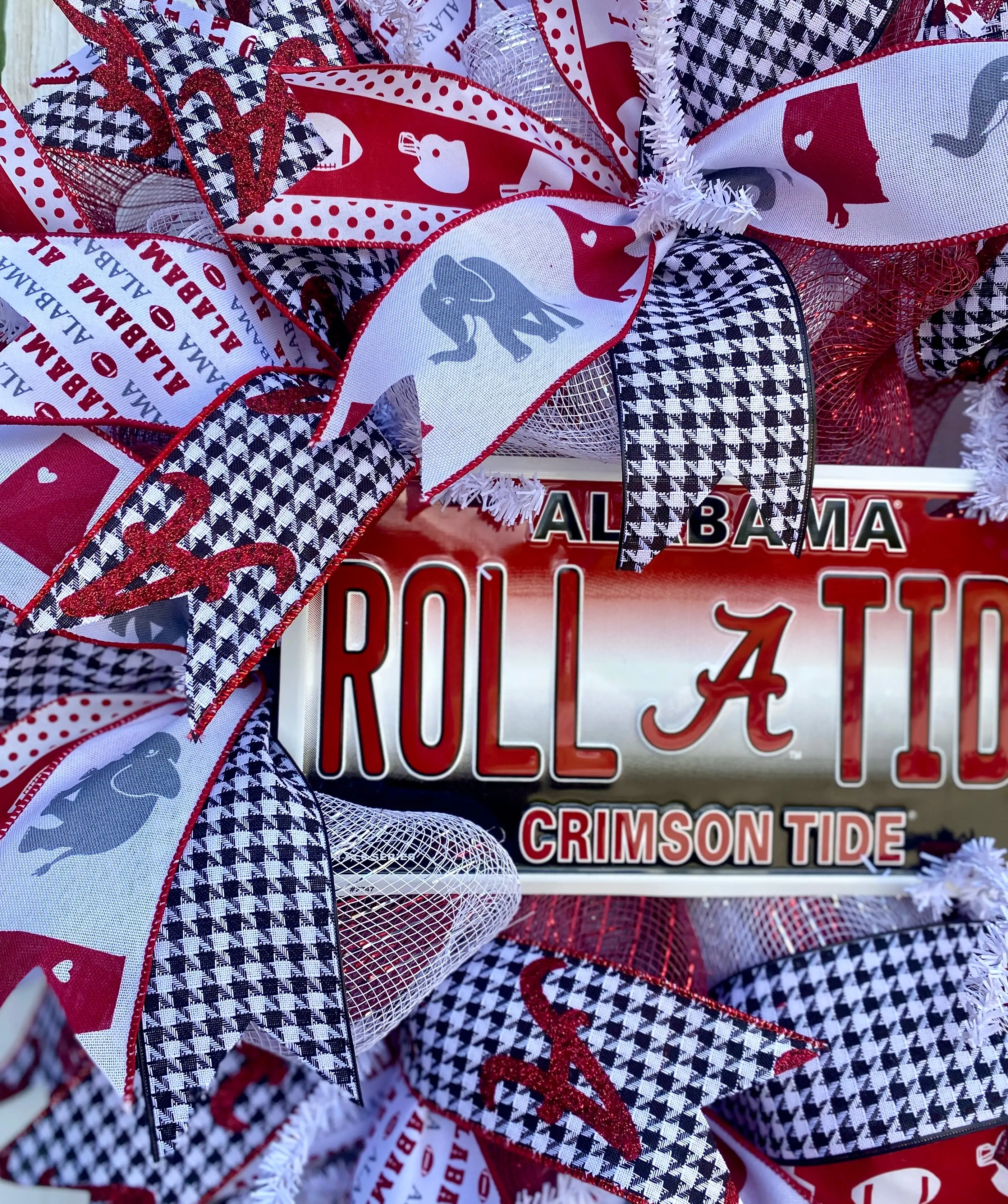 Showcase your Alabama pride with this vibrant mesh ribbon wreath! Crafted with crimson and white ribbons adorned with elephant icons, houndstooth patterns, and the iconic 'Roll Tide' slogan, it's the perfect front door decoration for game days or year-round. The intricate design features layers of curled ribbons that create a full, dimensional look. Hang it on your door, wall, or above the mantel to bring the spirit of the Crimson Tide into your home. Measuring approximately 24 inches in diameter, this wreath makes a bold statement. Whether you're hosting a watch party or simply showing your team spirit, it's a must-have for any devoted Alabama fan.