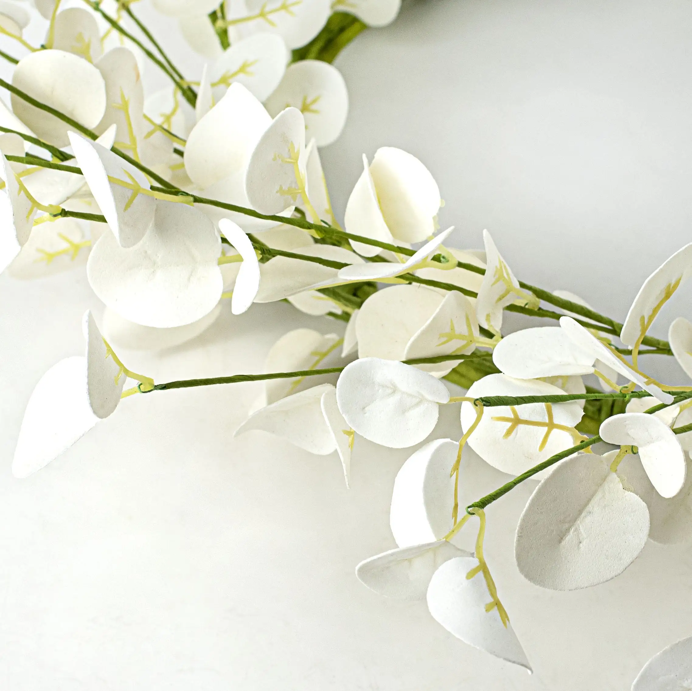 This wreath takes popular silver dollar eucalyptus and transforms it into a crisp neutral that can be incorporated into any home decor. Green leaves have been replaced by white ones made of soft-to-the-touch foam. Spread out the arms for an airy look or keep clustered close together for a full look.