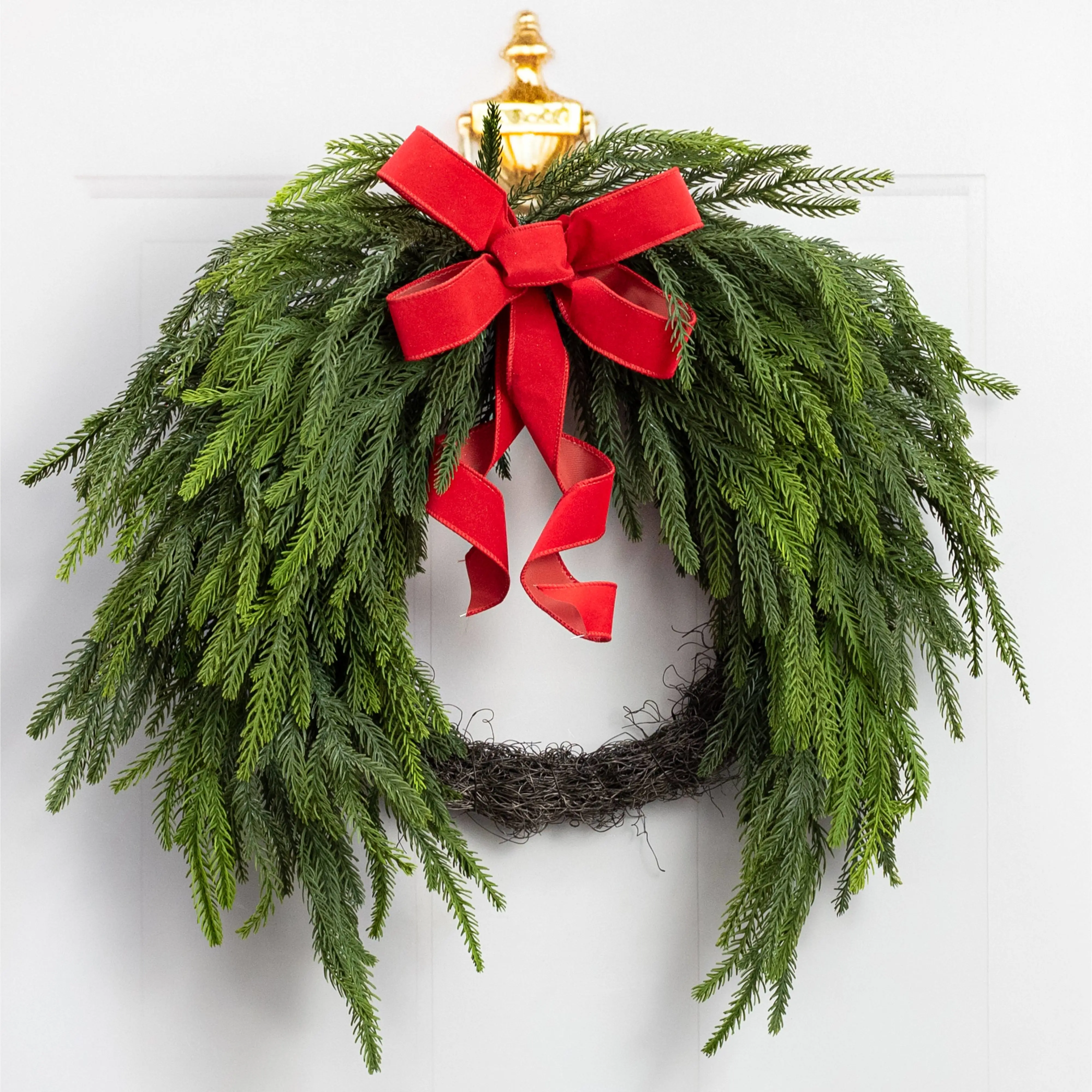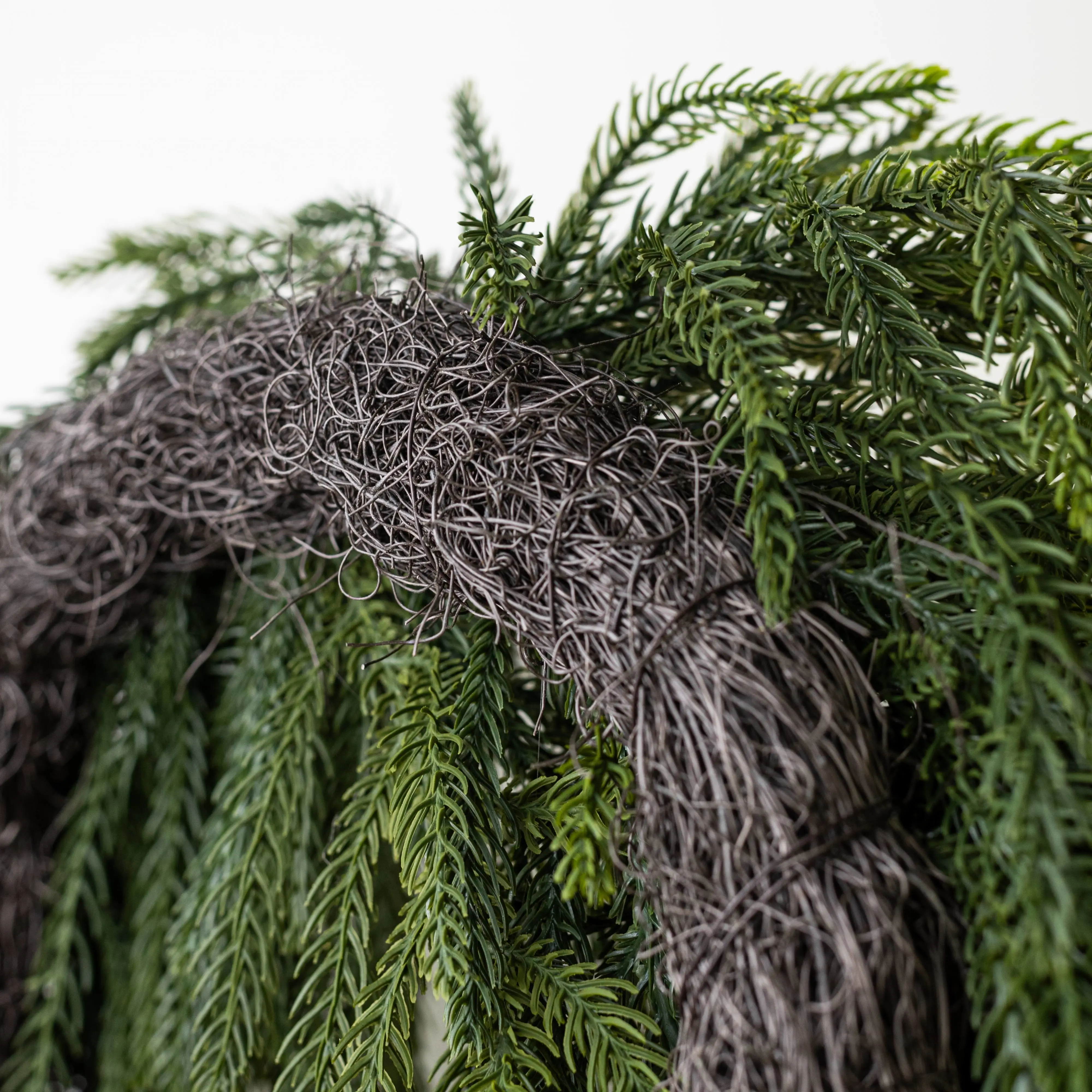 Ample pieces of variegated green willow pine are layered over each other and draped like a swag over an angel vine base. The wired pieces flow left and right, leaving a spot in the center for a bow or cluster of ornaments.