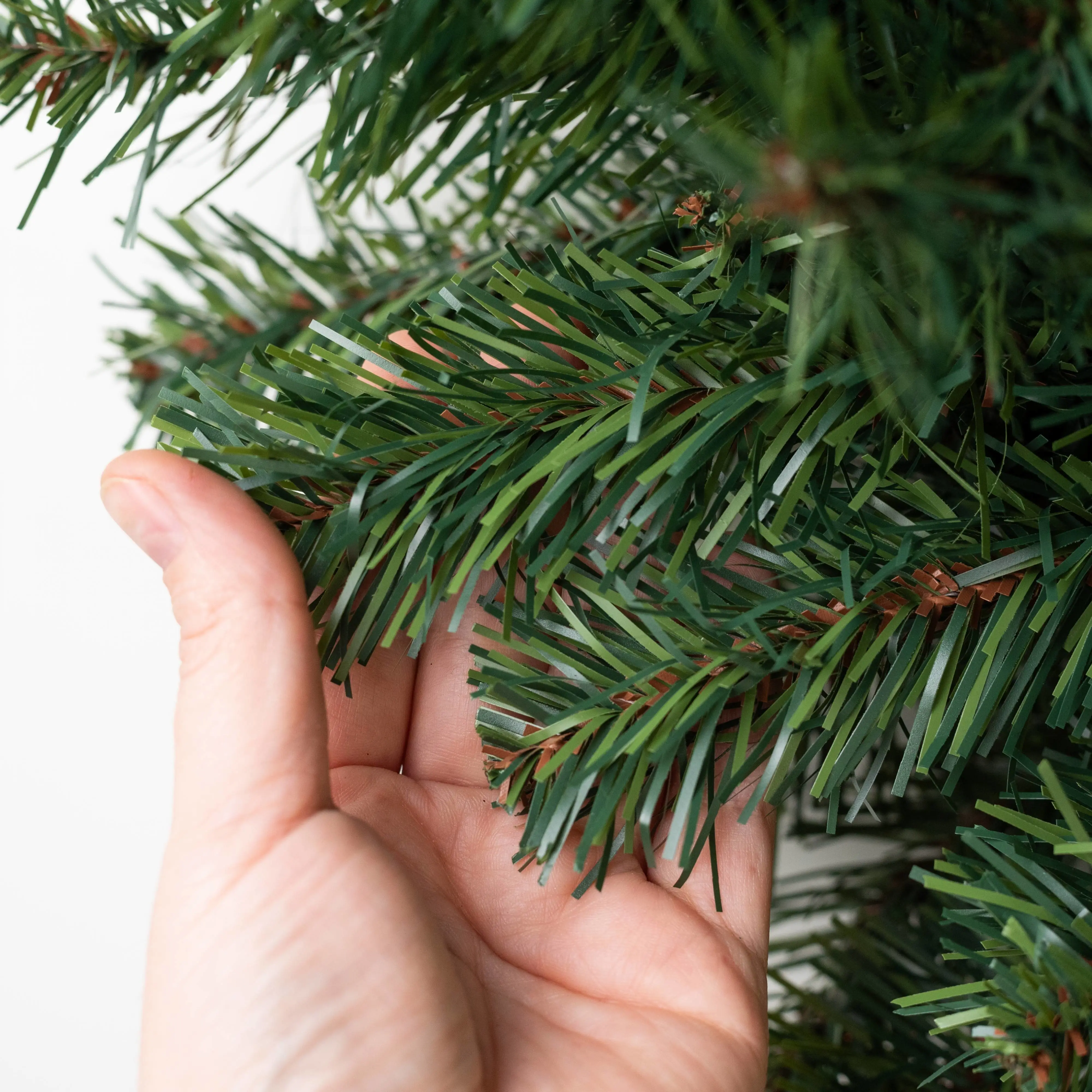 This wreath is made with two-tone green PVC pine. Each of the PVC pine sprigs is wired for shaping, which makes adding ribbon and accessories a snap. The wreath is built on a metal frame.