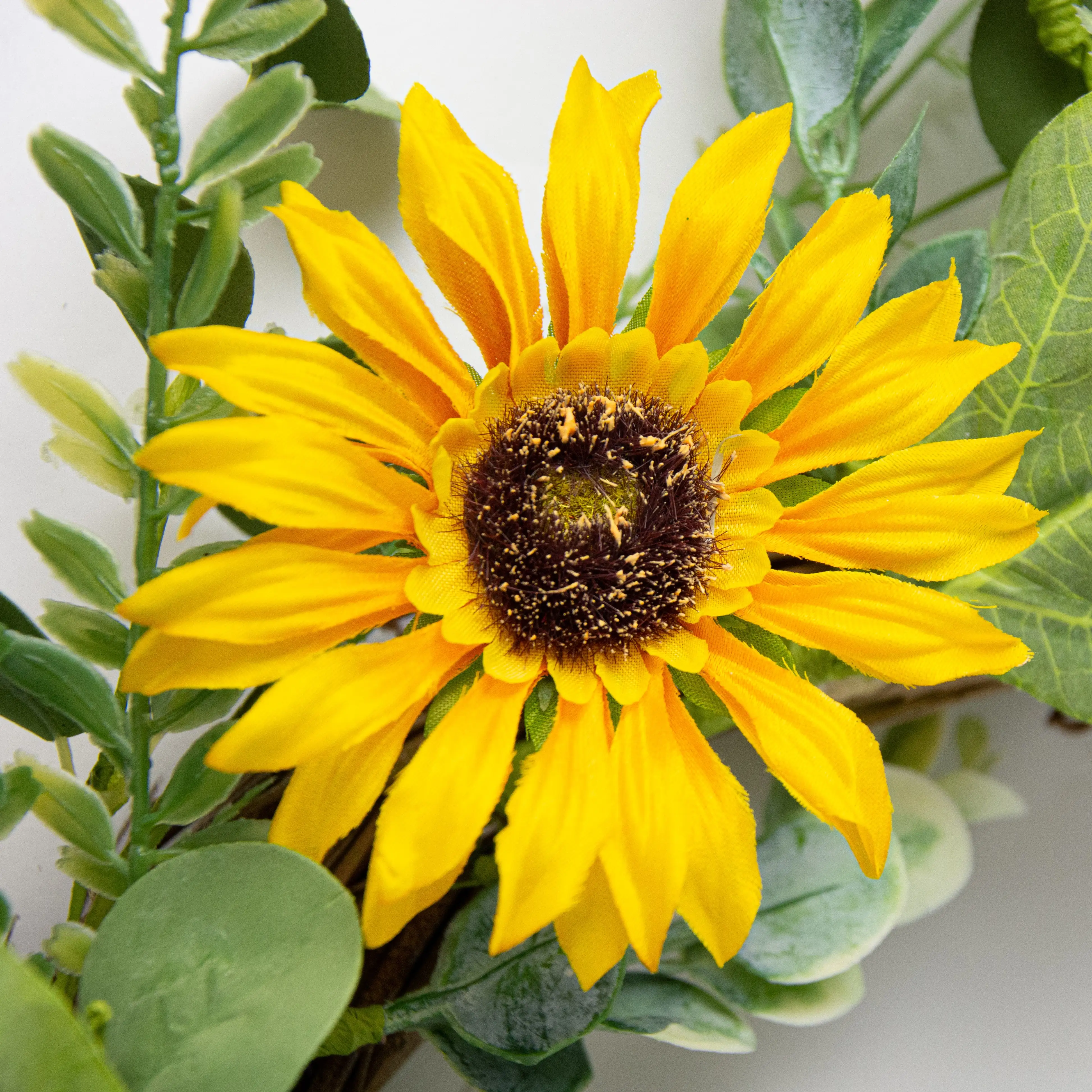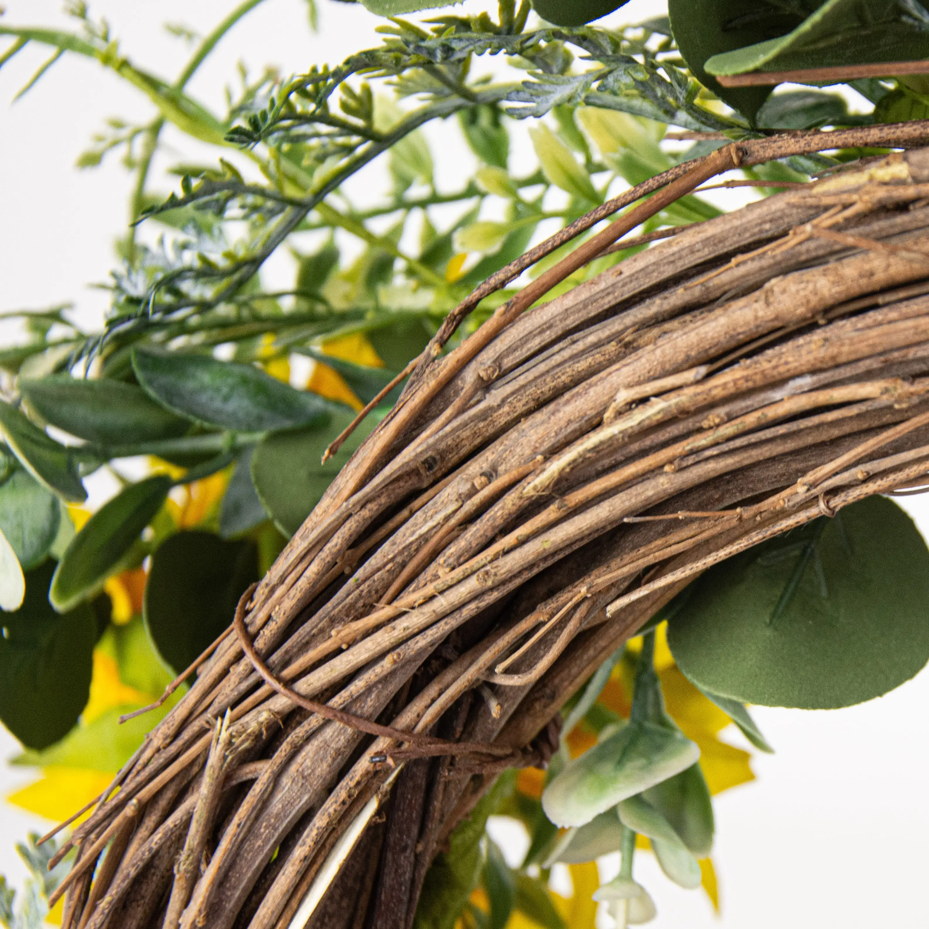 This delightful, ready-to-hang wreath has the youthful wispiness of wildflowers and the cheerfulness of late summer sunflowers making it a seasonal favorite from spring through fall. The earthy grapevine base holds life-sized sunflowers, plastic ferns, eucalyptus, and silk leaves. Add a painted monogram in the center to personalize or hang as is.