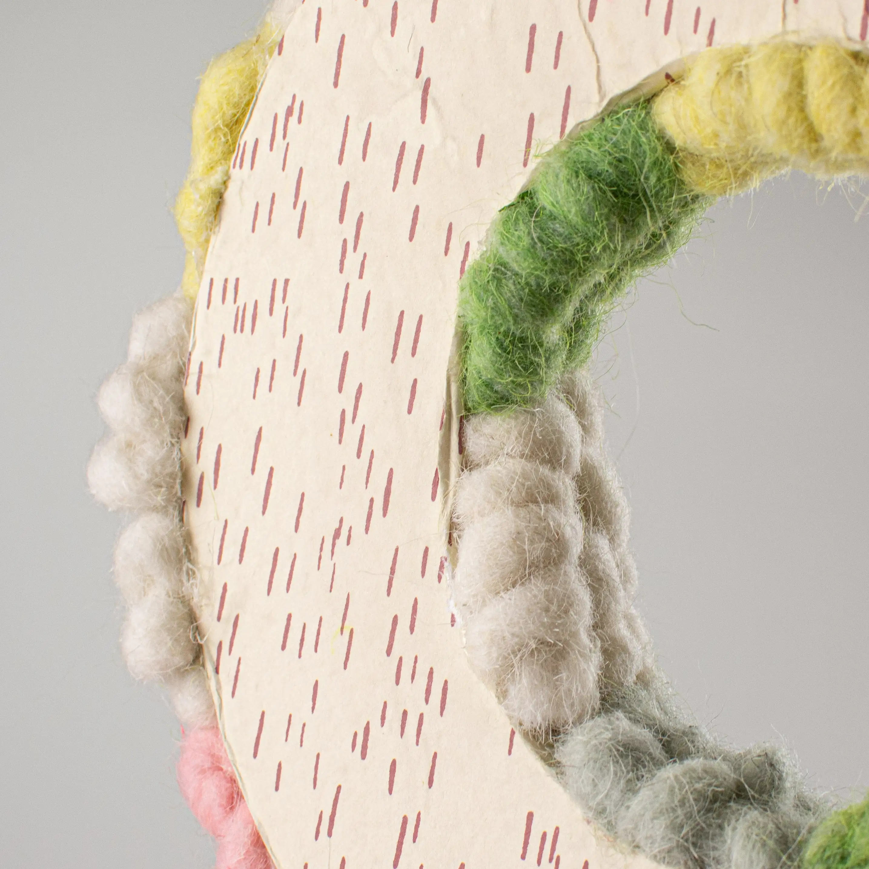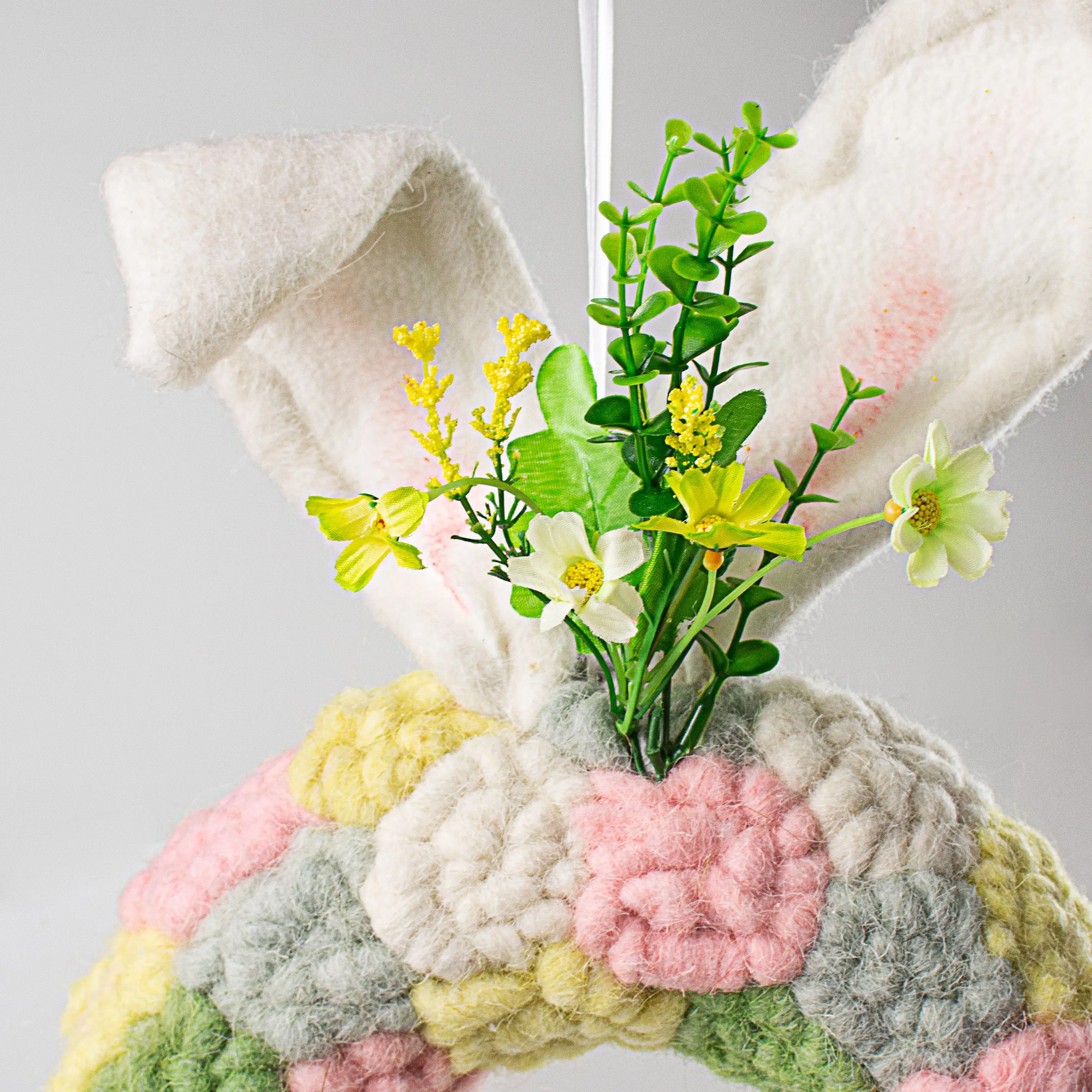 This domed, foam wreath is covered in a patchwork of felted wool pompoms clustered into floral shapes. A pair of white, wired bunny ears are accented by flowers and eucalyptus at the top while a pink felted bow accents the bottom.