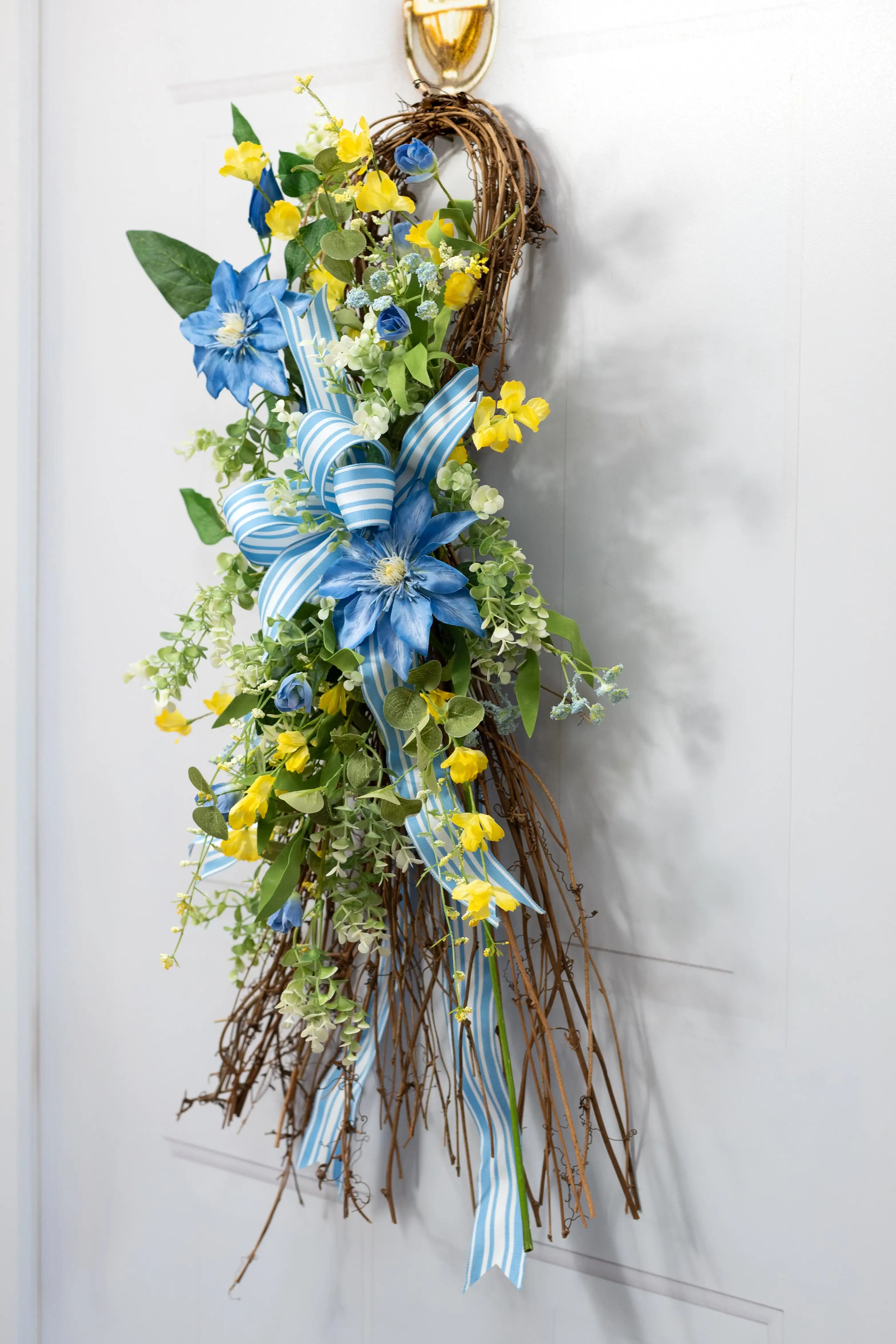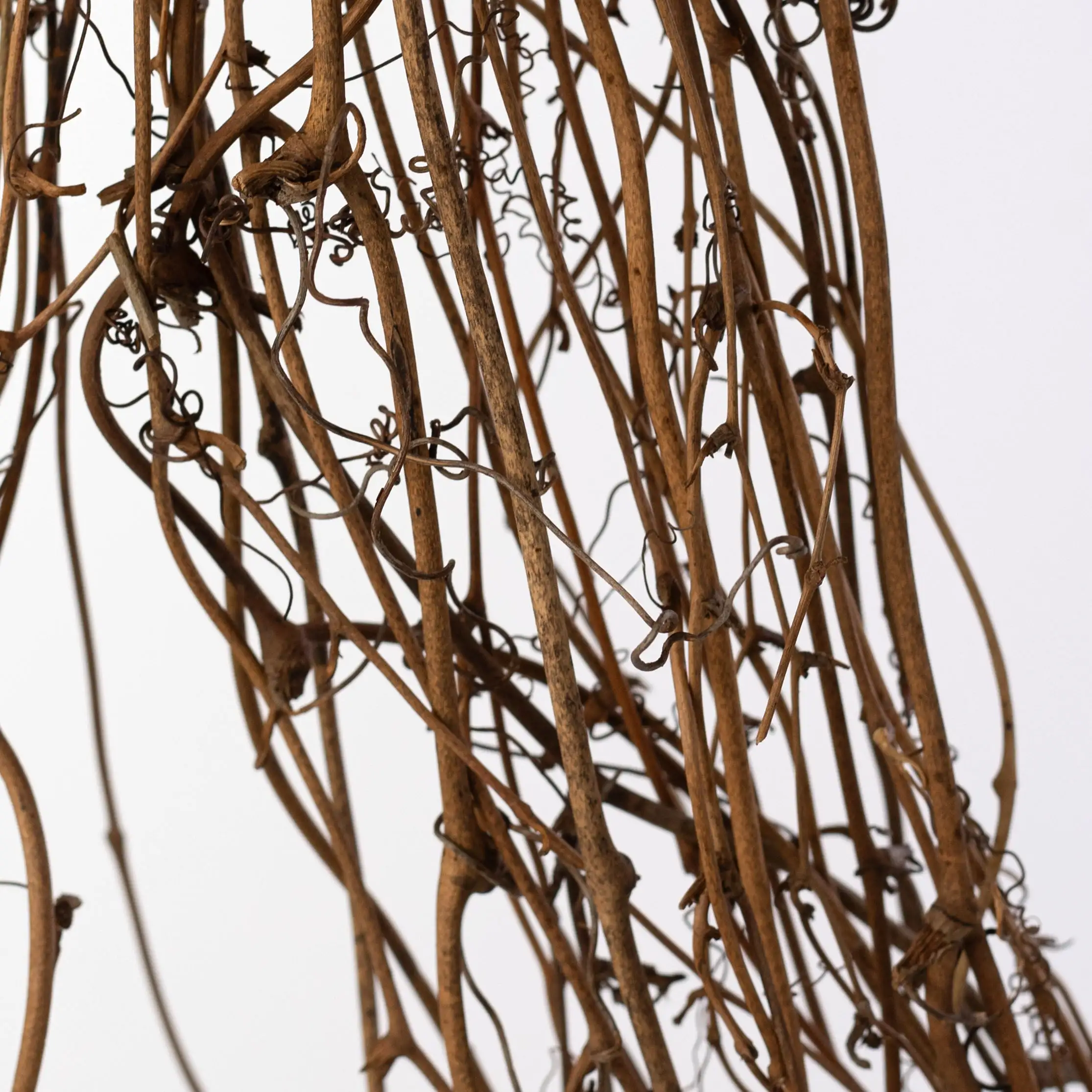 Angel vine or grape vine doesn't have to be in the shape of a wreath to be a pretty door accent. Here, we have the vines twisted into a single loop. The bundling of the twigs makes it a great for inserting floral sprays, while the intersection creates a natural place for a bow. Great for all seasons.