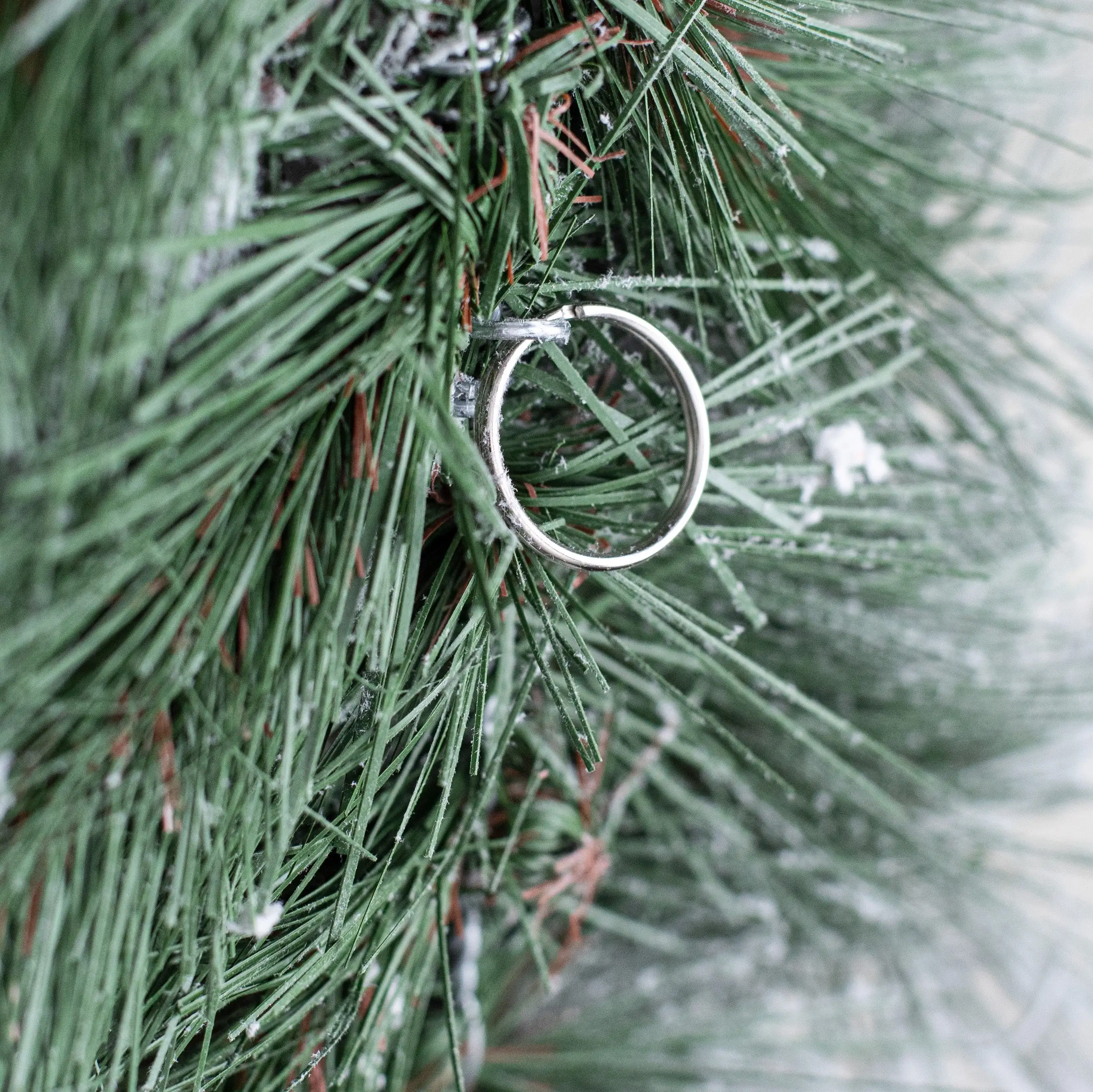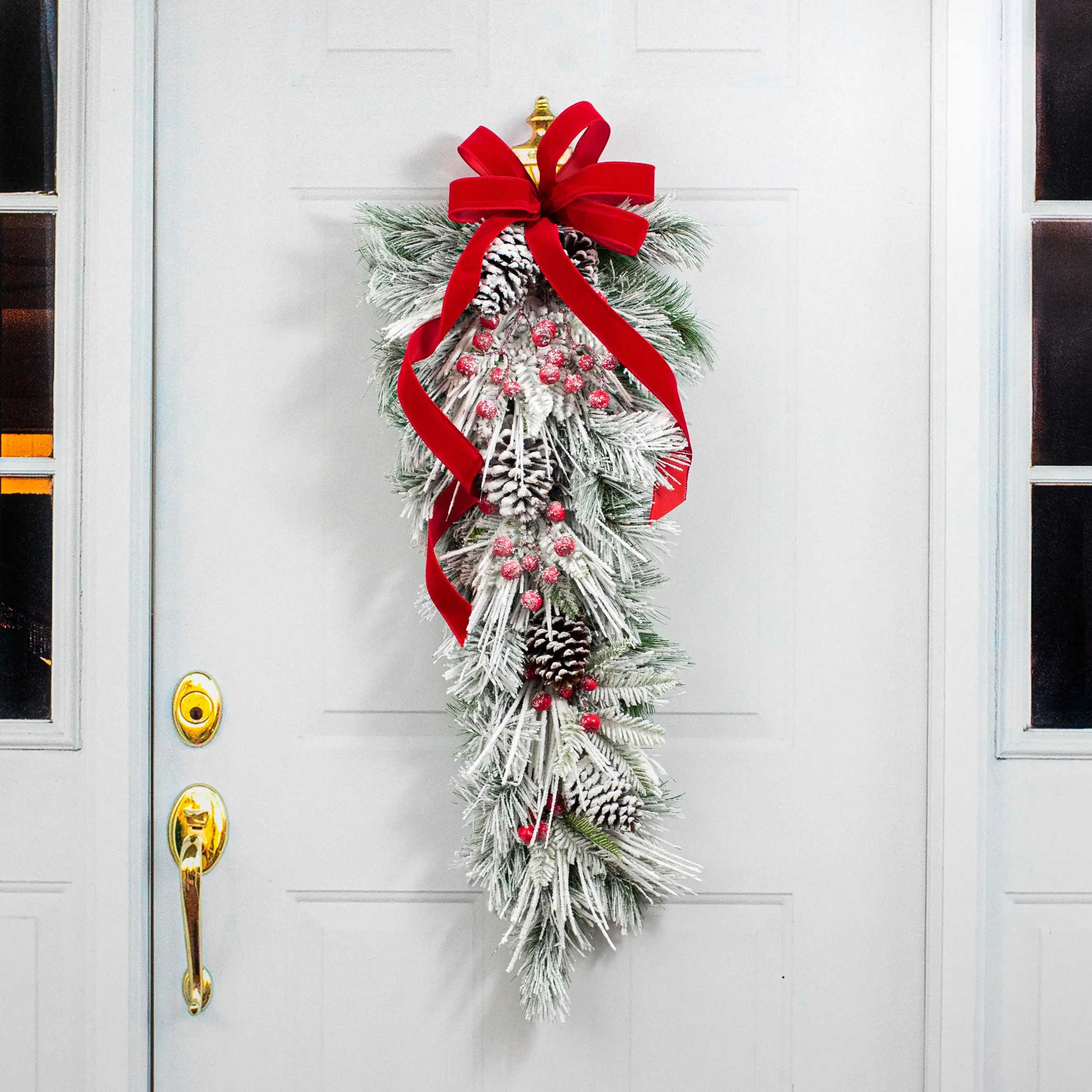 This teardrop swag is full and fluffy with three types of pine. The pine and accompanying large pinecones are heavily flocked with faux snow. Stems of bright red berries add pops of color and sparkle with a dusting of silver glitter. This teardrop looks great on a door, but it is flexible enough (and comes with attached hardware) for use as a mailbox swag.