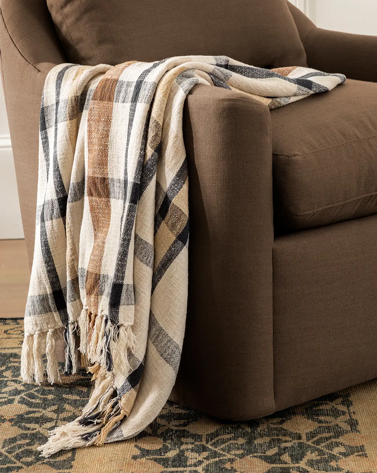 Made from 100% cotton, the Albright Plaid Throw is both beautiful and functional. Draped over a sofa for an added layer of texture, its navy and tan color palette finishes off your space with an effortless look and feel.